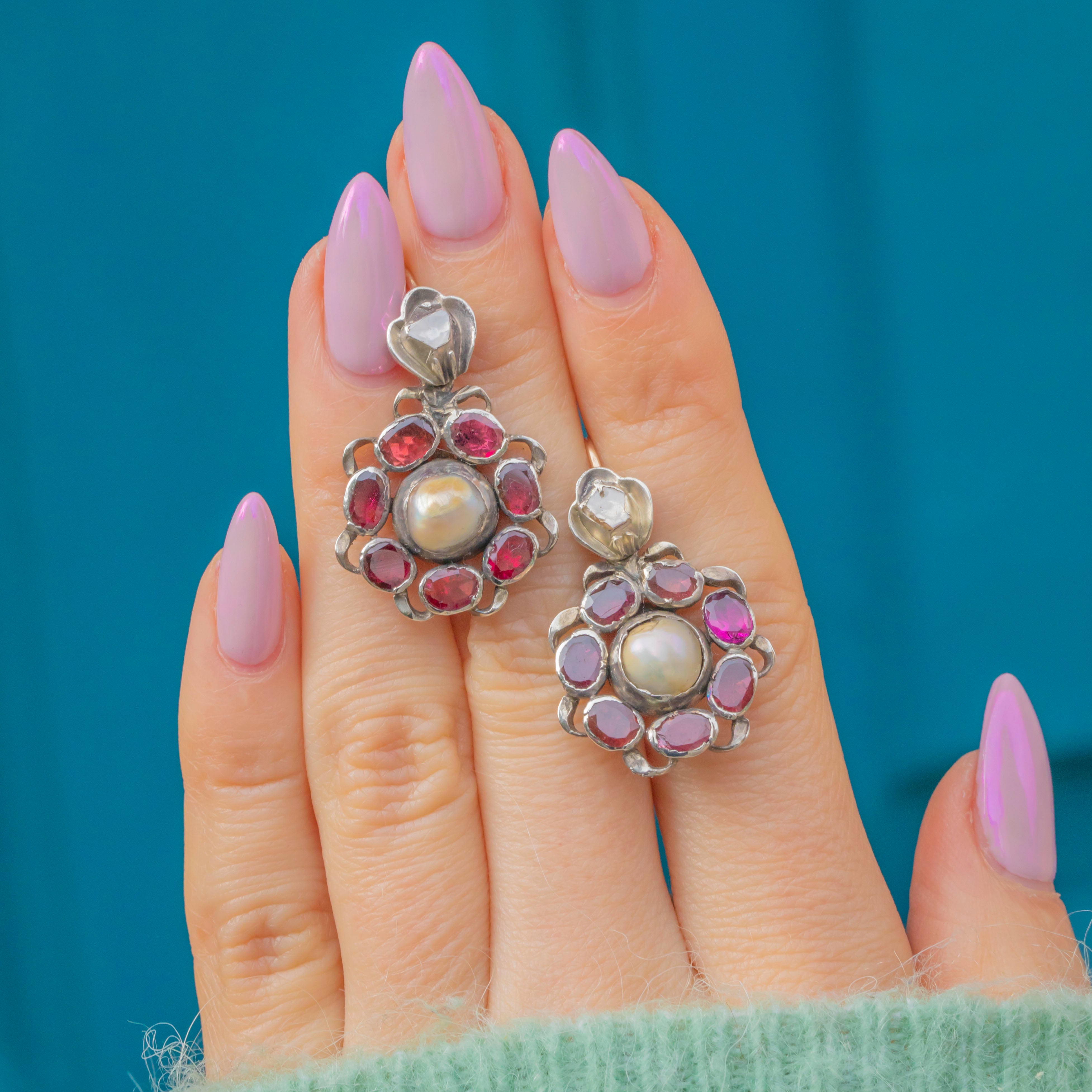 GOOD: The Pearls show visible wear and age, and the Silver displays surface wear consistent with their 18th-century origin. The Garnets and Diamonds are secure and retain strong colour and sparkle. A very rare and characterful pair of Georgian Iberian earrings.