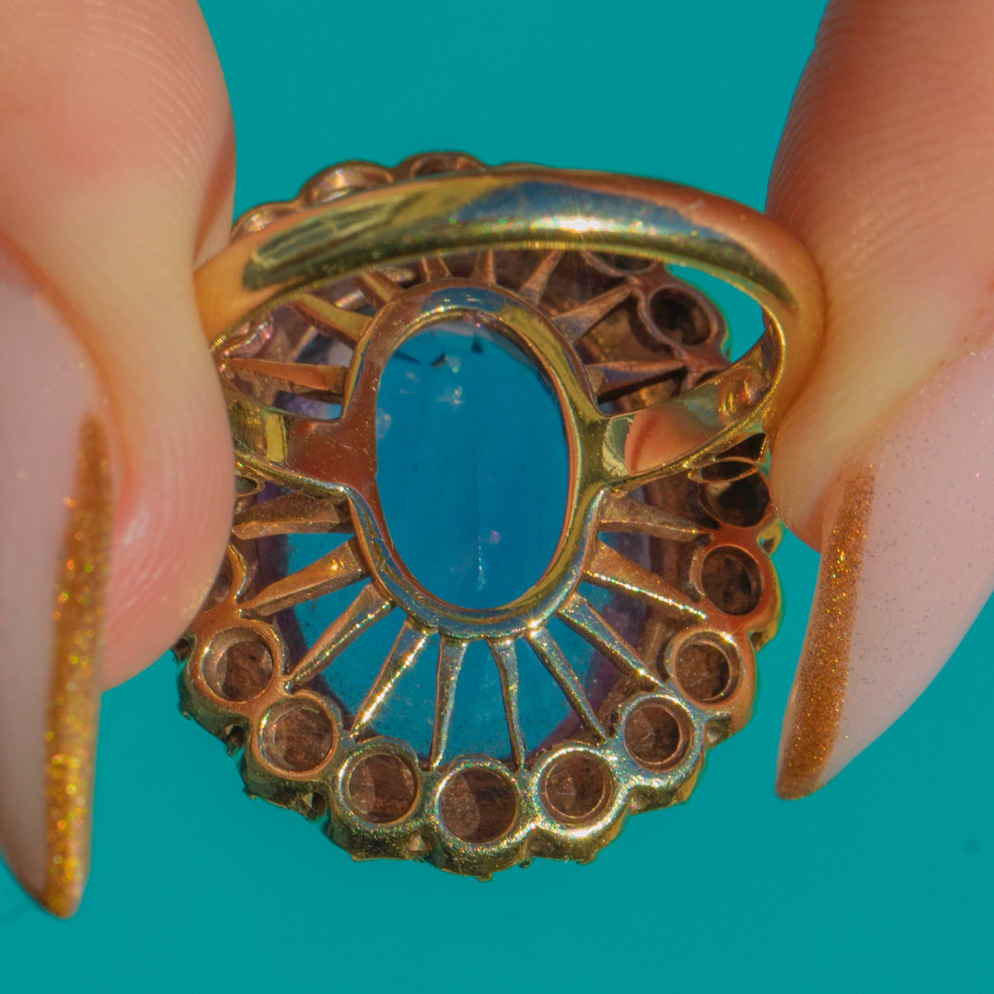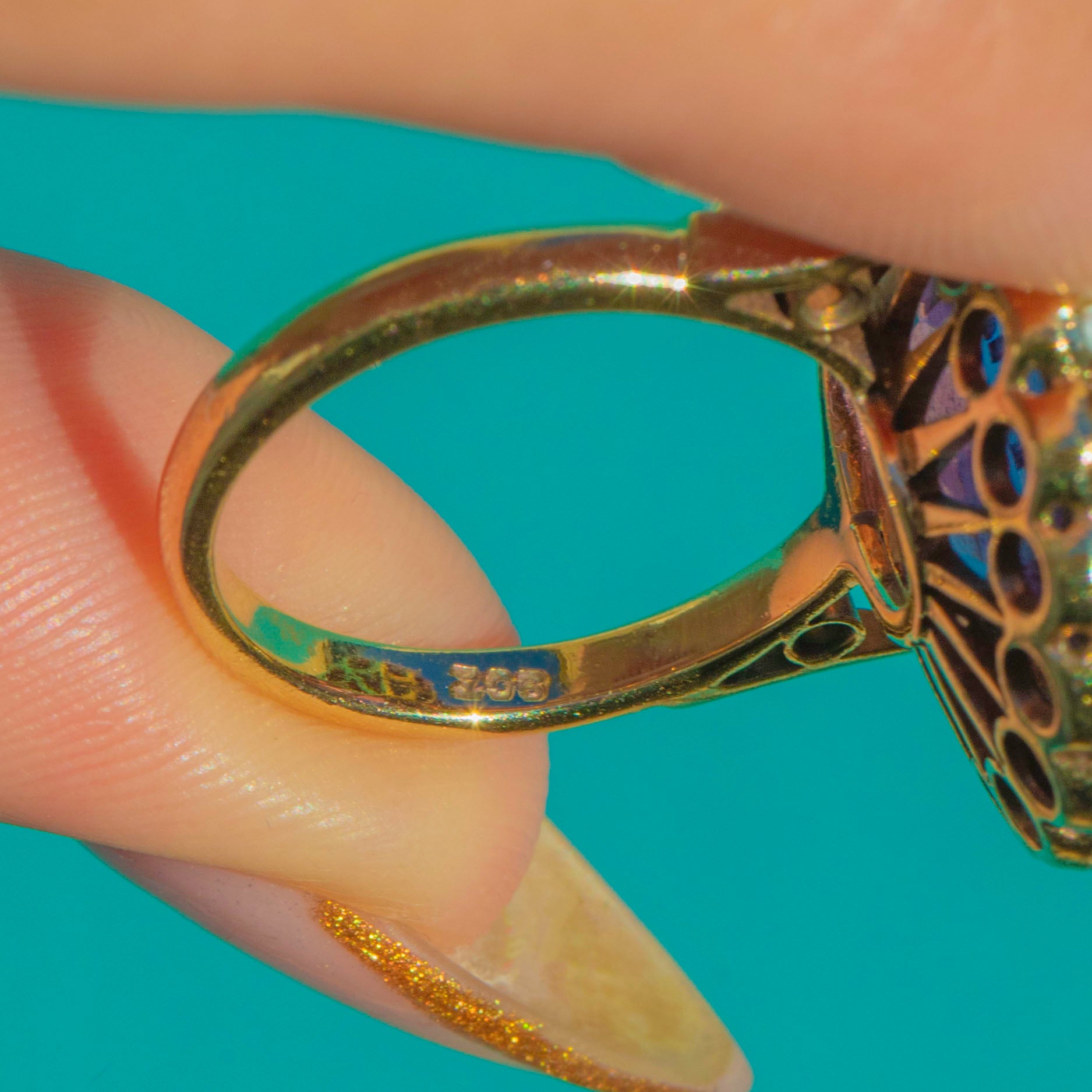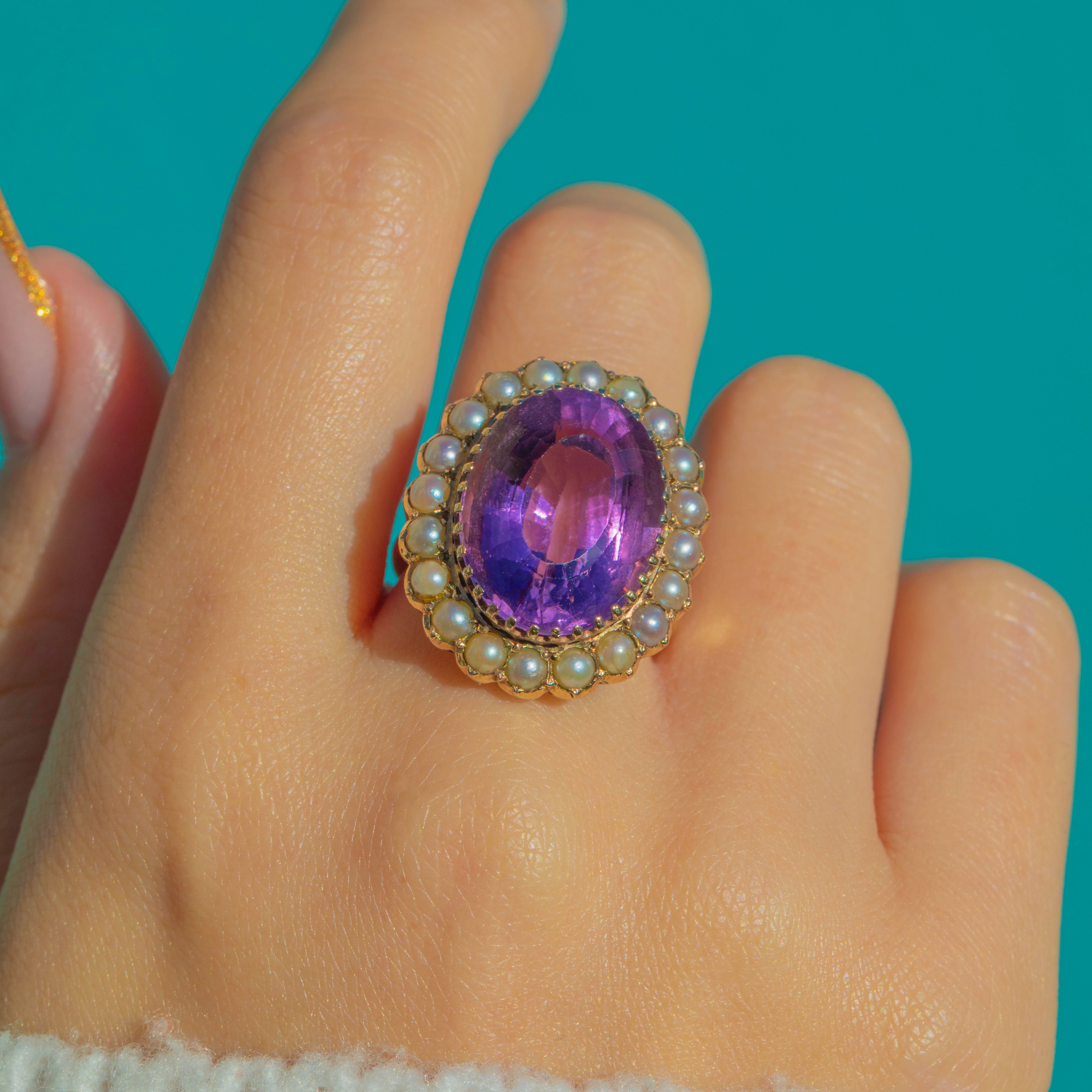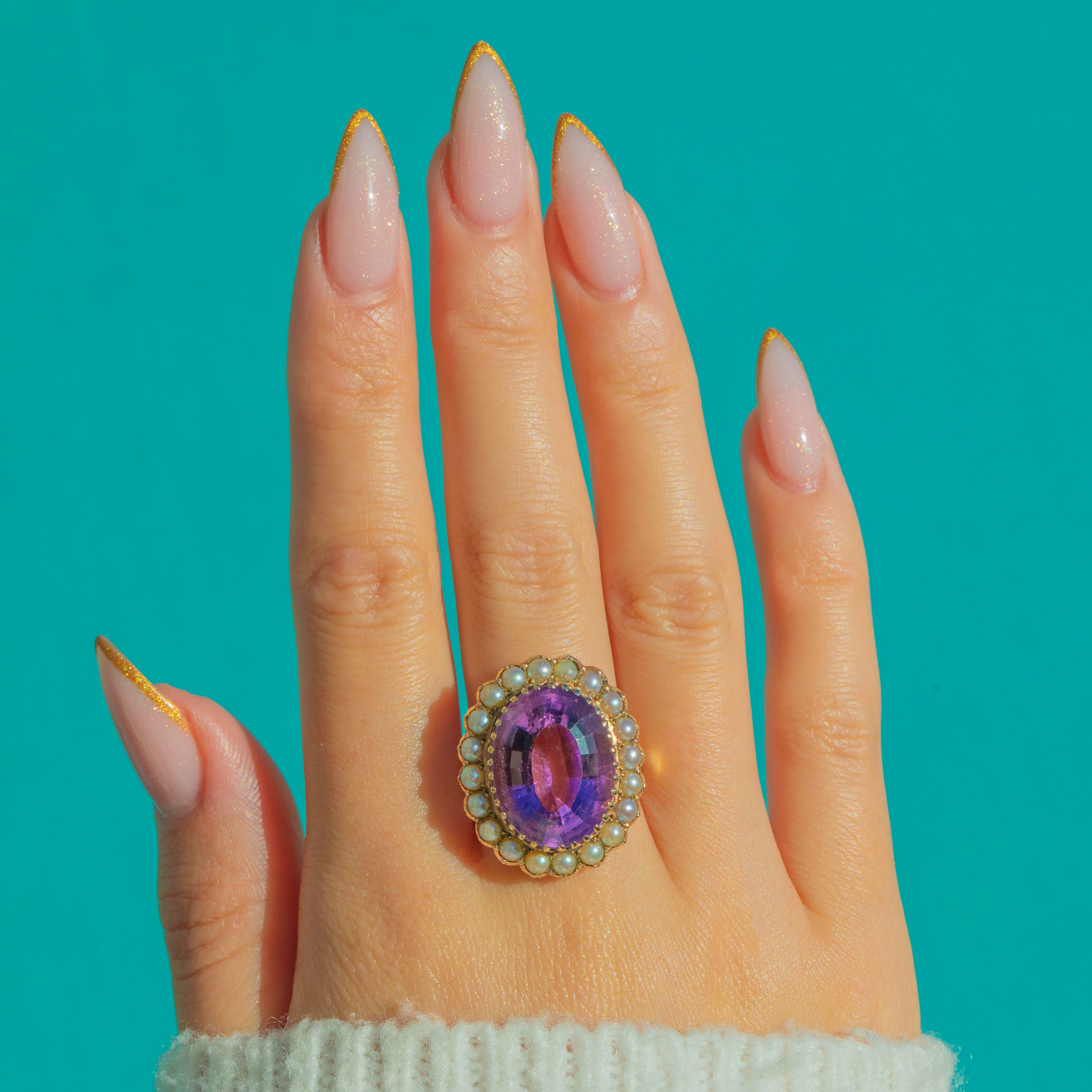 This impressive Mid-Century cluster ring is all about drama and colour. Crafted in warm 9ct Gold, it showcases a large, richly-hued Amethyst at the centre, its vivid purple tones framed beautifully by a halo of creamy Pearls. The bold oval head sits proudly on the finger, making this a fabulous statement cocktail ring for evenings out or glamorous occasions.
