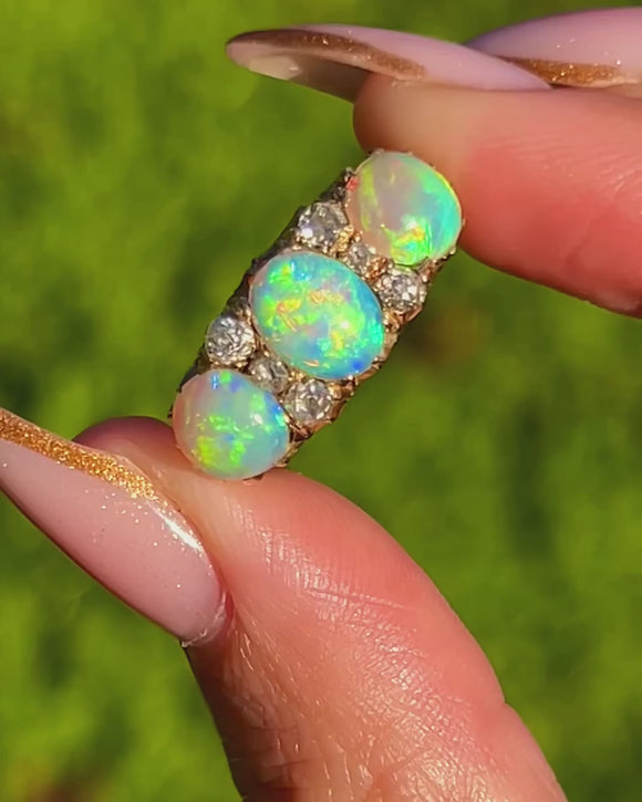 This impressive Victorian Opal and Diamond ring is a breathtaking example of late 19th-century craftsmanship. The three natural, solid Opals display exceptional colour play—flashes of green, blue, yellow and orange shimmer across their surfaces with every movement, creating a vivid, electric glow.