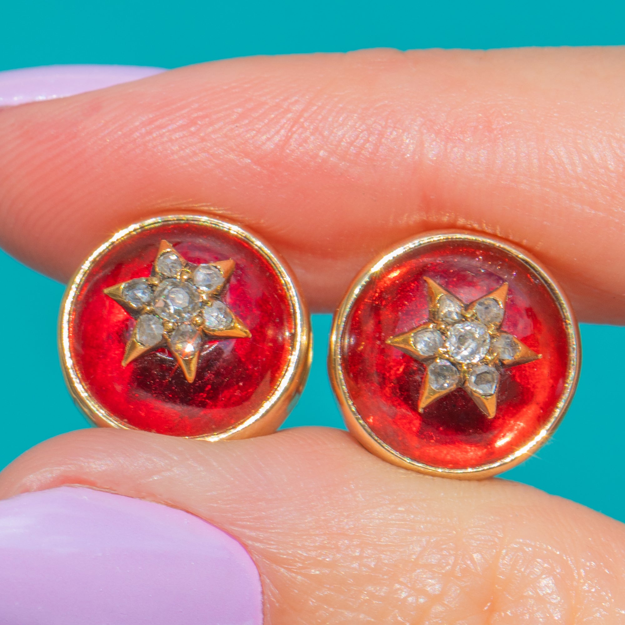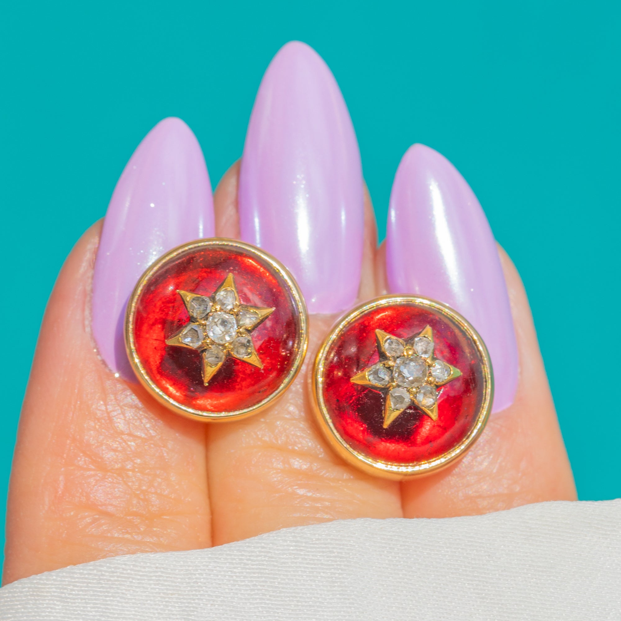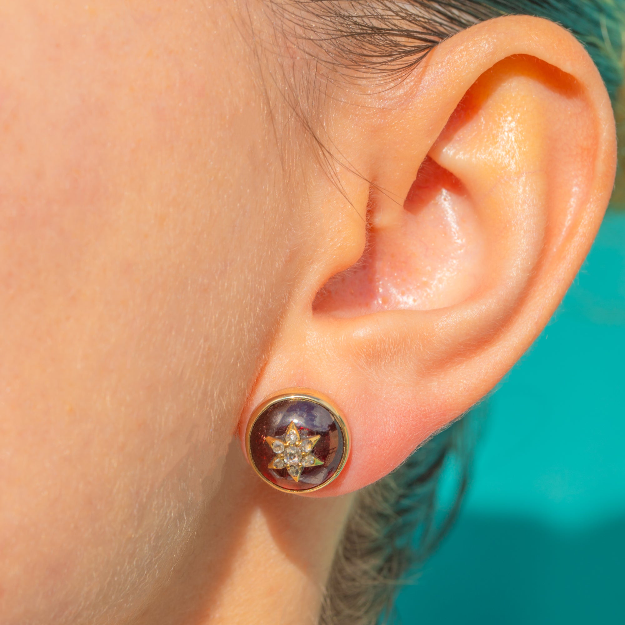 A shimmering celestial pair, these Victorian star earrings centre rich, domed Garnets crowned by a six-pointed star set with twinkling rose-cut Diamonds. The warm glow of 9ct Gold frames the juicy red cabochons beautifully, while the starburst brings a delicate sparkle that dances in the light.