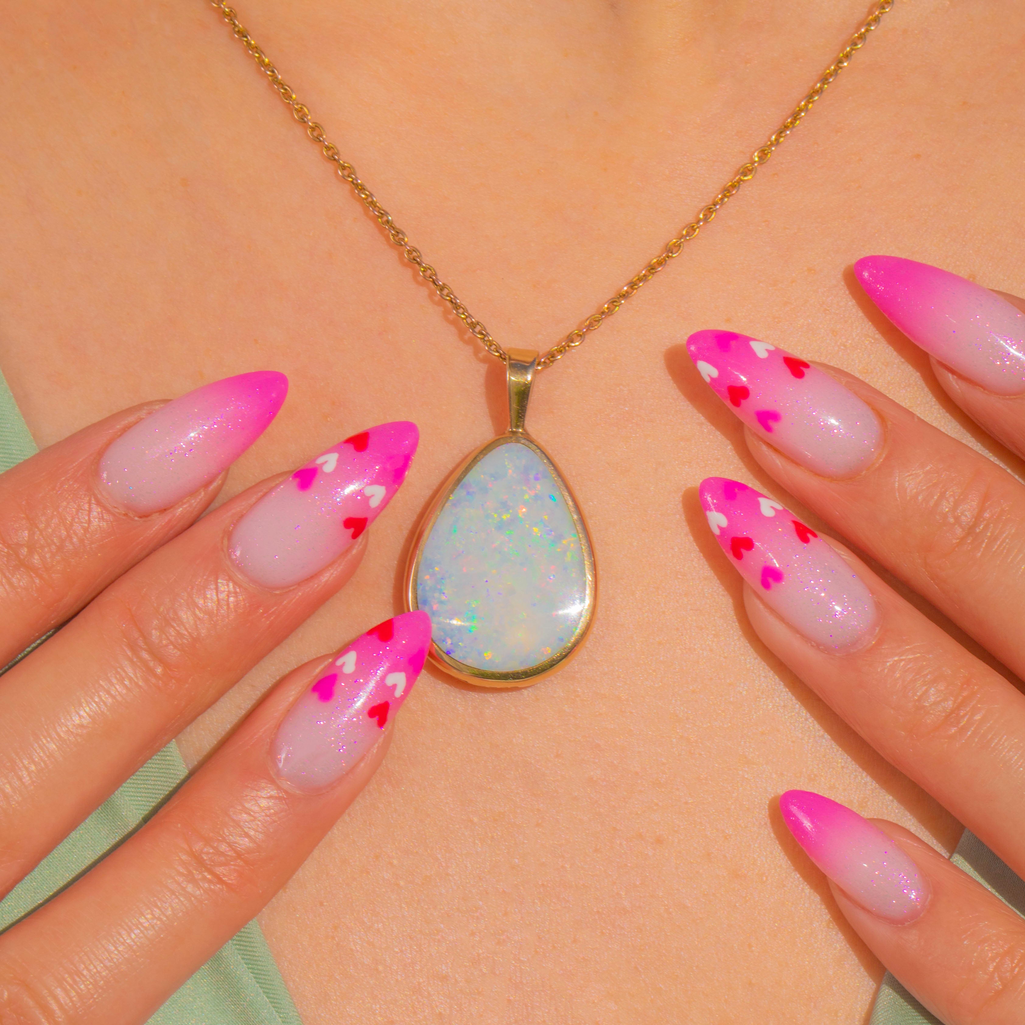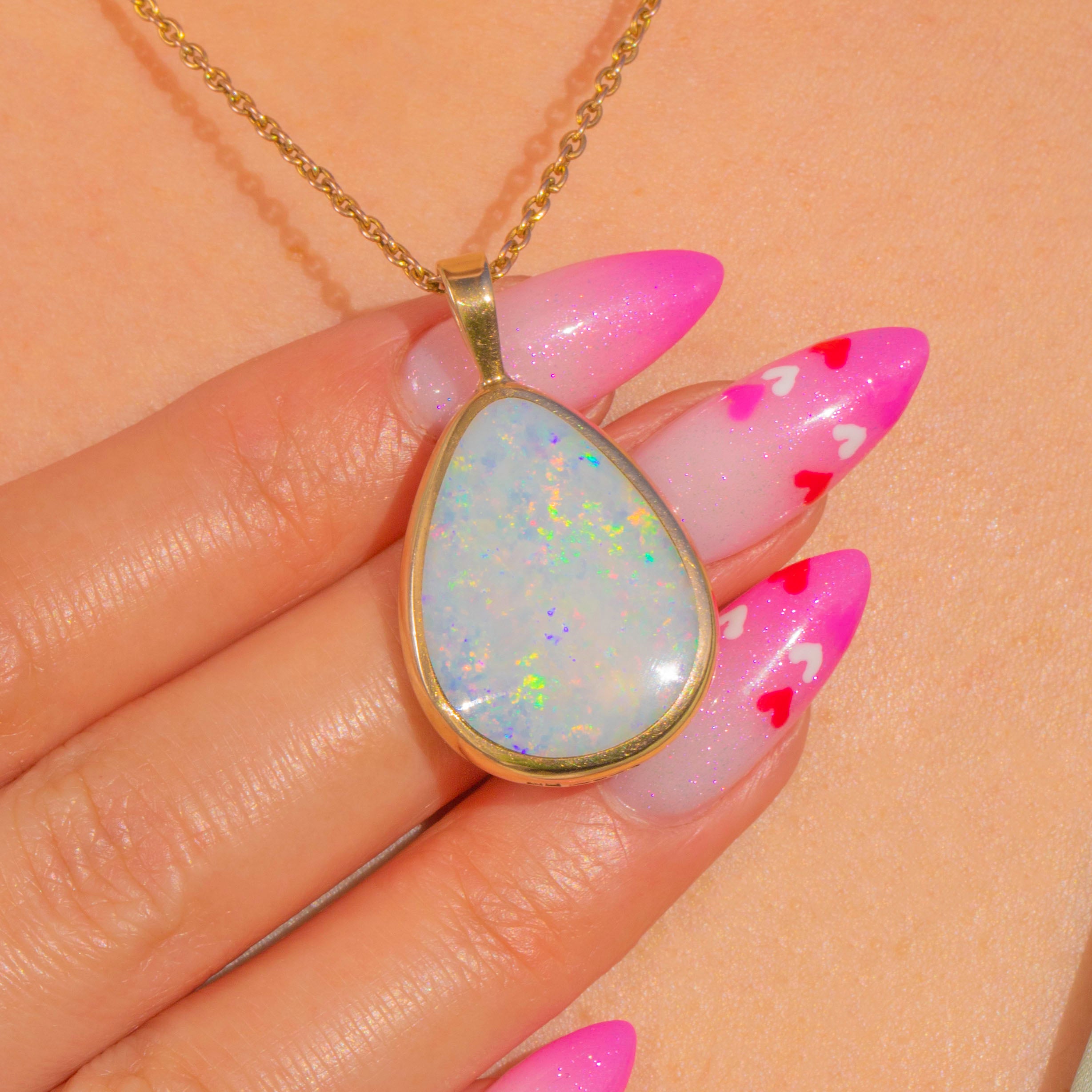 A luminous 5.25ct Opal takes centre stage in this elegant teardrop pendant, its milky body alive with vivid flashes of blue, green and orange, with occasional flickers of red and purple. Cut as a smooth domed cabochon, the gemstone is framed by a sleek bezel that traces its curves to perfection.