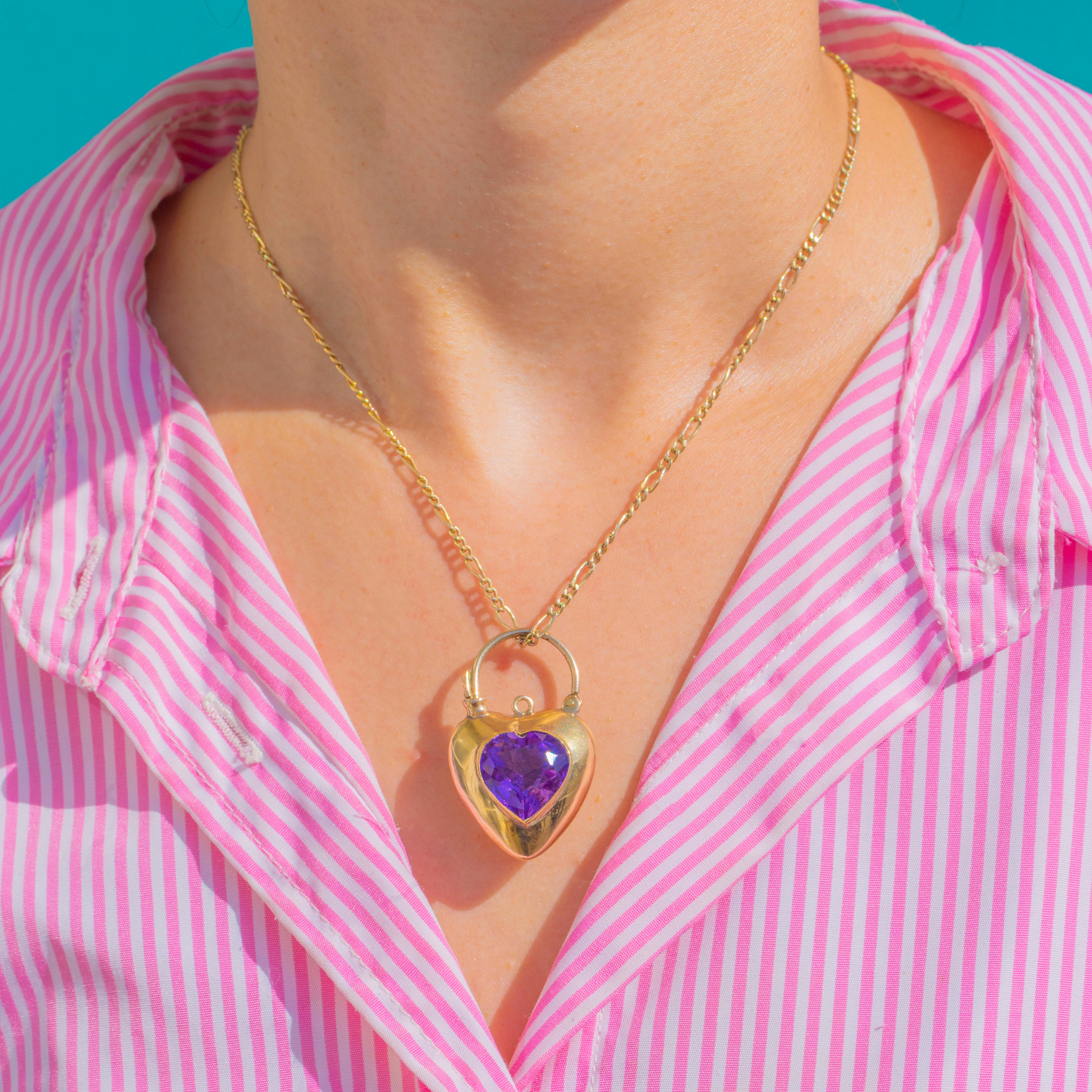 A romantic Victorian treasure, this heart padlock pendant is crafted in rich 15ct Gold and set with a sumptuous Amethyst in a smooth rub-over bezel. The voluptuous, high-polish heart is beautifully balanced by the vibrant purple glow of the gemstone, creating a striking play of colour and light.