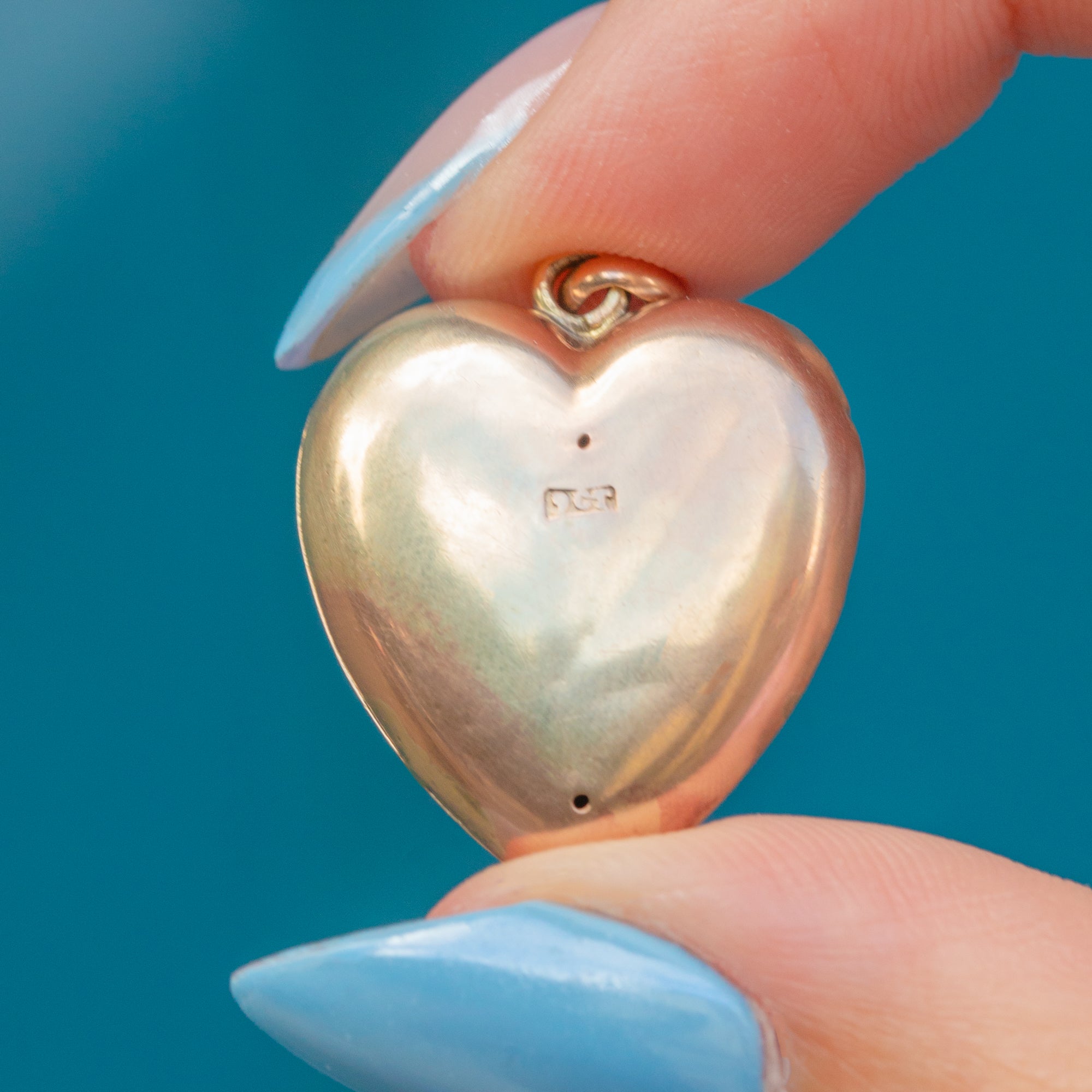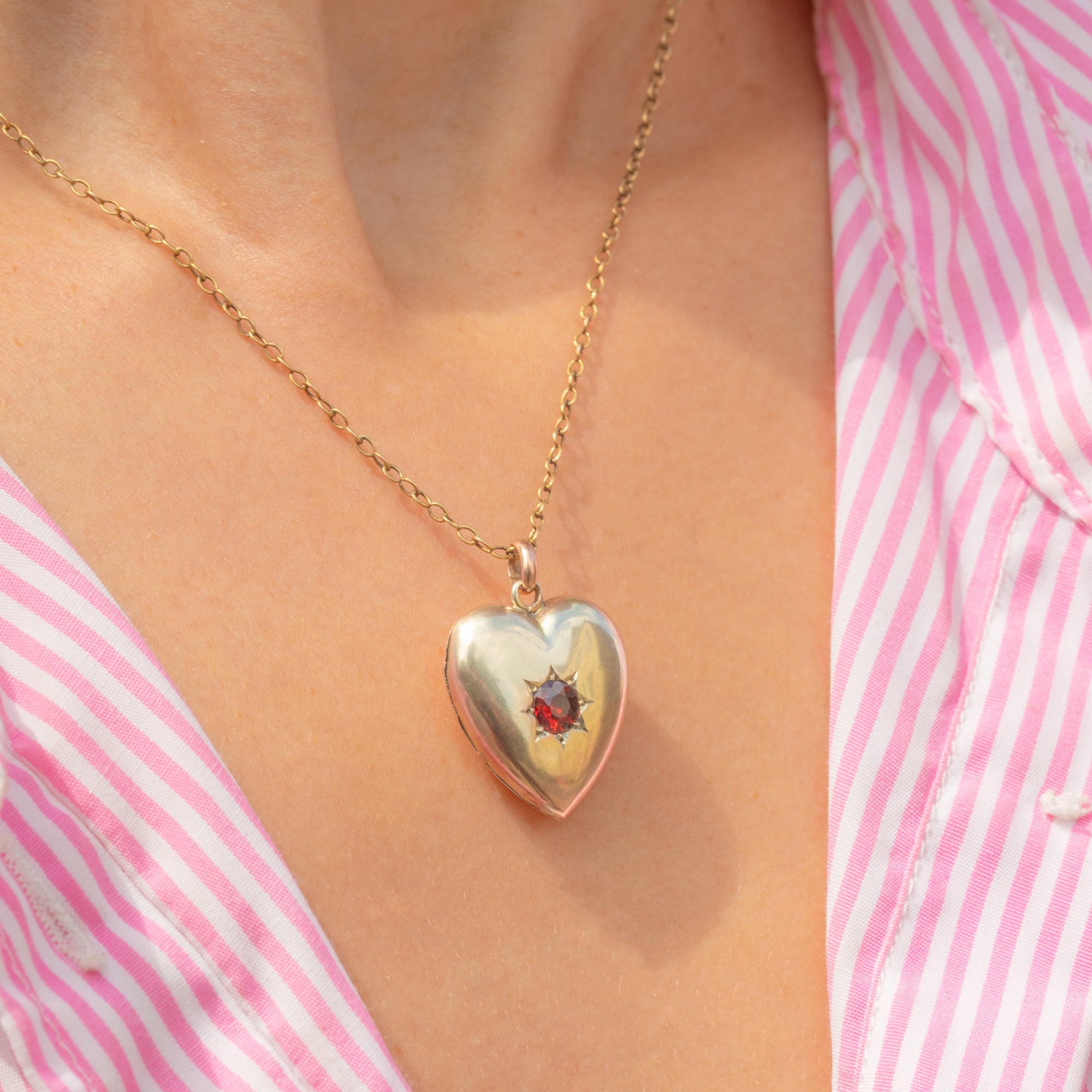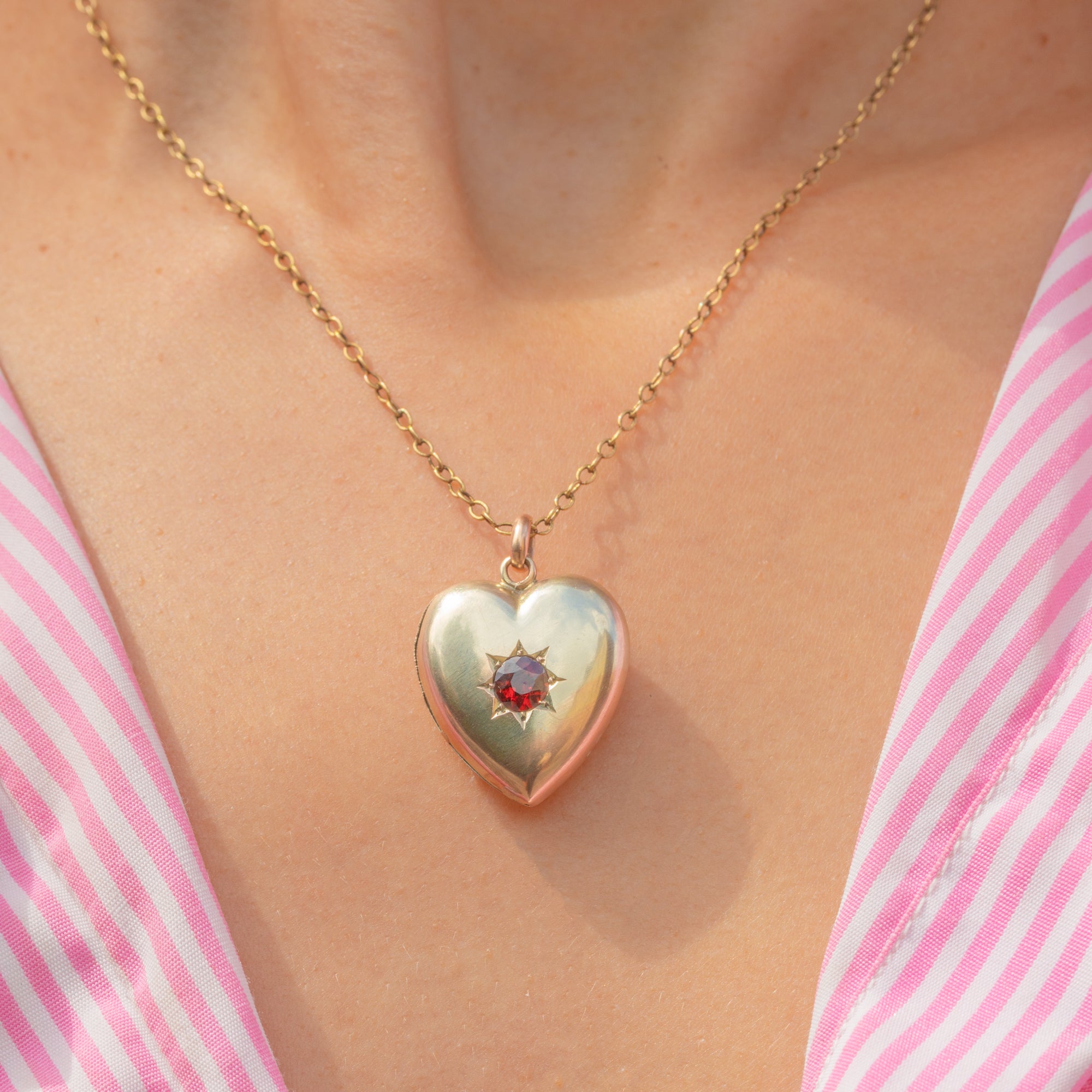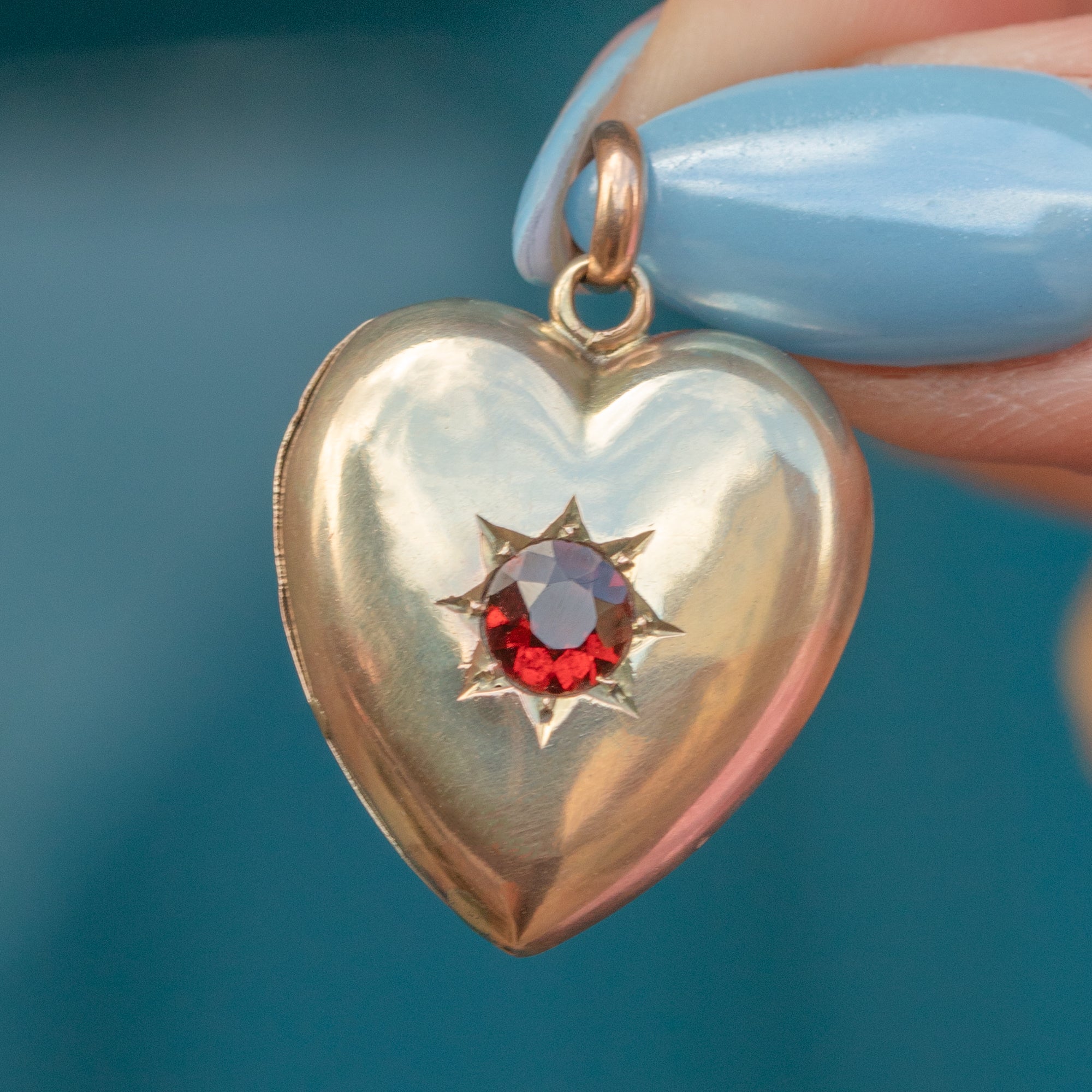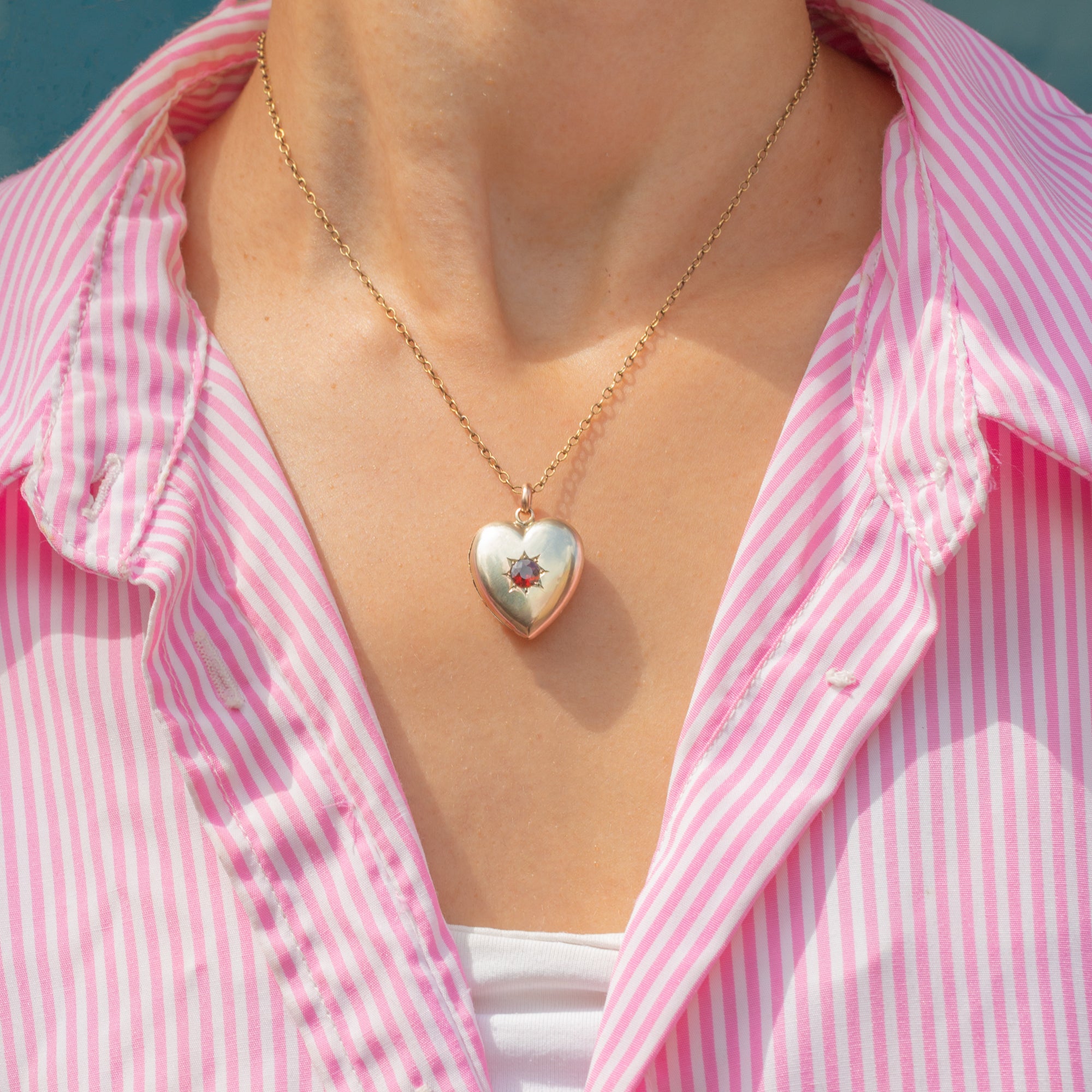VERY GOOD: The Gold is buttery with a highshine polish, and only minor discolouration on the back. The solder line around the edge of the pendant has split slightly in areas, but the pendant remains structurally sound - we'd recommend wearing it with care. The Garnet is securely set and free from chips or abrasions. With a securely soldered jump ring, you can enjoy wearing this antique heart charm with utmost confidence!
