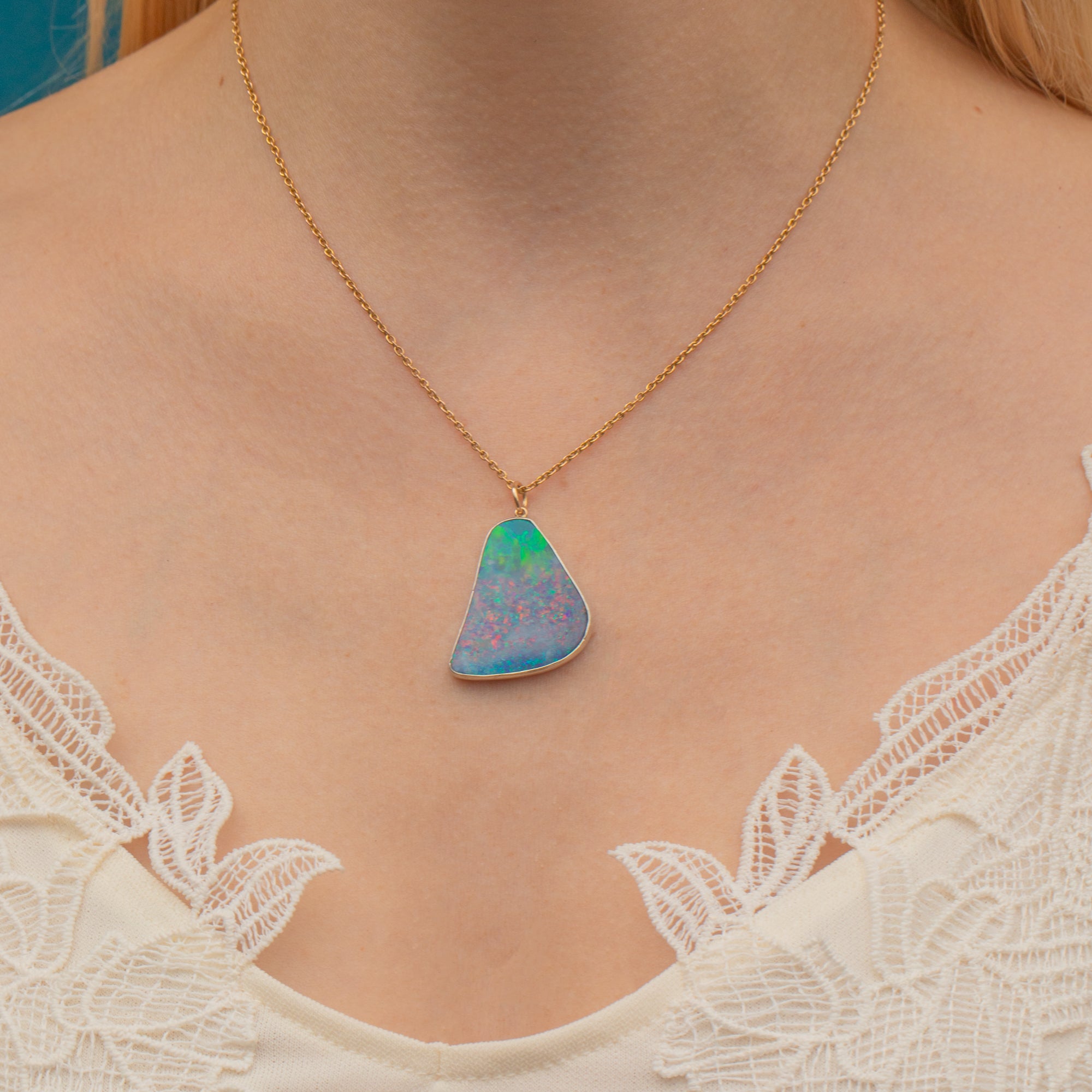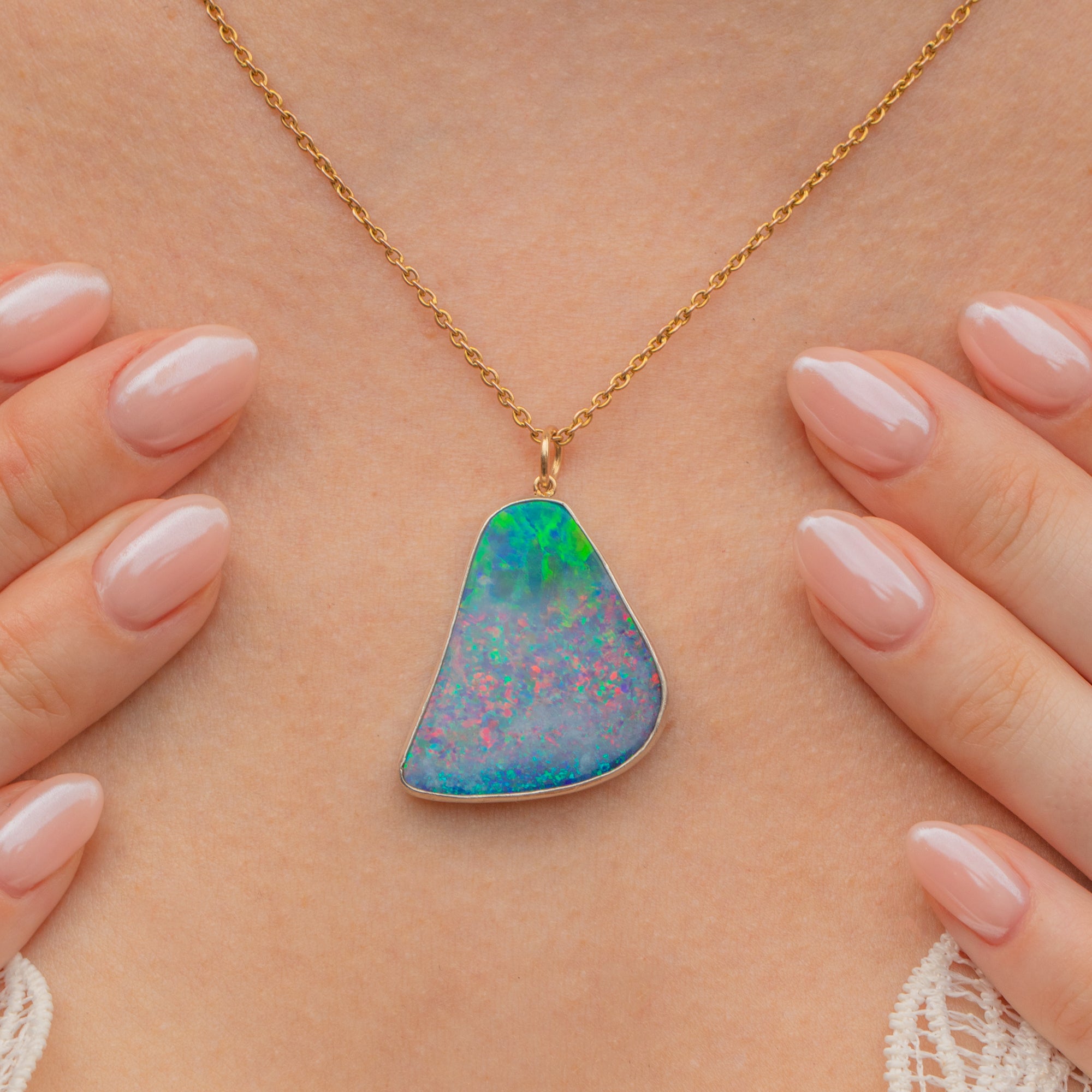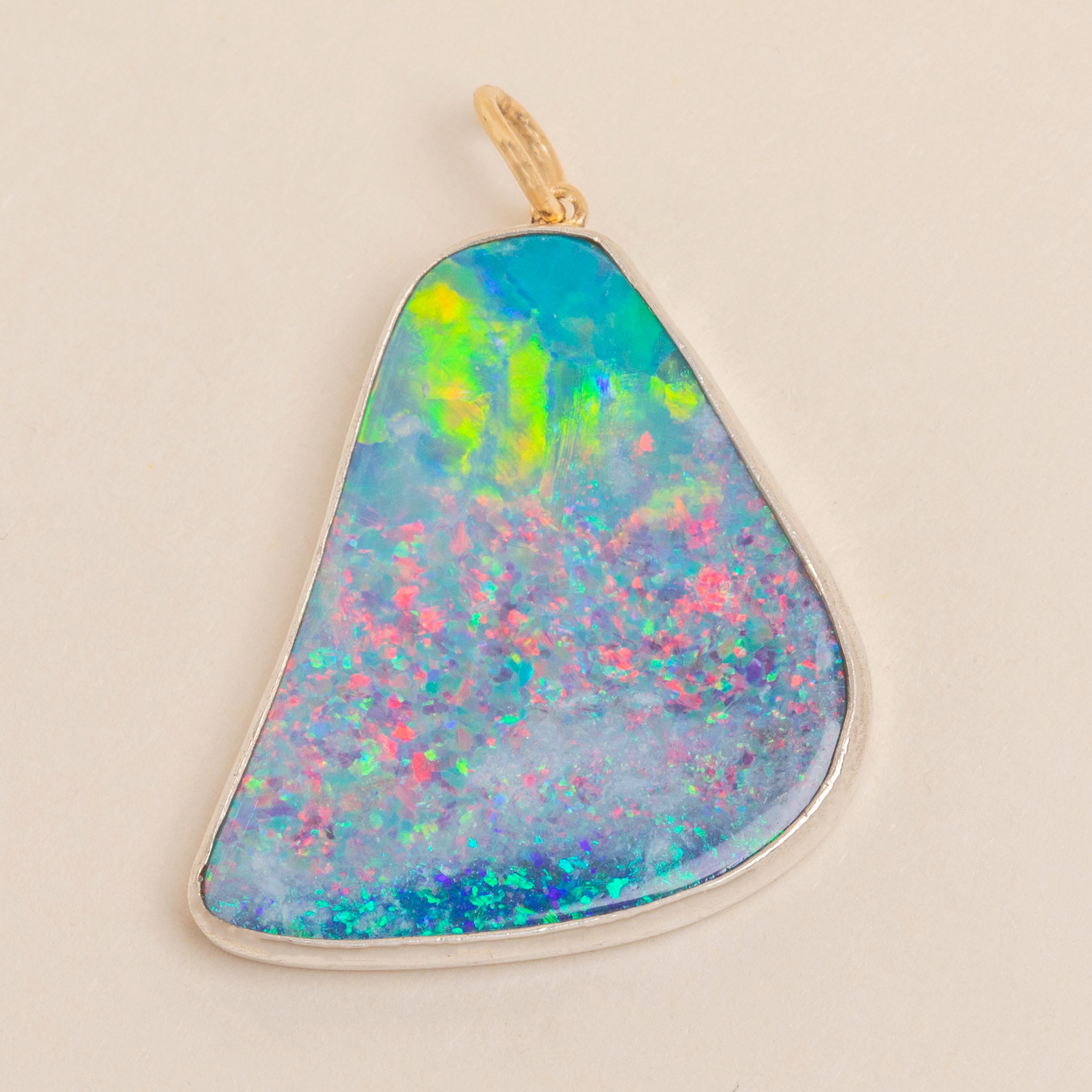 This Large Confetti Silver Opal Pendant is an eruption of colour! Like a burst of confetti, vivid flashes of hot pinks, electric blue, and lime green, you'll easily get lost in her iridescent depths.