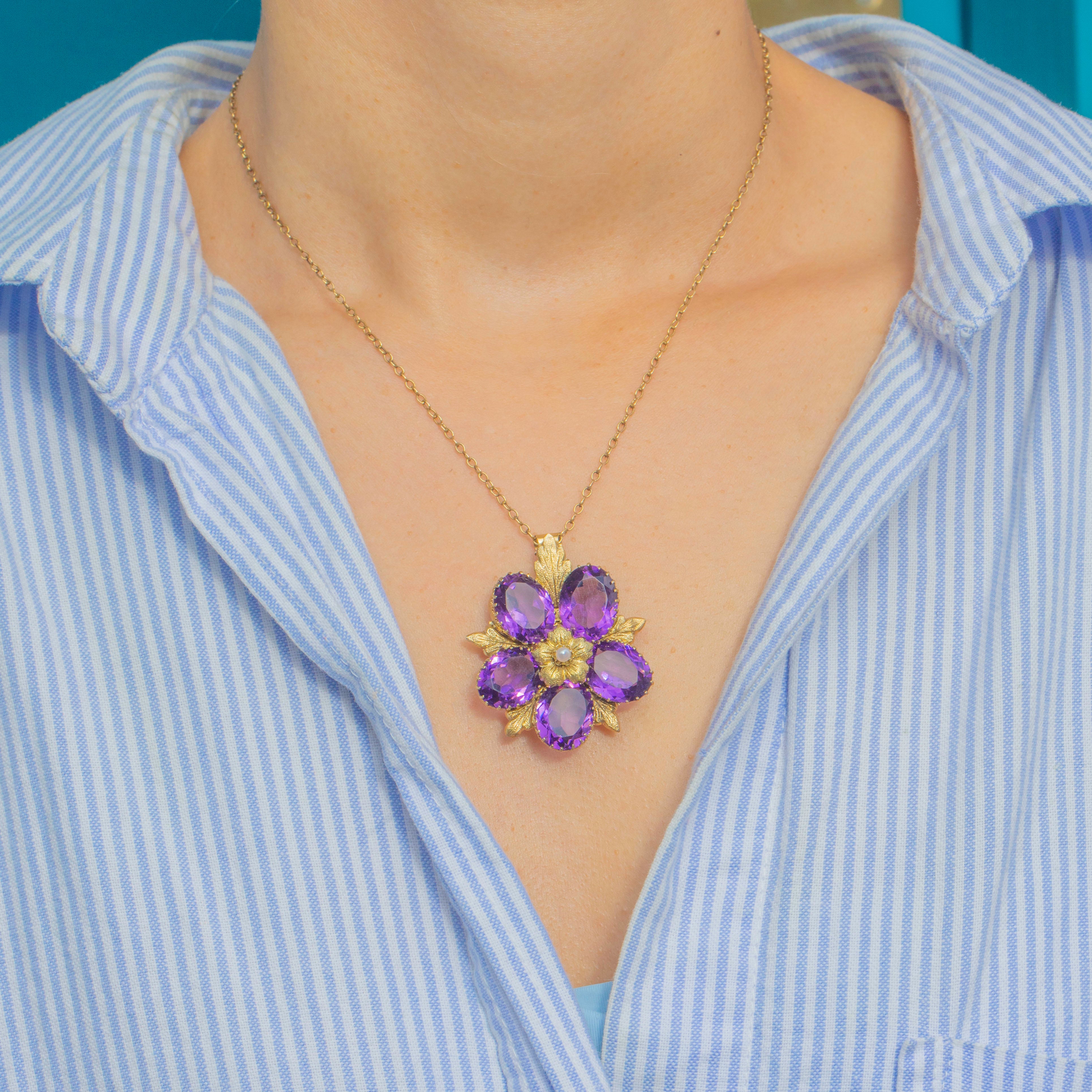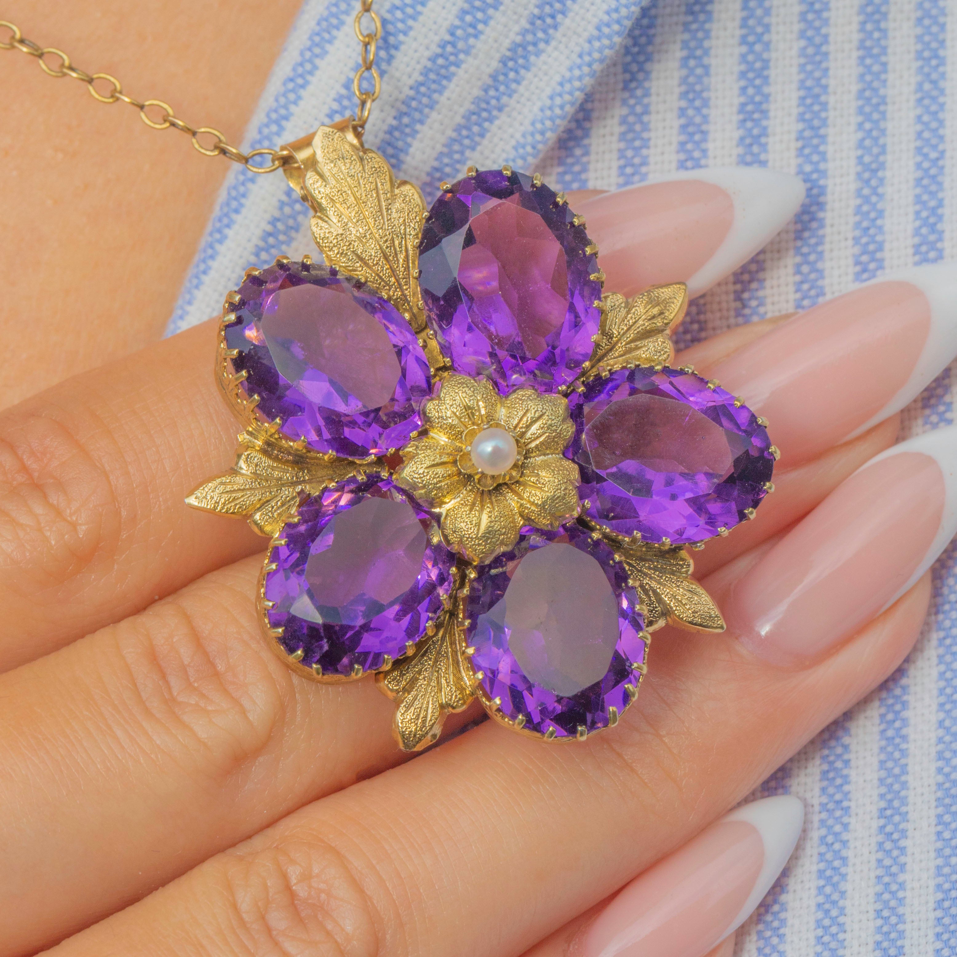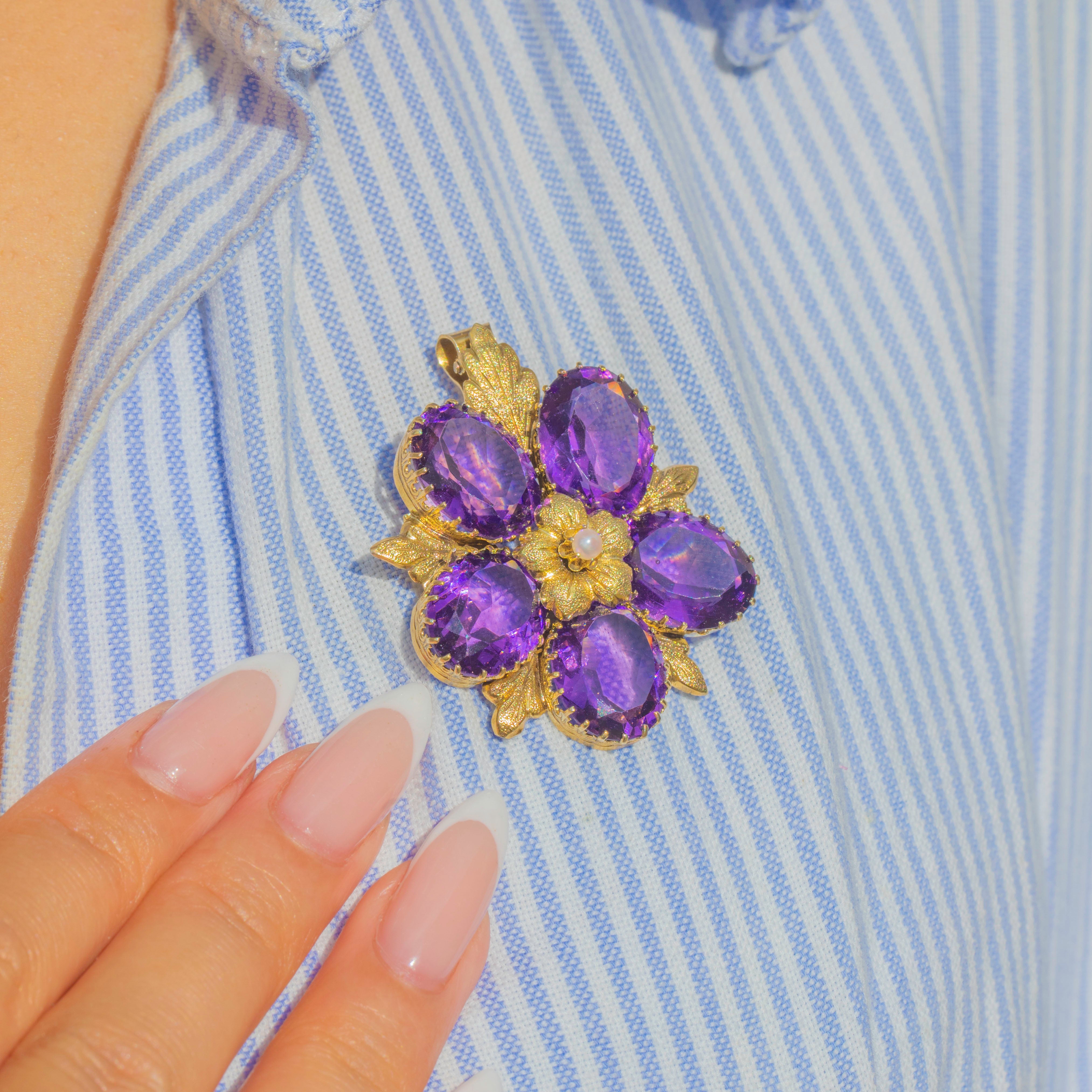 A sumptuous Victorian pendant-brooch, crafted into a striking floral cluster of deep, faceted Amethysts around a shimmering natural Pearl. The five oval Amethysts sit in textured, leaf borders over a Sterling Silver frame that has been richly gilded with 18ct Gold to give the piece the warm, burnished look. The piece comes complete with brooch fittings so it wears beautifully as a pendant on a chain or pinned to a lapel.