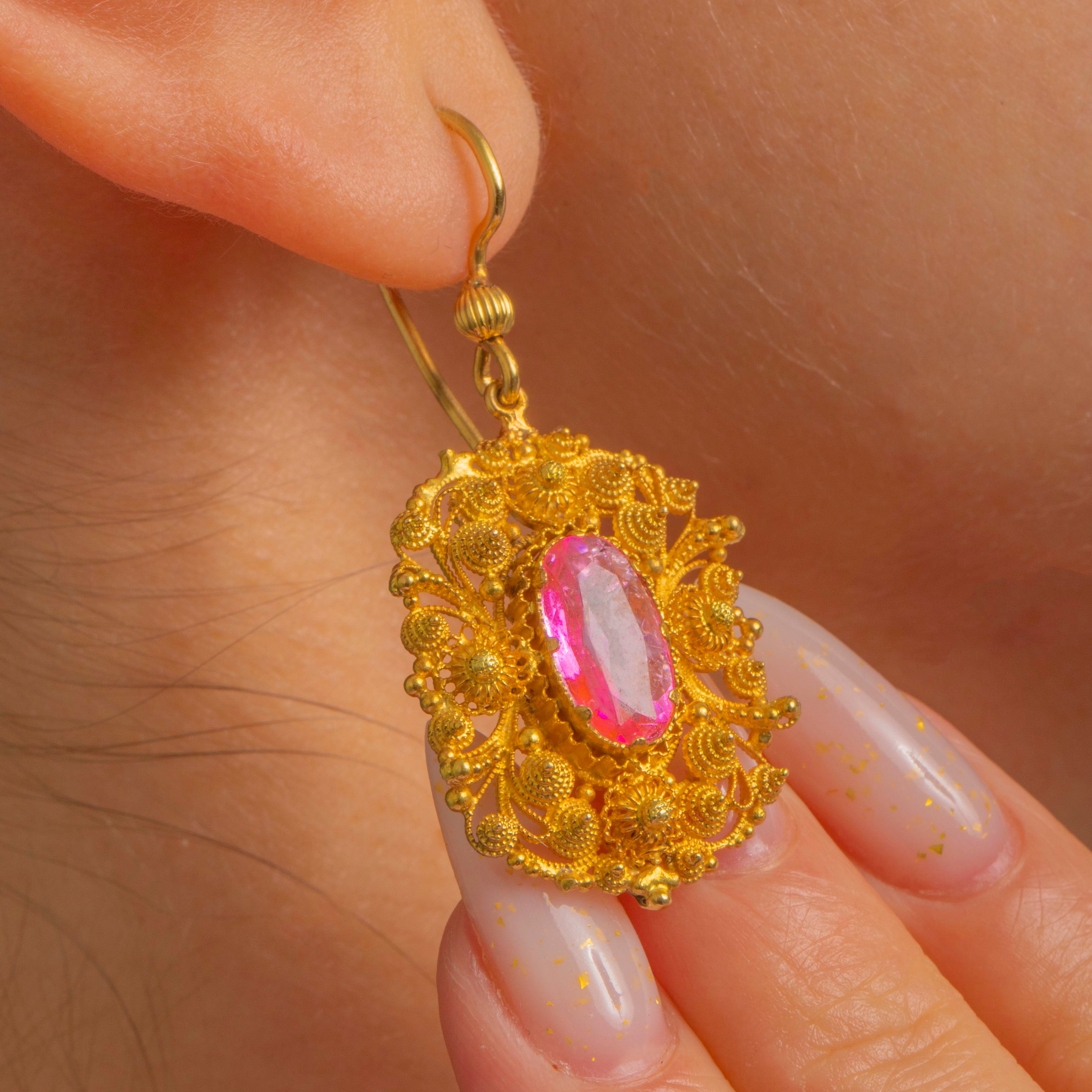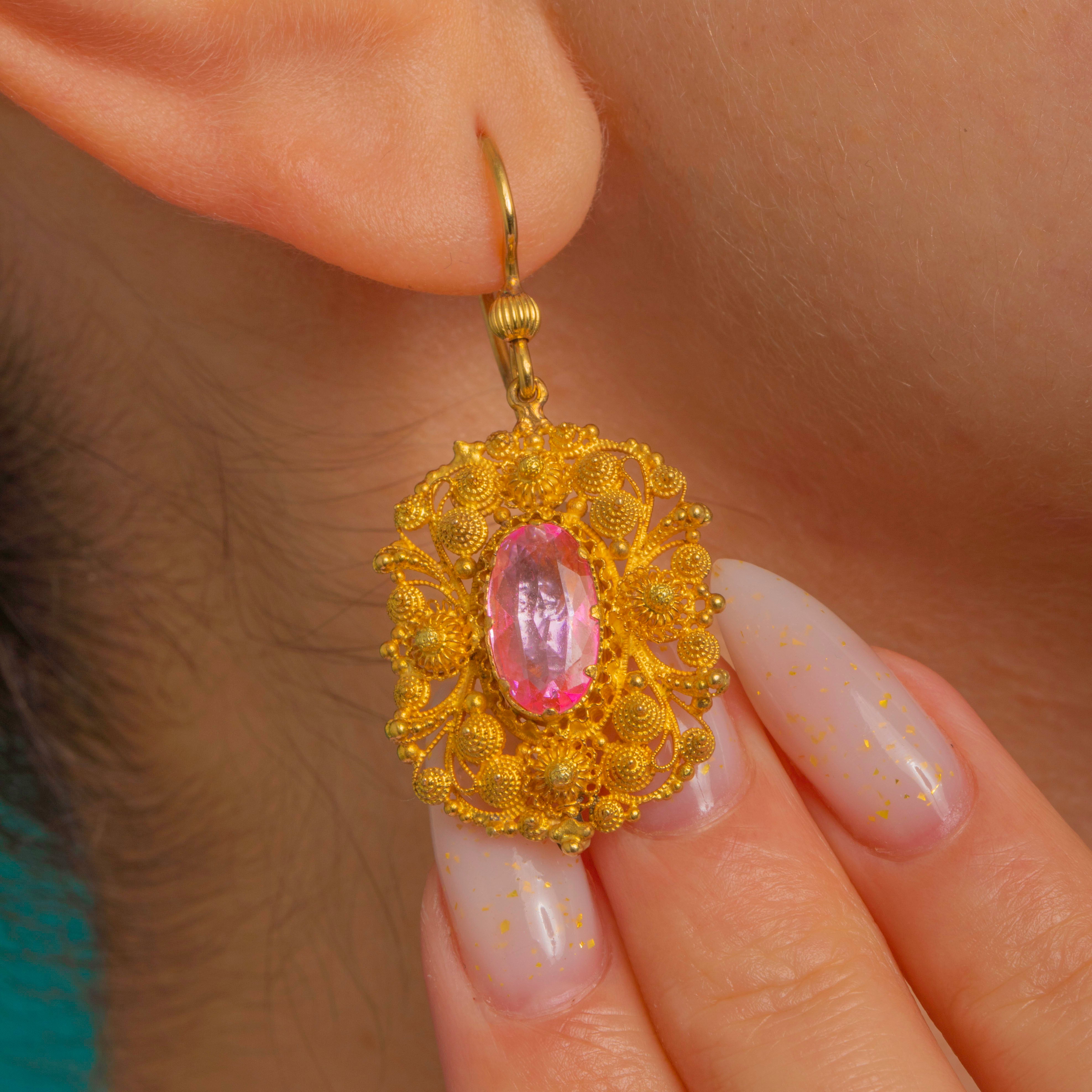 EXCELLENT: The Pink Topaz are bright with minor facet wear commensurate with age, visible under magnification. The cannetille Goldwork is crisp and intact with a gentle, age-appropriate patina; all applied wire and rosette details present and secure. Hooks are robust and function perfectly, with no visible repairs.