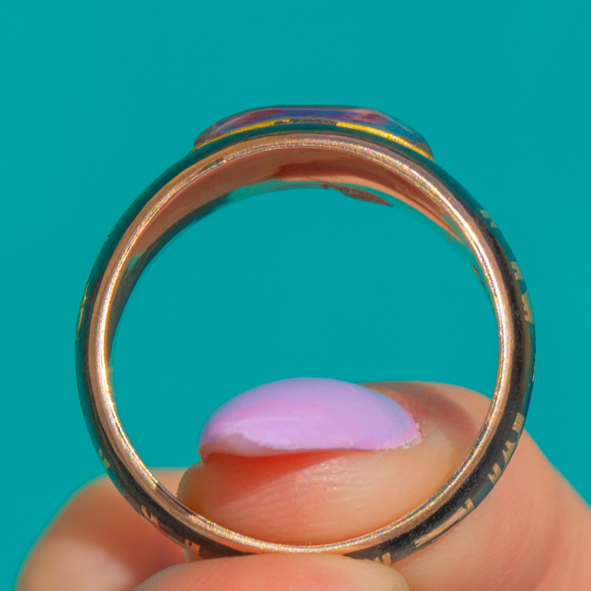A beautifully preserved late Georgian “In Memory Of” ring, crafted in 9ct Gold with inky Black Enamel and a luminous foiled Amethyst. The slim, elongated Amethyst shimmers with depth thanks to its closed, foiled setting, while the glossy black Enamel and tapering Gold band lend a refined, contemplative elegance.