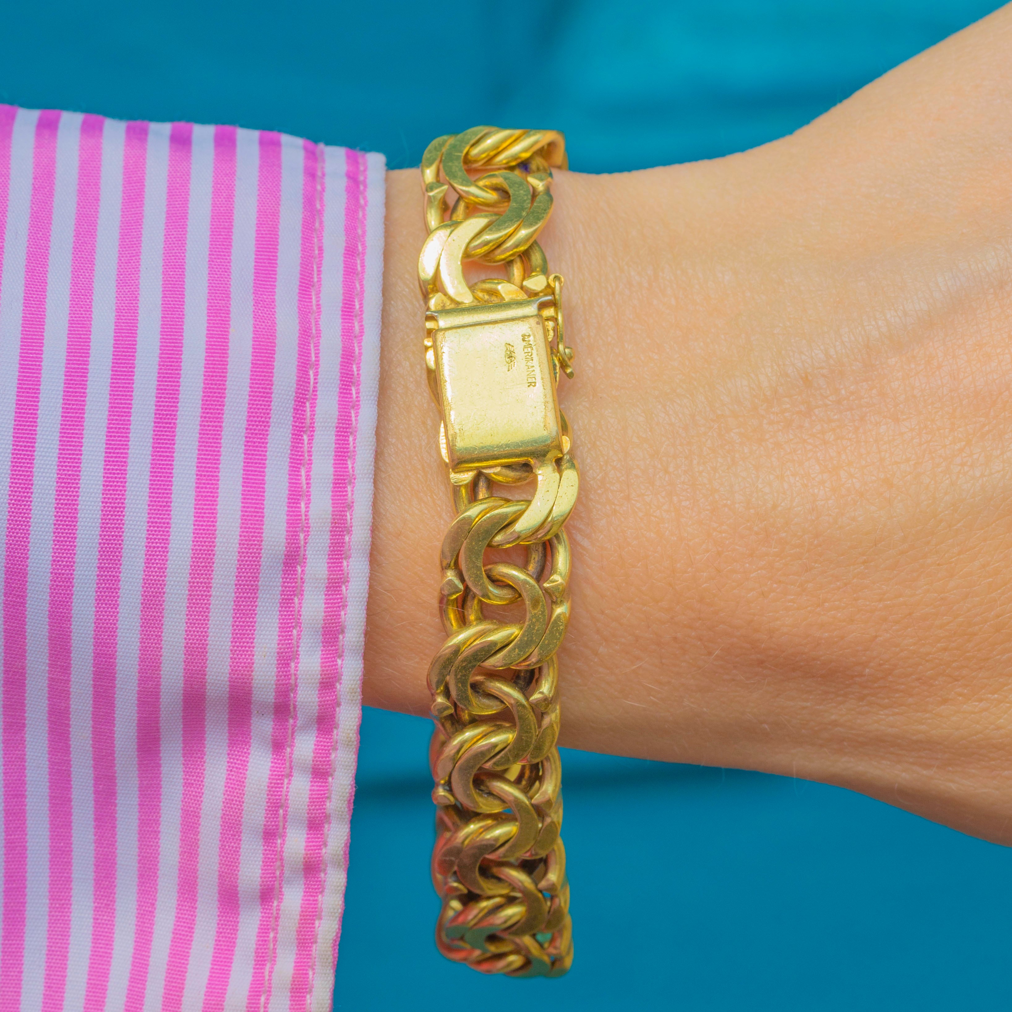 Bring a statement to your repertoire with this vintage Gold filled bracelet! The 8" length is formed from neatly connecting curved links, with lightly faceted edges that catch the light beautifully.