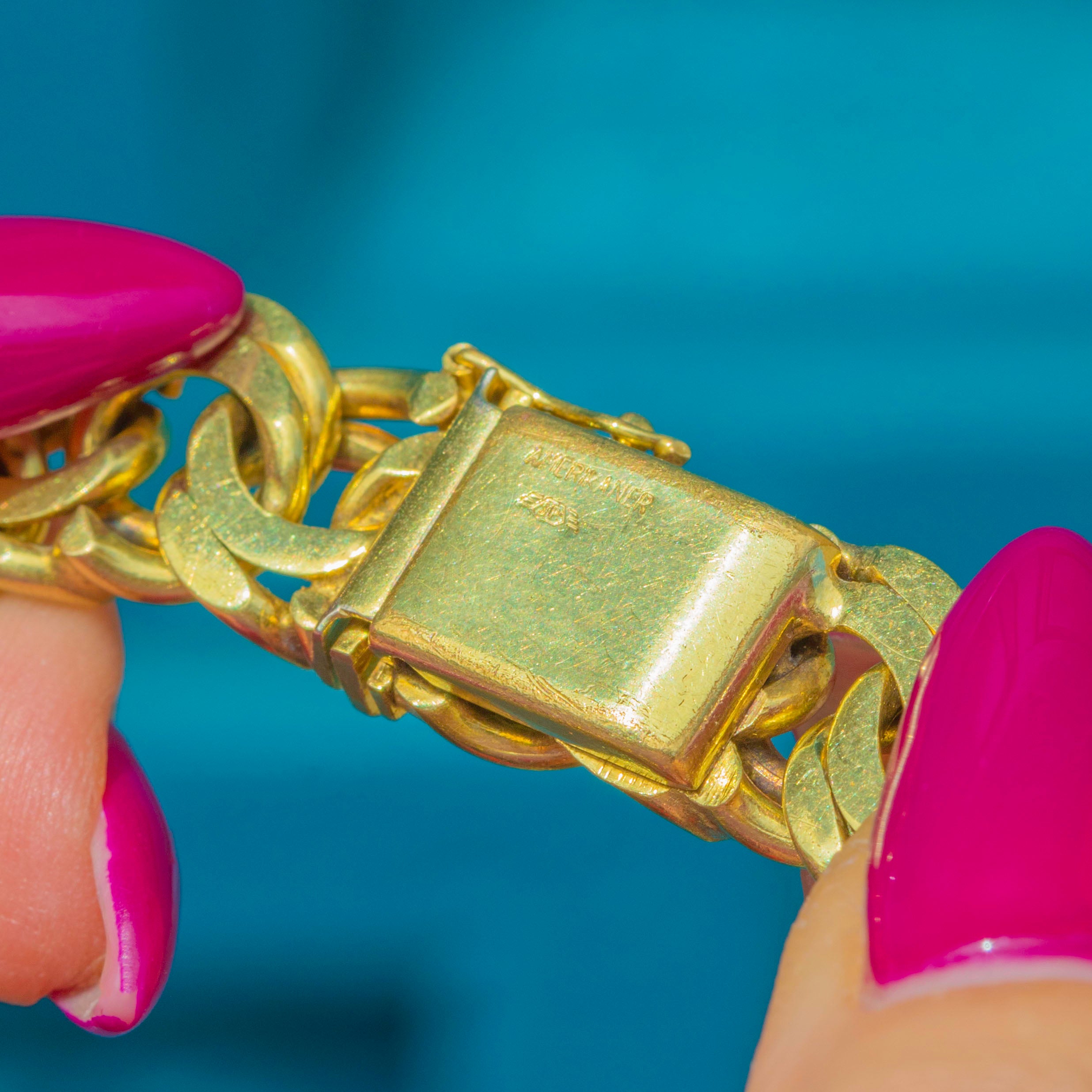 VERY GOOD-EXCELLENT: The Gold is saturated and bright, with only very minor spots of discolouration. The links are securely connected and the clasp is secure, allowing for consistent and reliable wear.