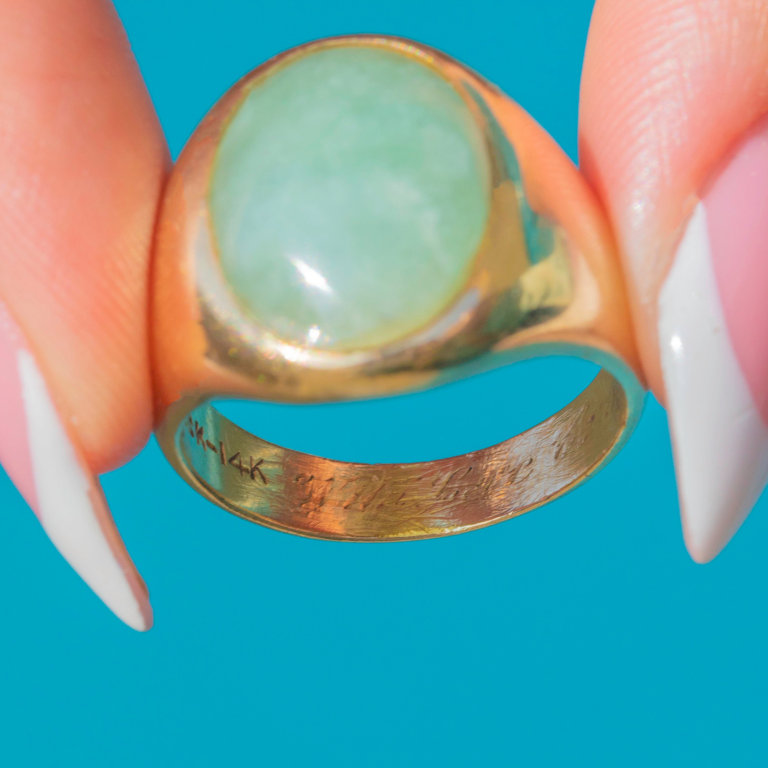 EXCELLENT: The Jade is free from chips, scratches, or abrasions, retaining a beautiful smooth polish. The Gold band is in pristine condition with no thinning or distortion. There is a worn inscription inside the band that is too faint to read, adding a touch of mystery to this well-preserved vintage piece.