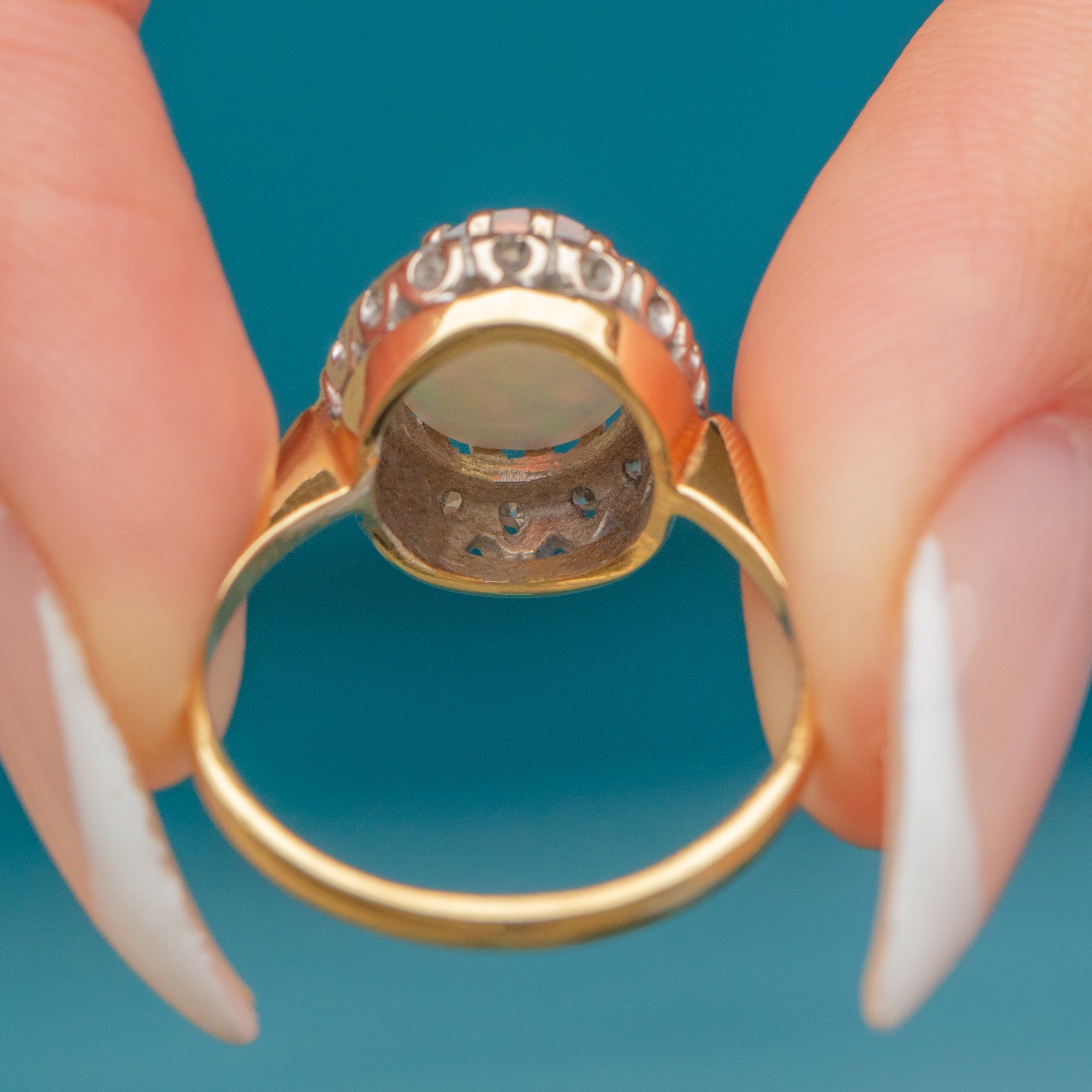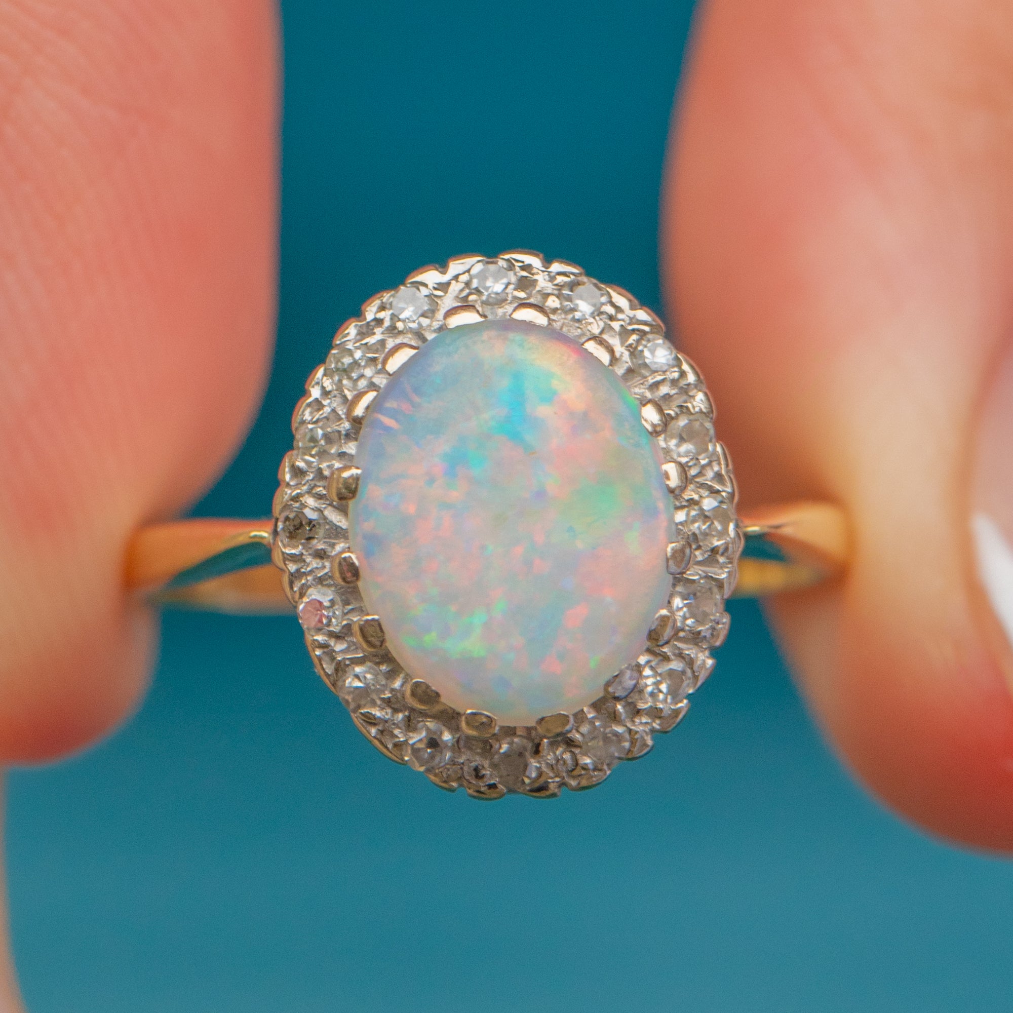 EXCELLENT: The Opal displays vibrant play-of-colour with no chips or cracks. Diamonds are bright and secure in their settings. Gold band is smooth and well preserved.