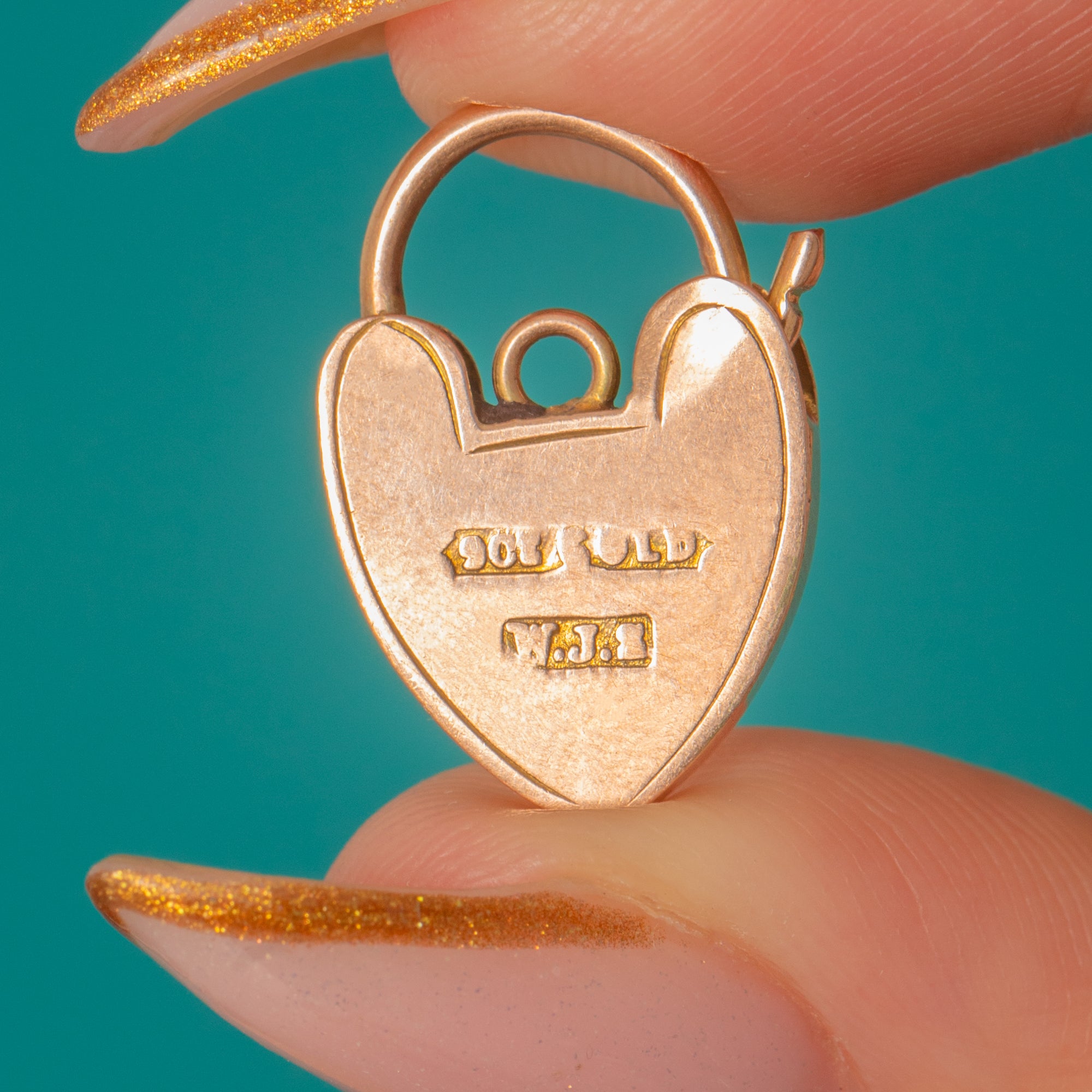 Complete with its original “9CT GOLD” hallmark and maker’s mark “WJS”, this miniature padlock is fully functioning, opening and closing securely just as it would have over a century ago. A gorgeous, wearable piece of antique charm symbolism.