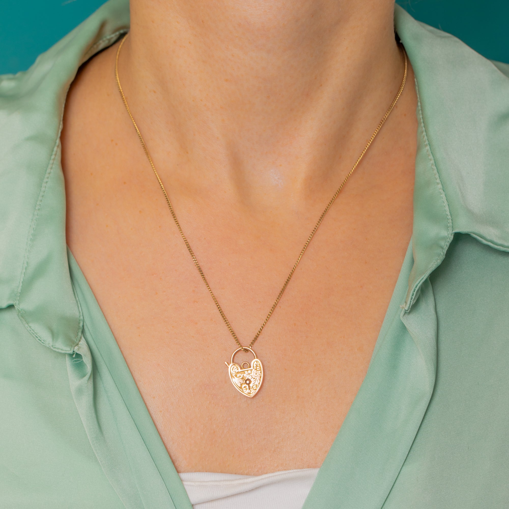 This dainty Edwardian heart padlock charm is a beautifully sentimental classic. Engraved with sweet antique flourishes and crafted in warm 9ct Yellow Gold, it’s the perfect little charm for bracelets, necklaces or lovers of romantic Edwardian detail.