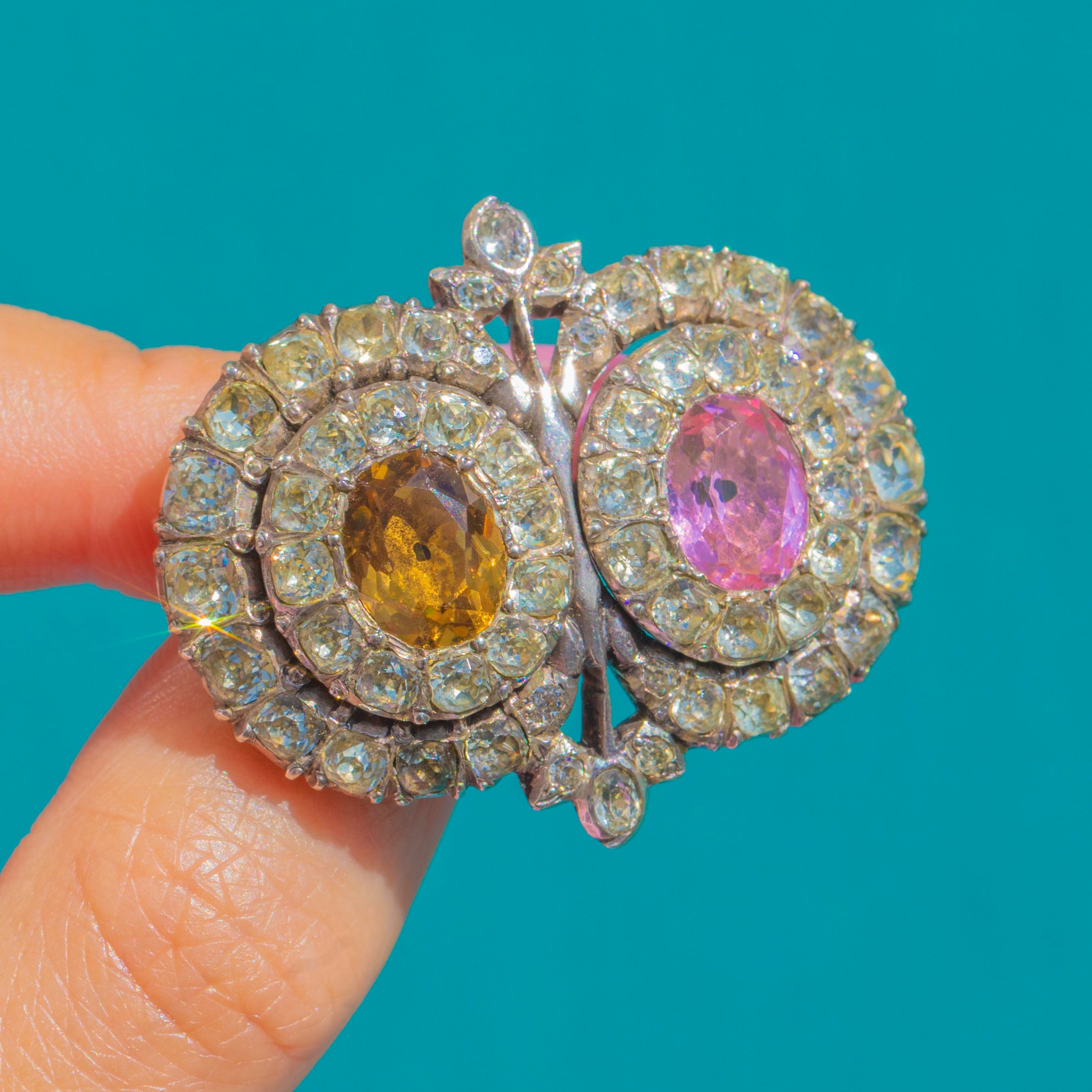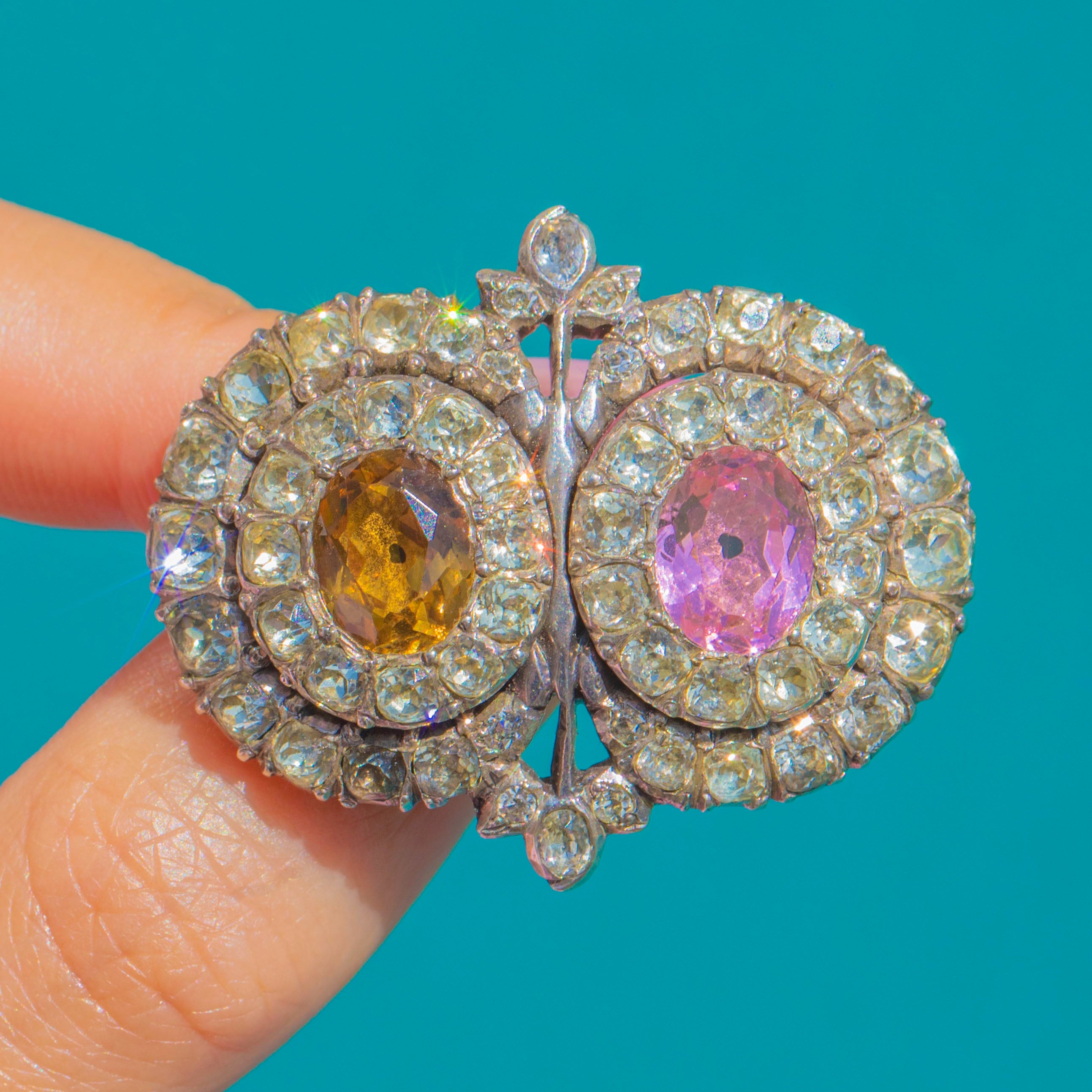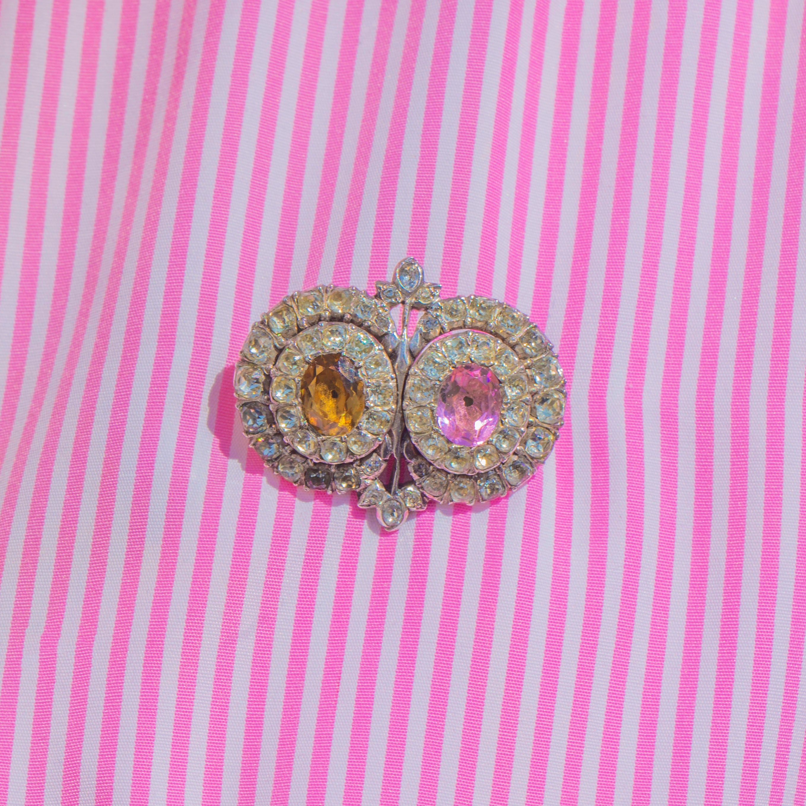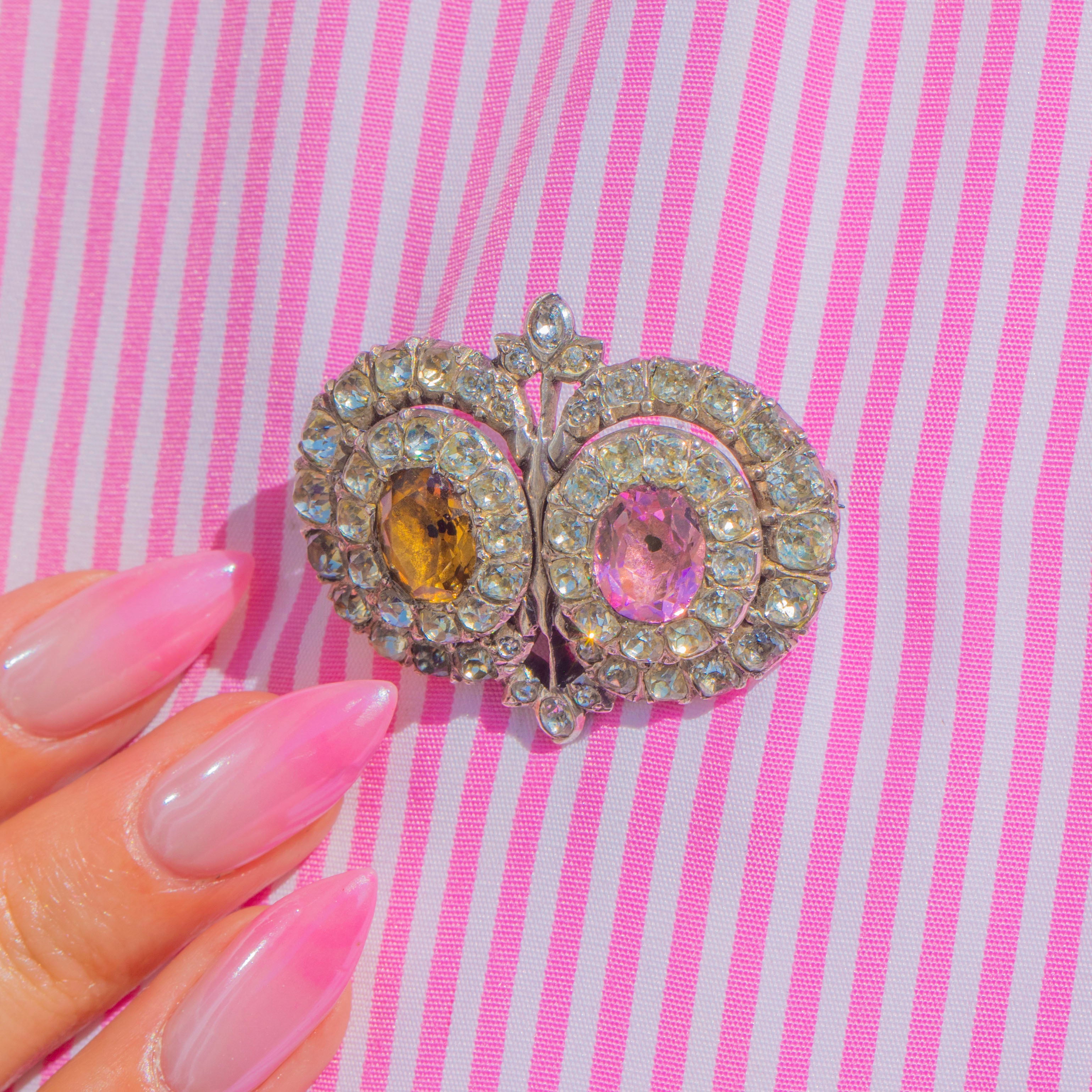 A remarkable Georgian Queen Anne Paste brooch, crafted in lustrous Sterling Silver and aglow with romantic colour. Two oval centre stones in blush pink and maple tones are haloed by shimmering white Paste, arranged in elegant concentric rows that catch the light beautifully. The softly domed silver backs and refined cluster work create a sweet, floral silhouette with timeless charm.