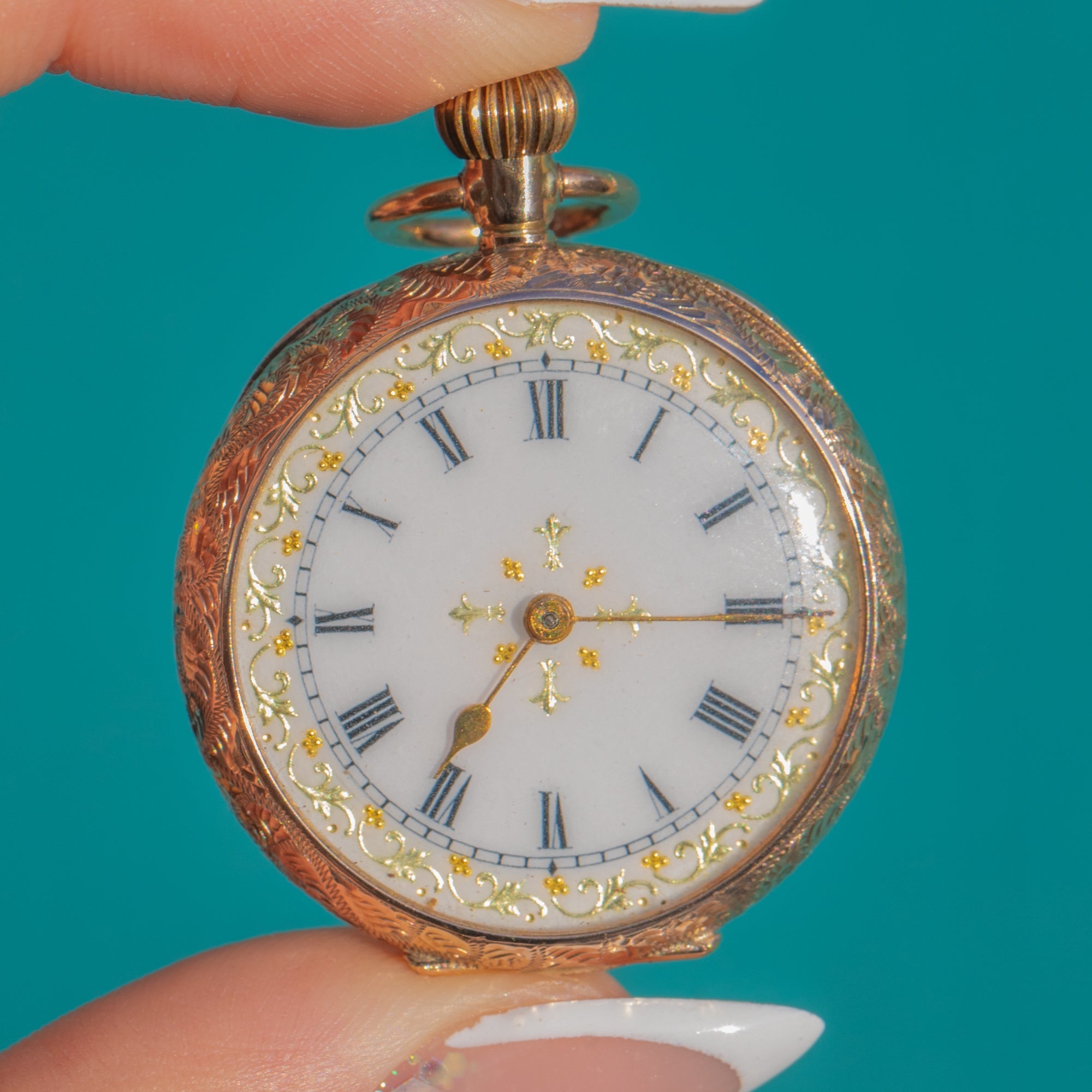 This exquisite Post-Edwardian pocket watch pendant dates to 1912 and is full of early 20th-century charm. The white Enamel dial features crisp Roman numerals and tiny golden flourishes, giving it a delicate, refined aesthetic. The warm 9ct Gold case is beautifully engraved with ornate foliate patterns, catching the light with every movement.