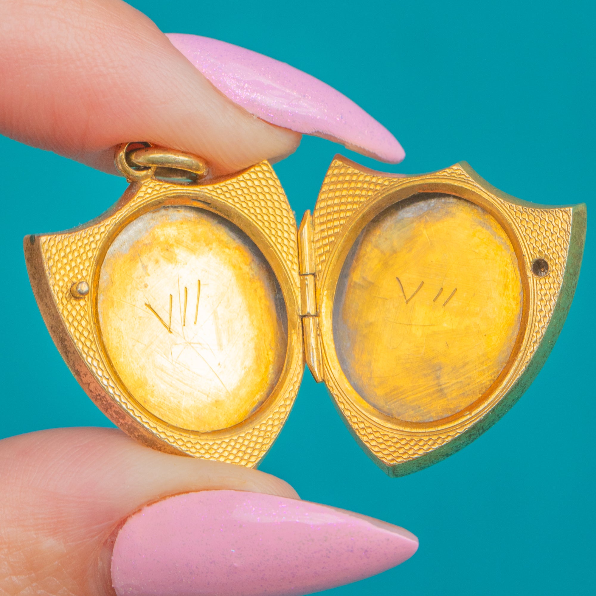 Ornate yet beautifully restrained, this petite escutcheon opens to reveal two recessed compartments for treasured mementos. A timeless keepsake with all the delicate sentiment and craftsmanship we love from the era.