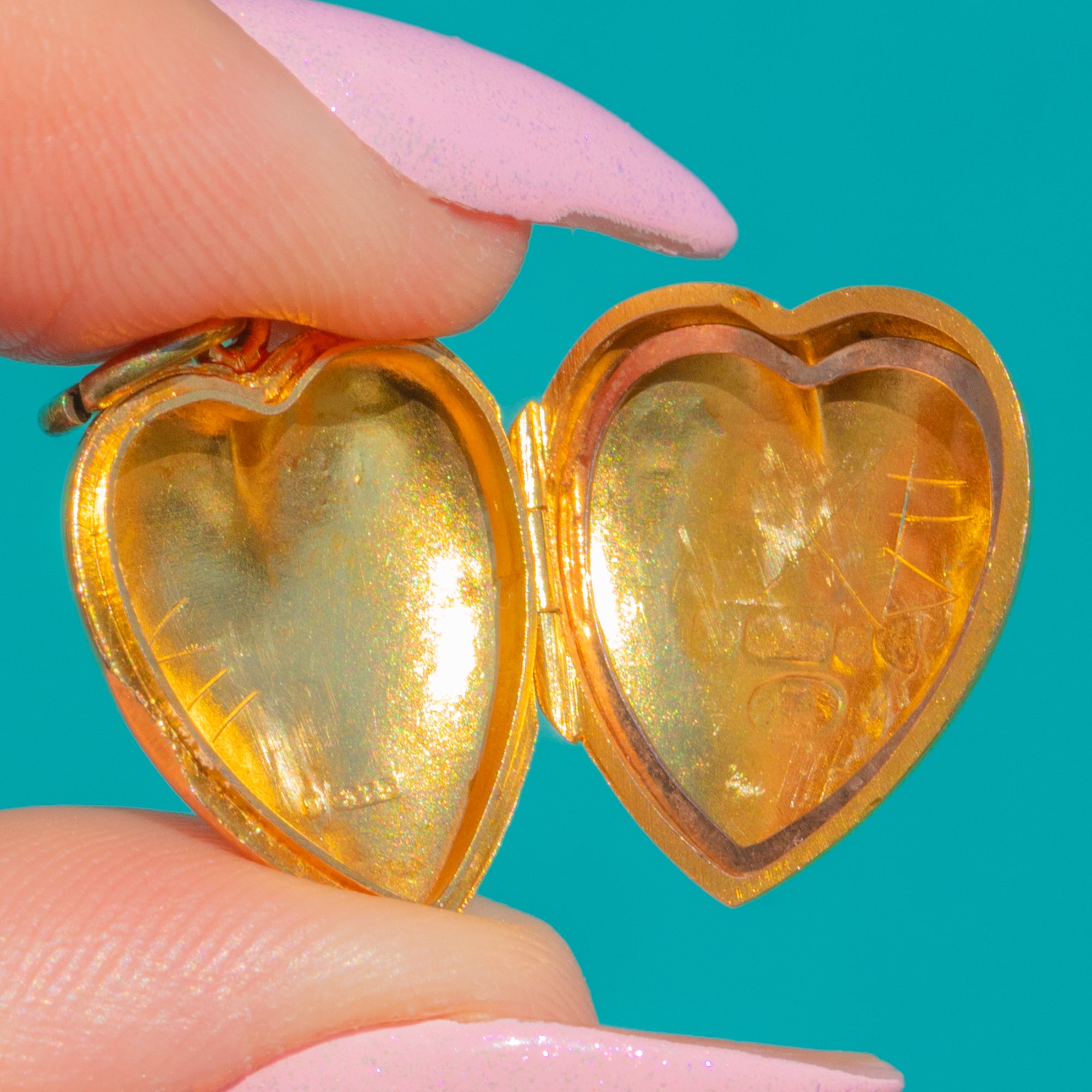 A sweet heart-shaped locket in solid 9ct Gold, richly decorated with scrolling foliate and tiny floral engraving framed by a central blank cartouche ready for initials. Its warm golden glow and crisp detailing create a beautifully romantic, timeless keepsake.