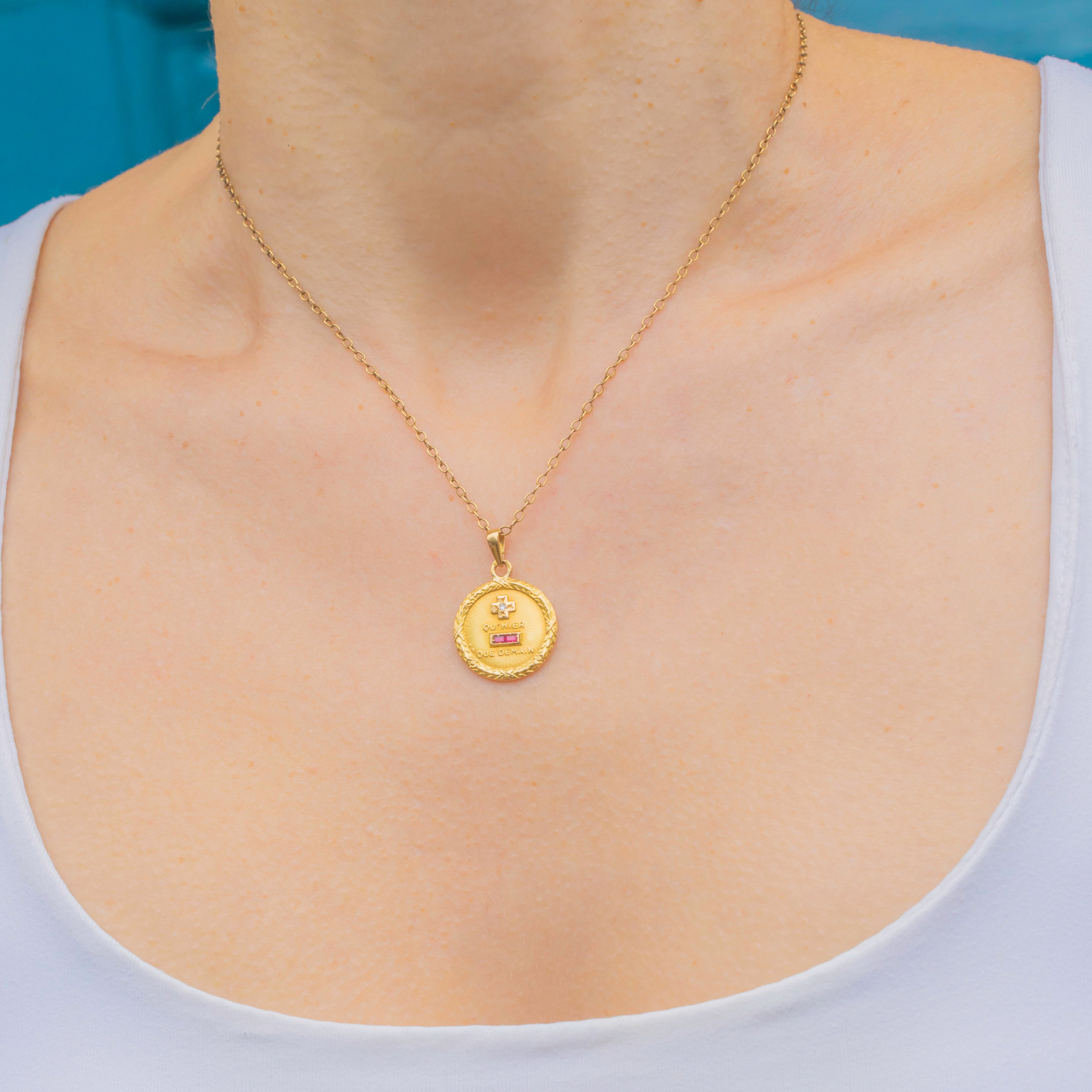 Qu'hier Que Demain 18ct French Ruby Pendant "More than yesterday, less than tomorrow", Art Deco c1940