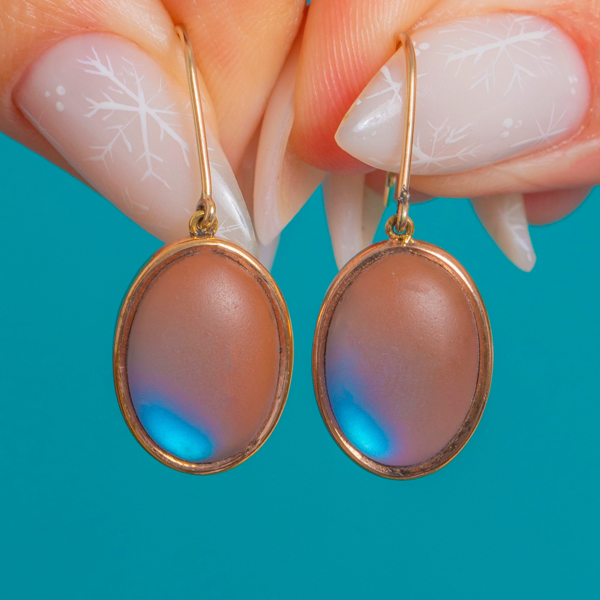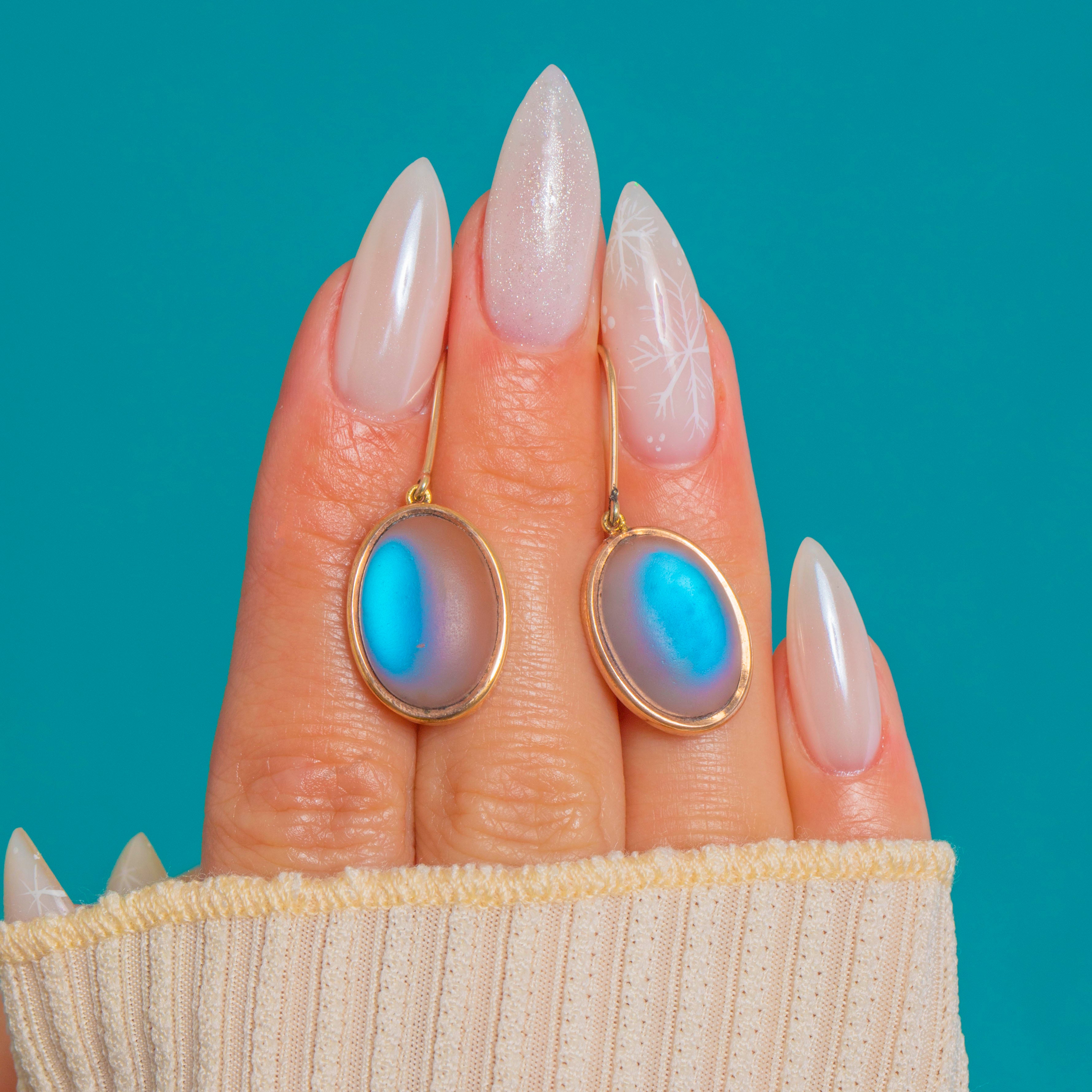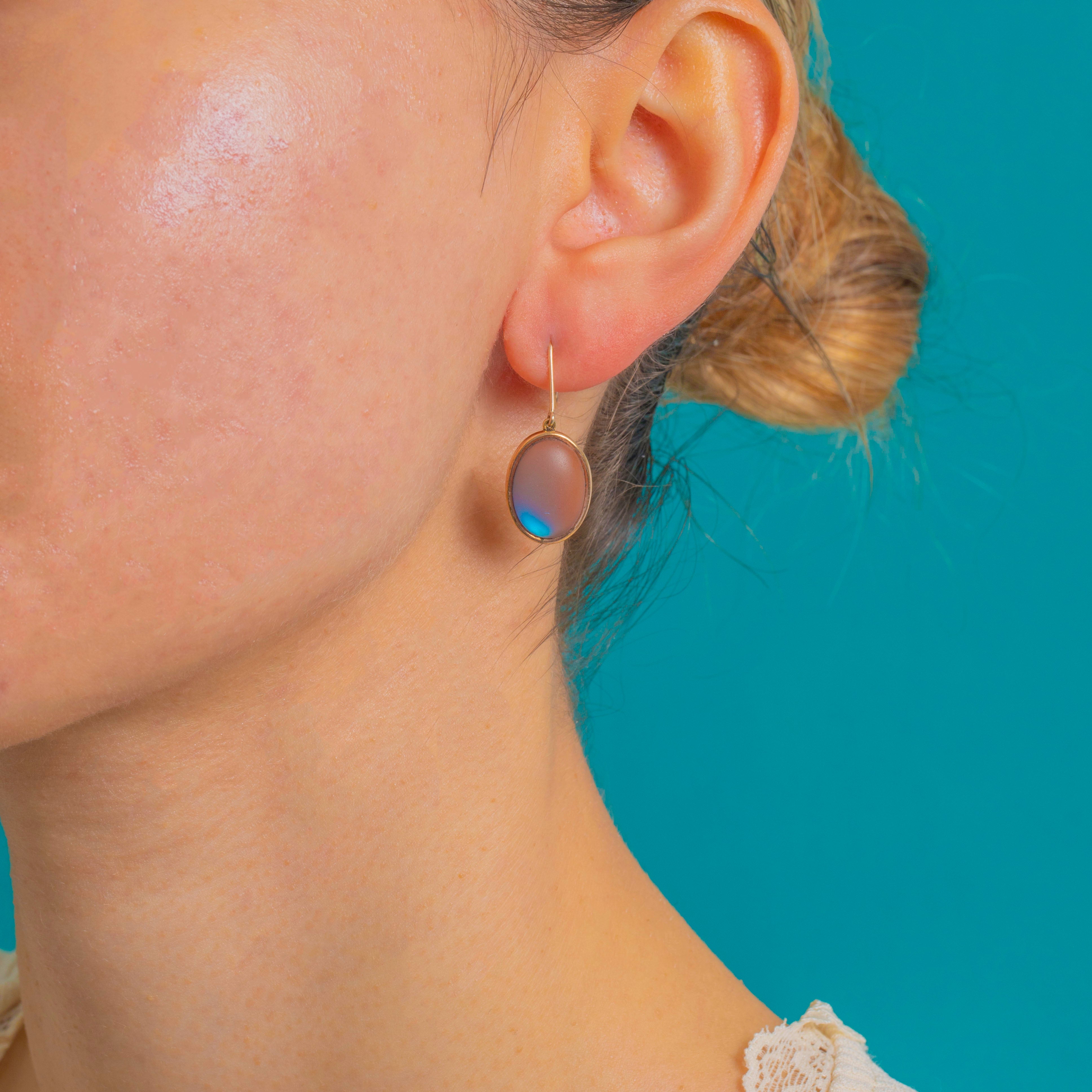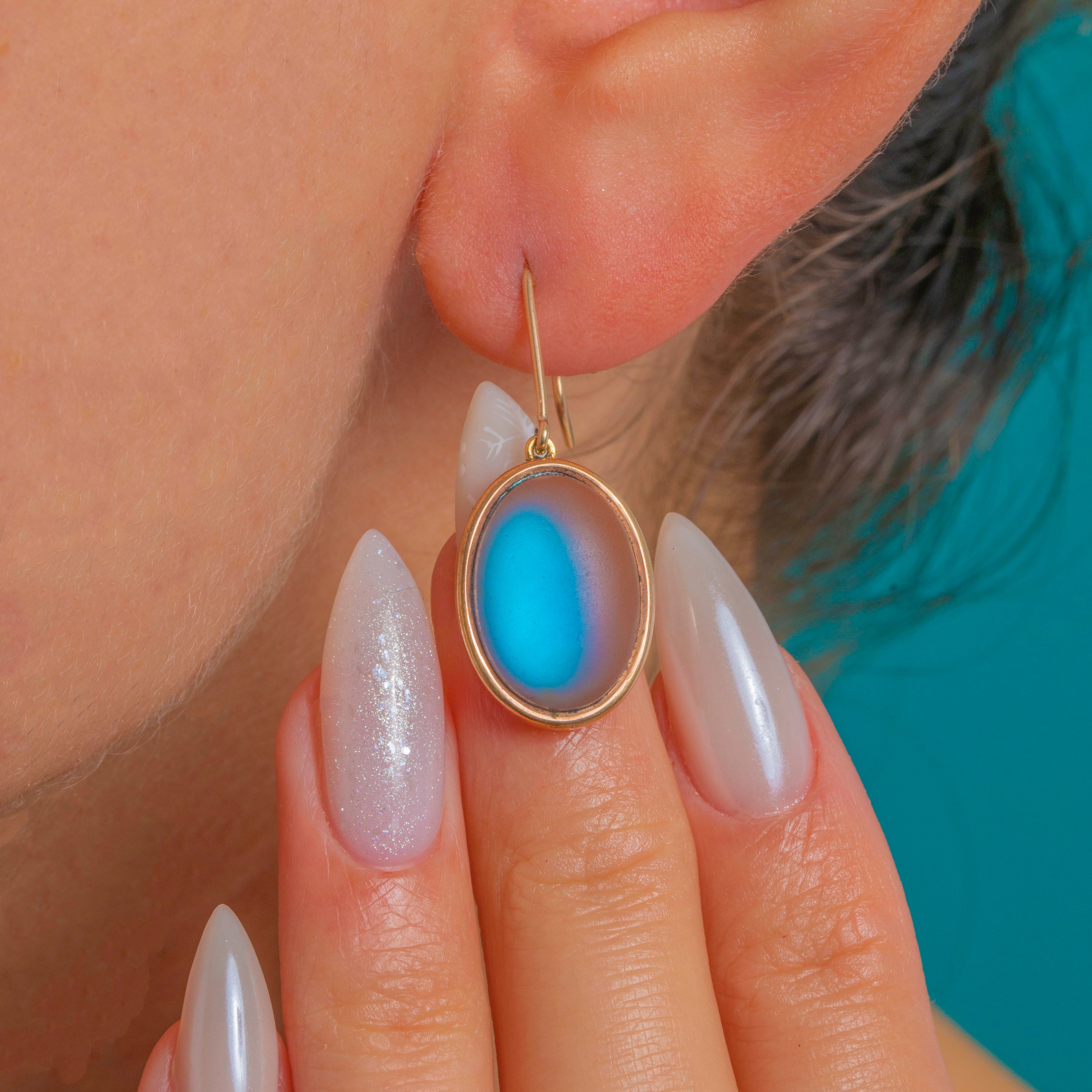 Glimmering with an opaline electric blue flash, these Sapphiret cabochon drop earrings are a chic pair for everyday wear. The domed ovals are rub-over set in Gold Cased bezels for a smooth, minimalist finish that lets the luminous stones take centre stage.