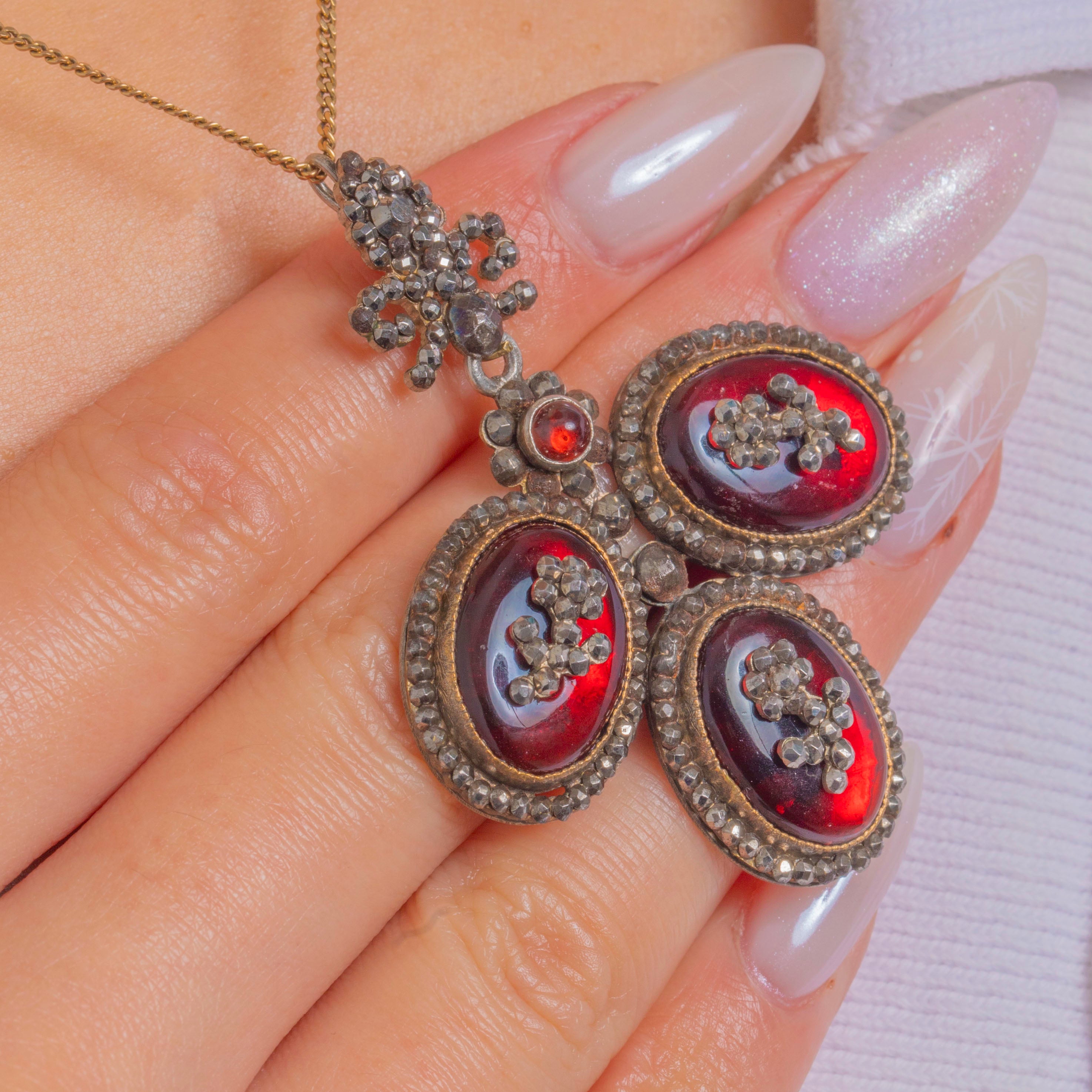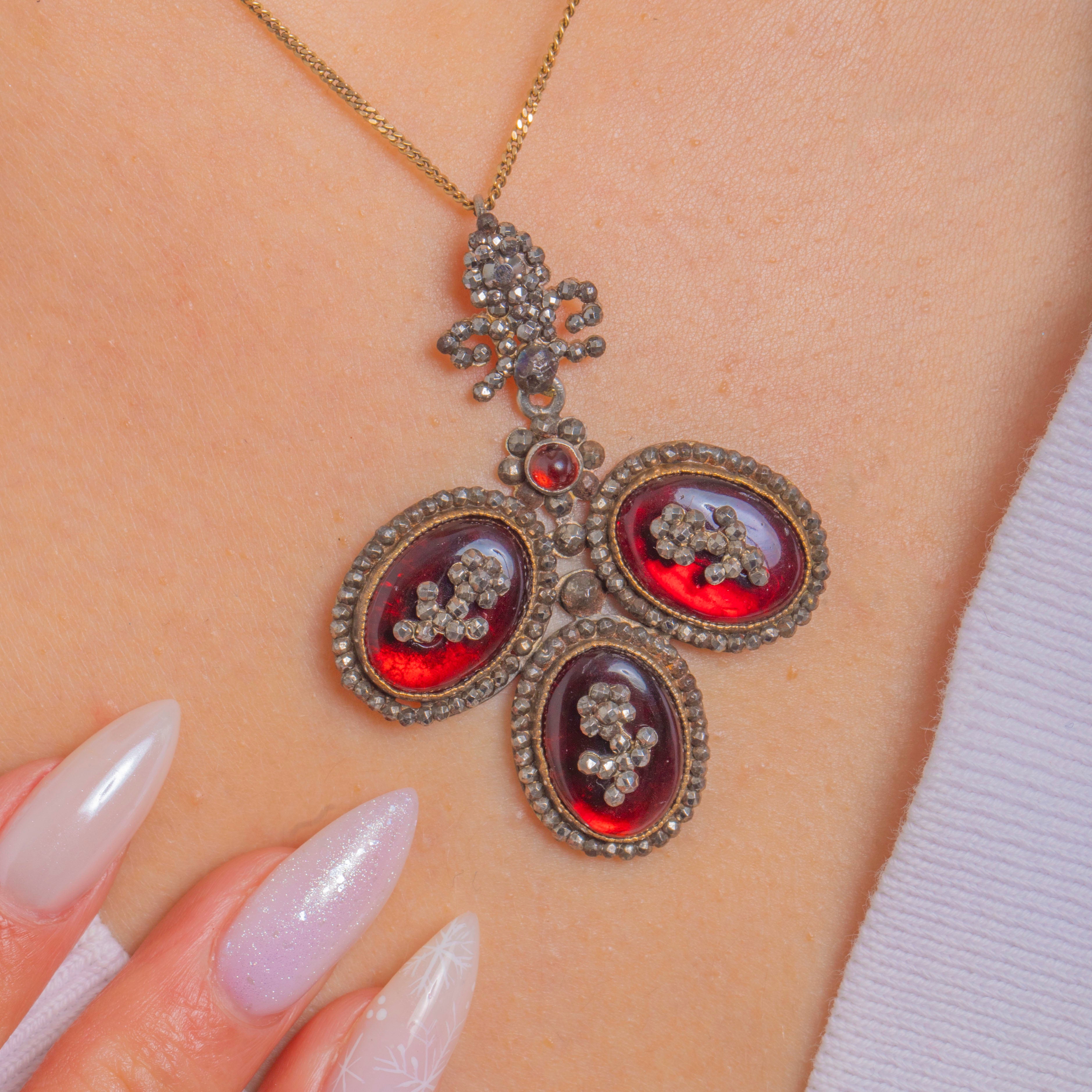 Each cabochon is embraced by dense halos and rosette clusters of shimmering Cut Steel, their dark, mirror-bright facets lending a silvery sparkle that contrasts beautifully with the rich red domes. Delicate articulation between the elements gives subtle movement, while the softly time-worn patina and gold-toned rims around the bezels add depth and antique charm. Ornate, romantic and unmistakably historic, this is a statement jewel of superb period character.