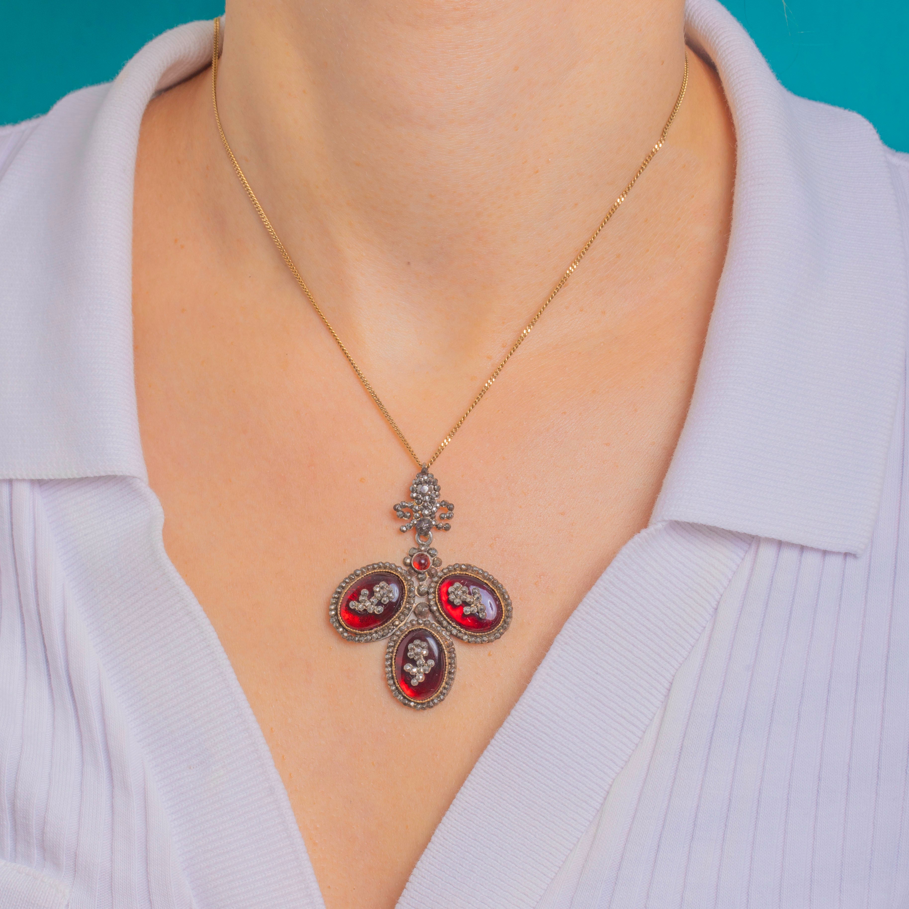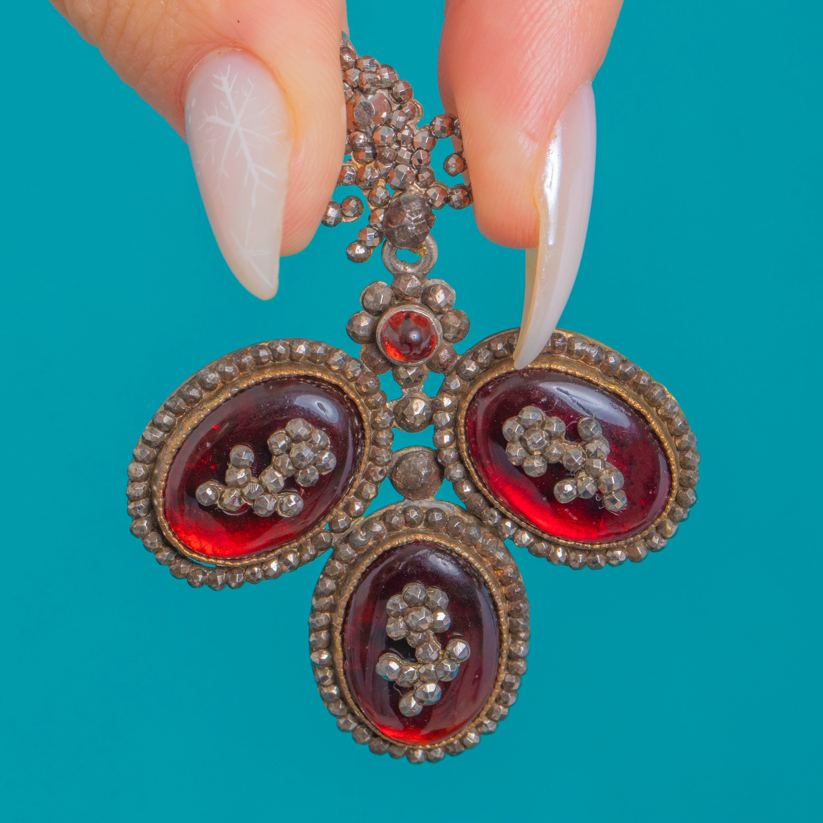 A glorious Georgian pendant in the Queen Anne taste, composed as an articulated trefoil surmounted by a dainty bow. Three high-domed Red Paste cabochons glow dramatically over Mother of Pearl in the traditional “coque de perle” manner, creating that lit-from-within crimson radiance beloved of early 18th–century jewels.
