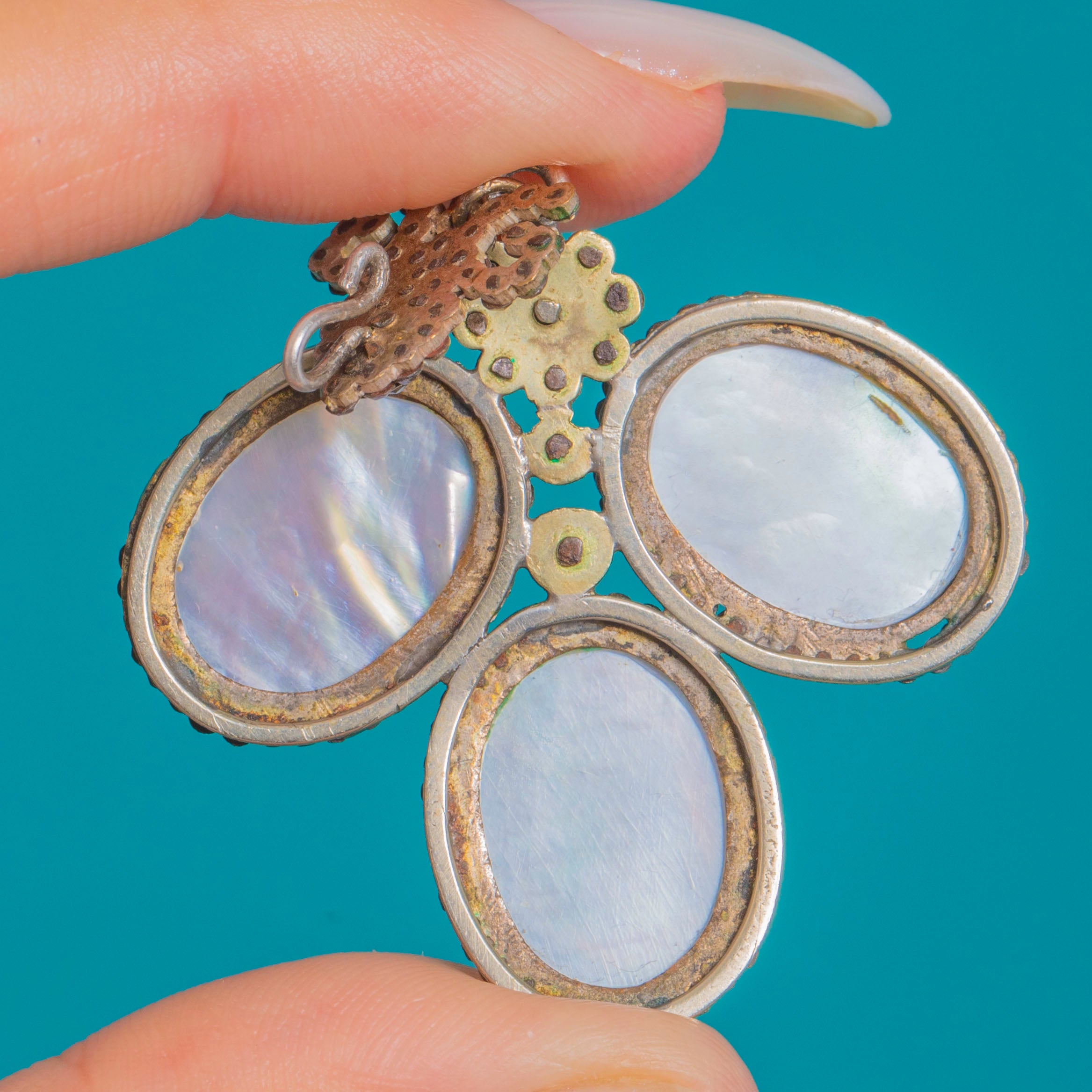 MATERIALS: Tests as Silver, Cut Steel, Red Paste cabochons on Mother of Pearl