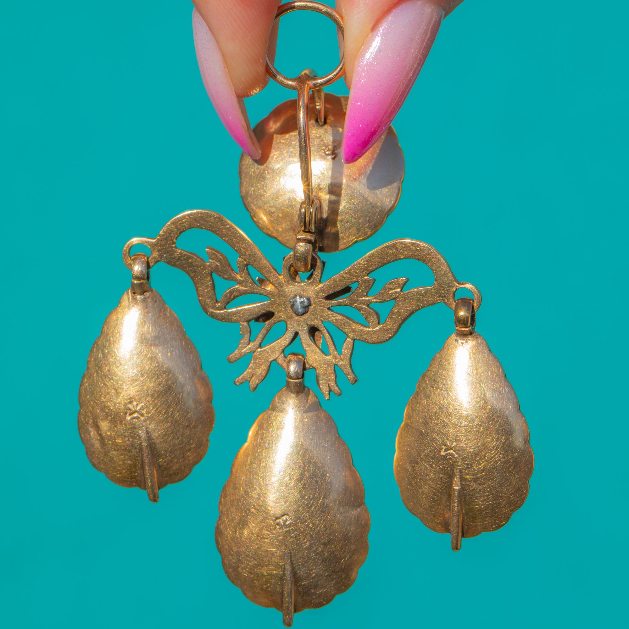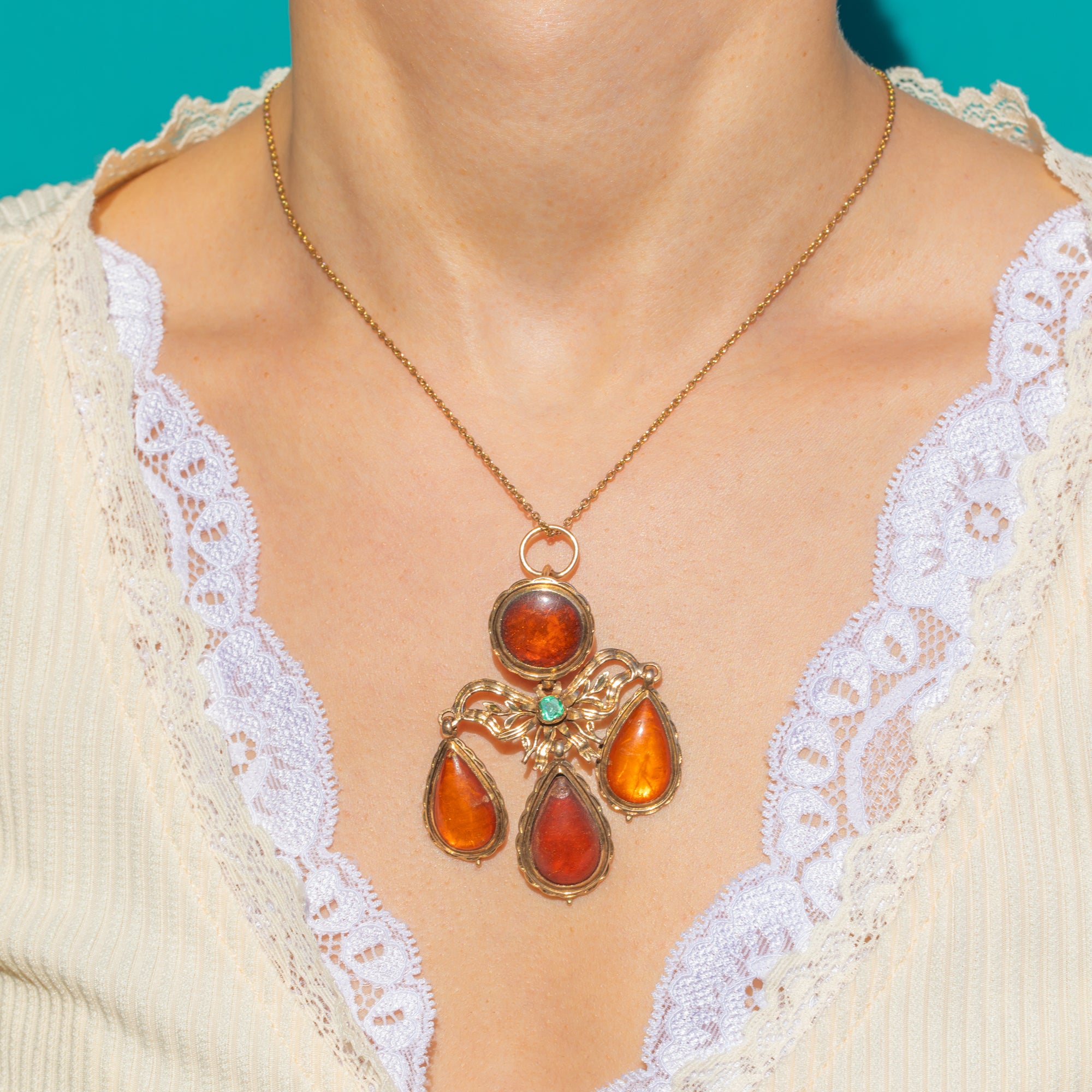 A sumptuous Portuguese Georgian girandole pendant, c.1760, ablaze with glowing Amber and a vivid Emerald accent. Crafted in rich 18ct Gold, the design centres a round Amber cabochon over a graceful bow and foliate openwork, cascading to three articulated pear-shaped Amber drops. The scalloped closed-back bezels and fluid movement are quintessentially Georgian, creating a romantic chandelier silhouette that dances with every step.