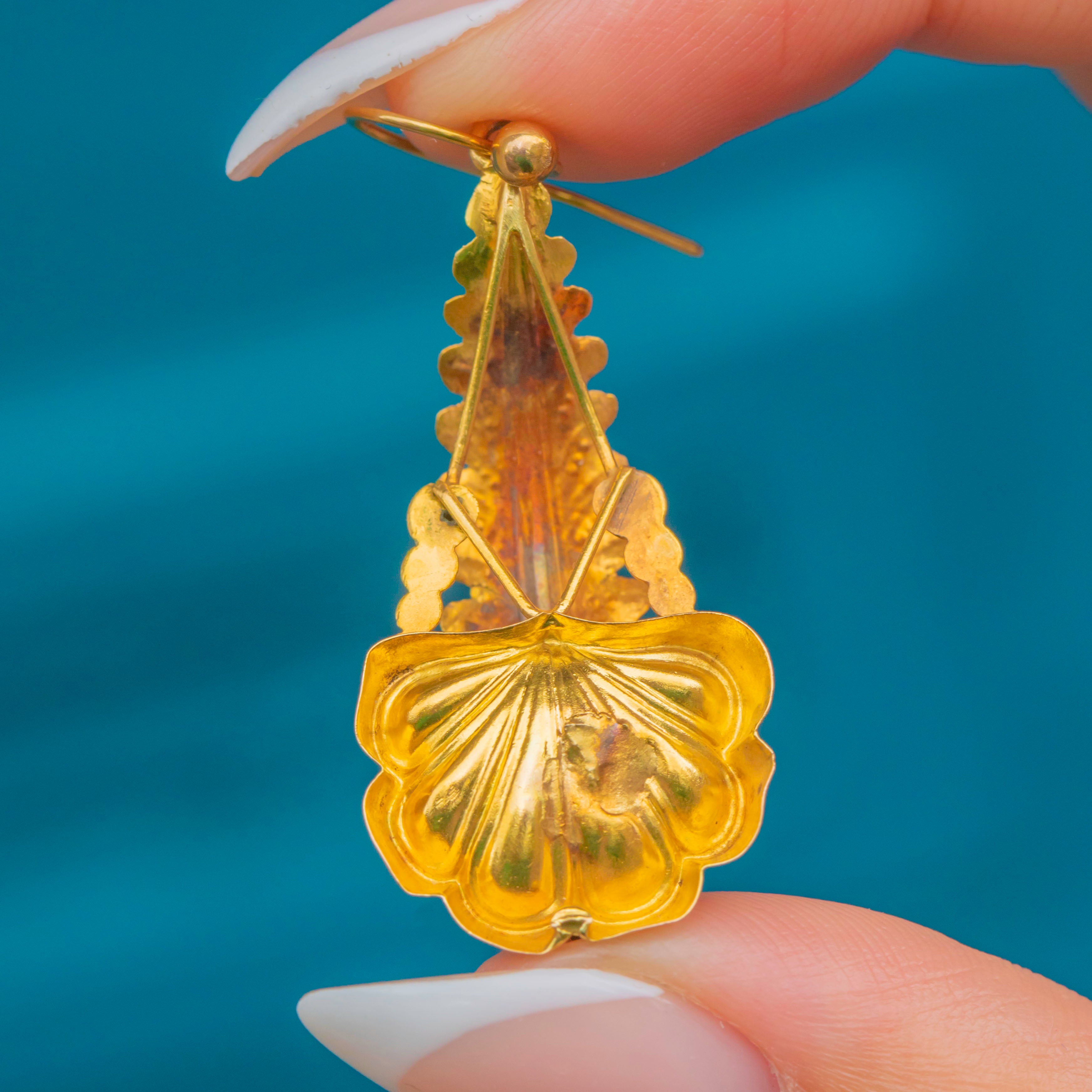 Rare Victorian 15ct Gold Garnet Scallop Shell Drop Earrings, c.1860