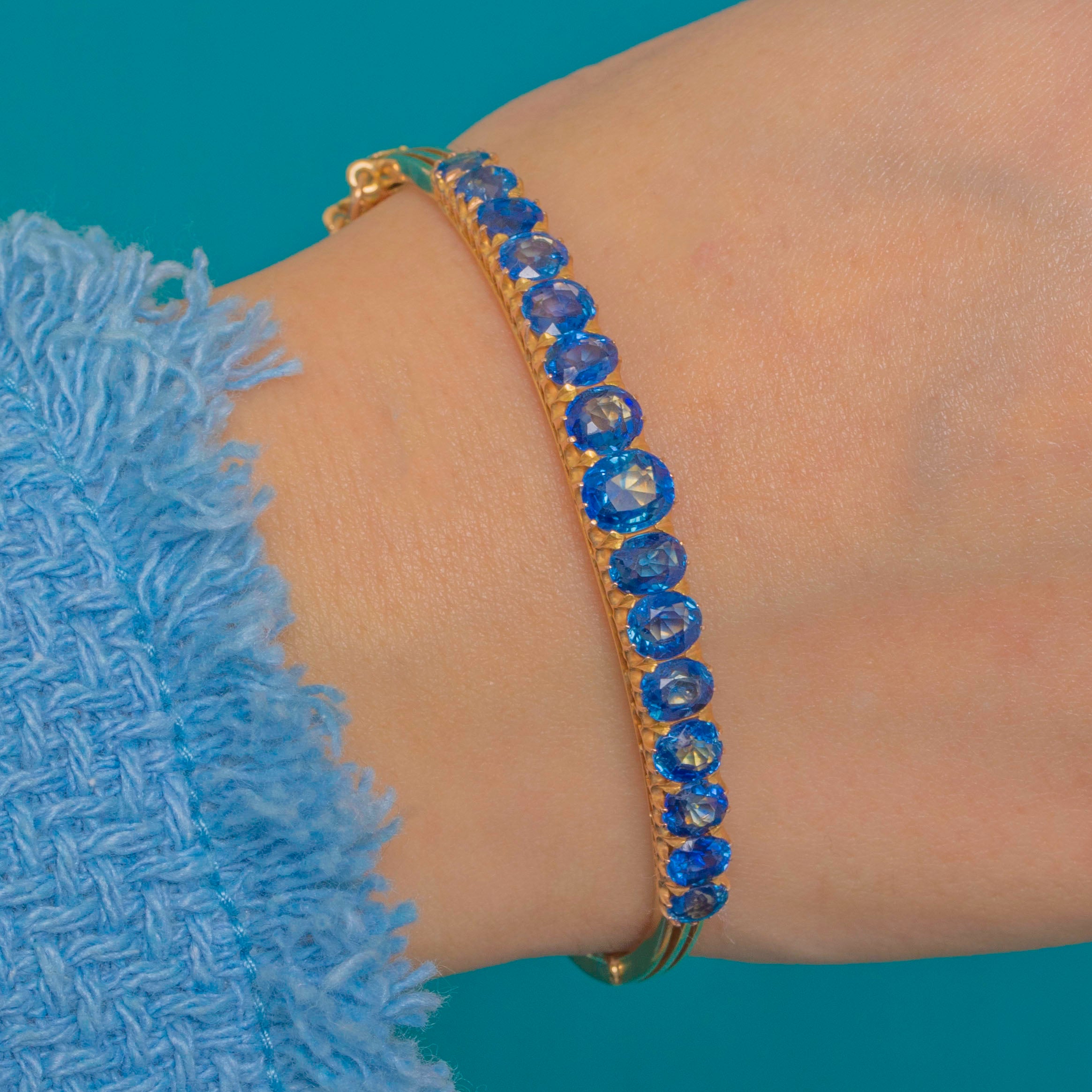 A rare Victorian natural Sapphire bangle, this elegant treasure presents a sweep of graduated blue Sapphires totalling approximately 7.85cts across the wrist. The top and settings are crafted in 15ct Gold, while the reverse of the bangle is 9ct Gold—a refined Victorian construction prized for its beauty and durability.