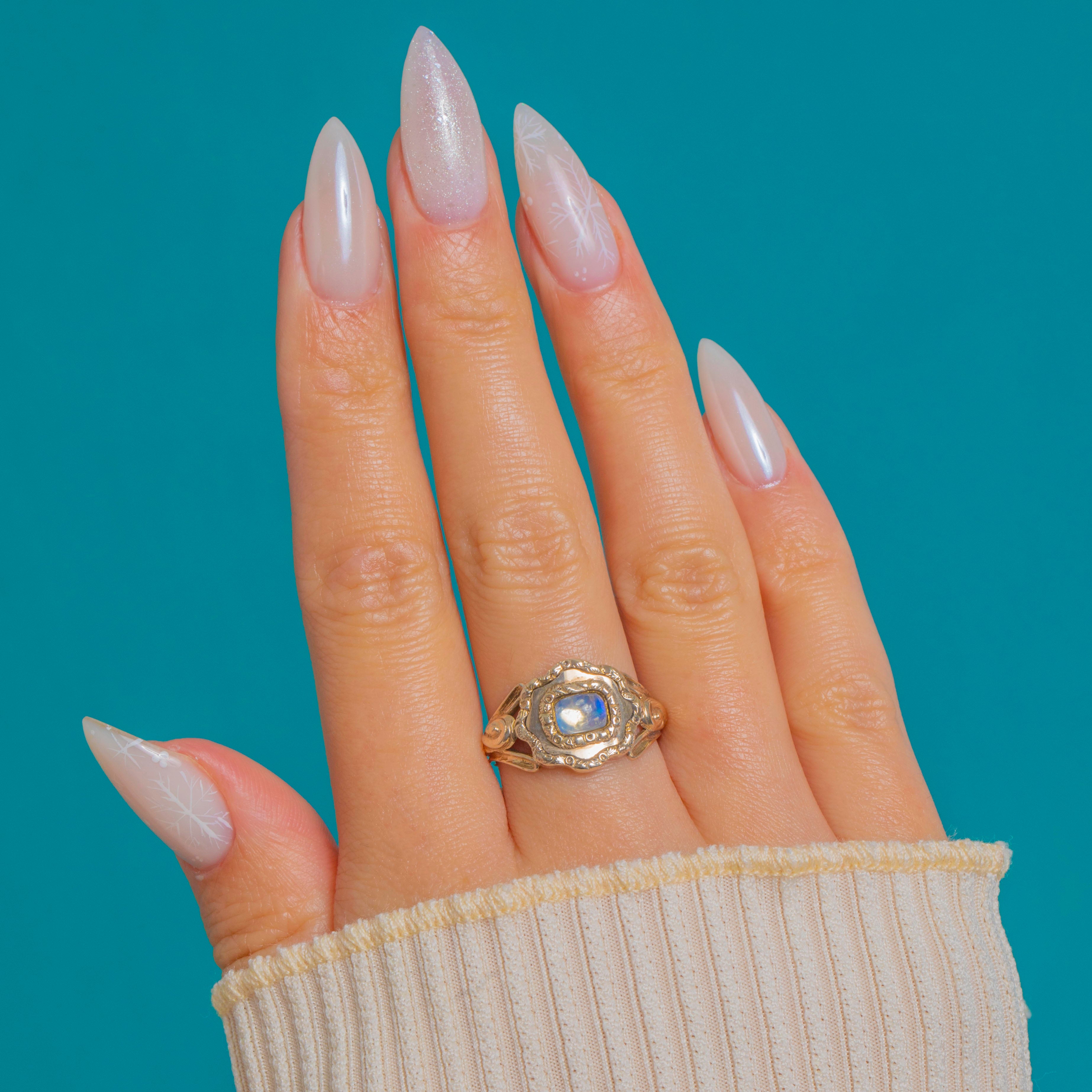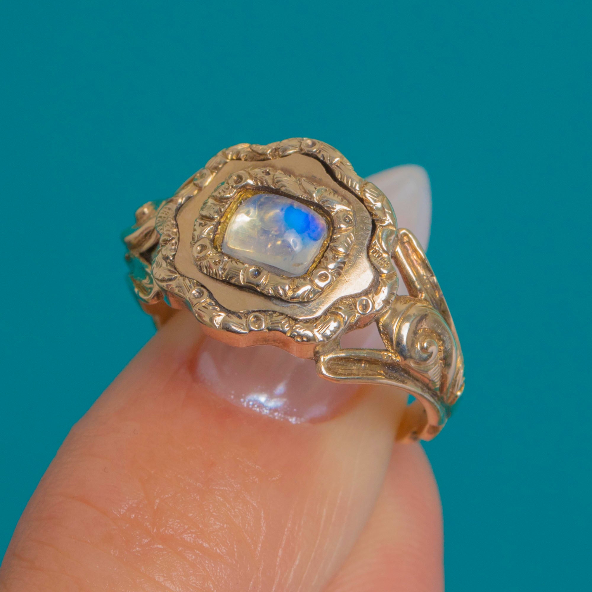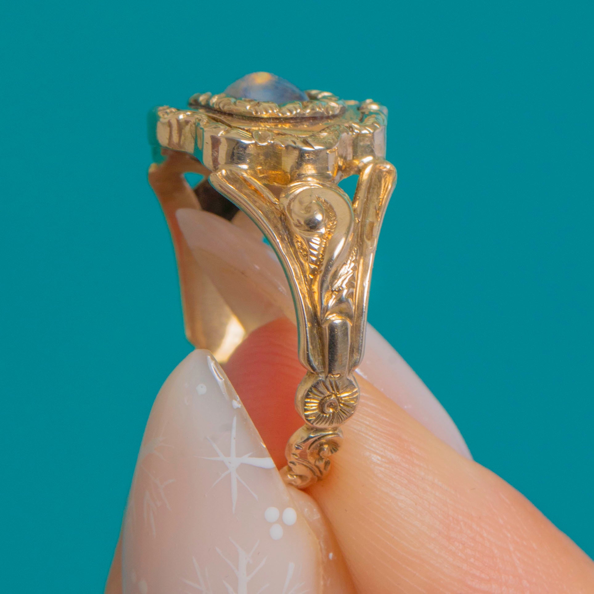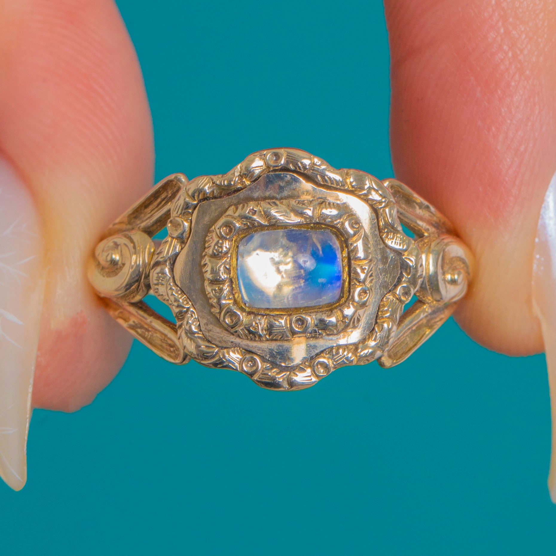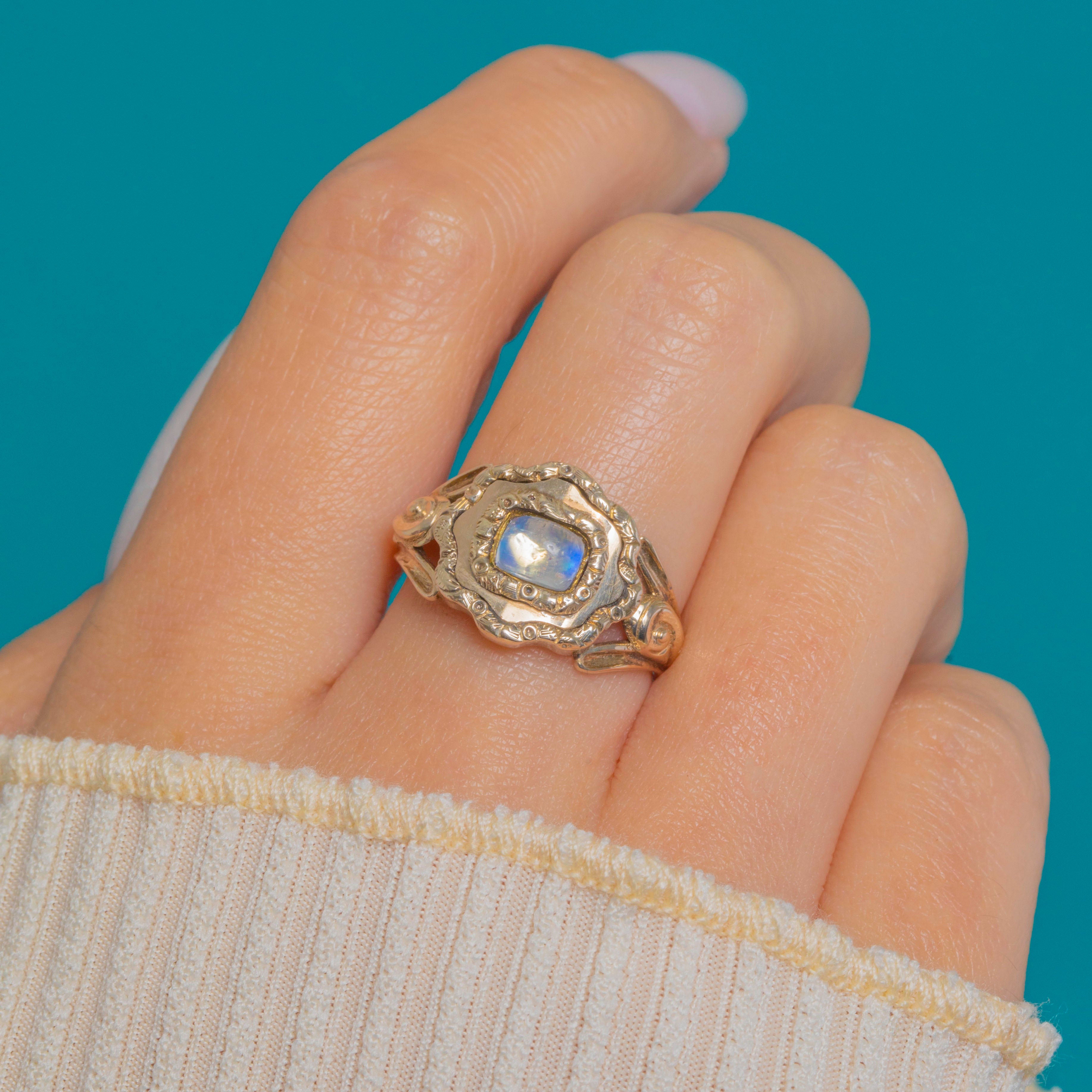 A dreamy Regency-era Moonstone ring, handcrafted in warm 9ct Gold. The translucent cabochon glows with a soft, milky body and an enchanting blue sheen, catching occasional flashes as the light moves—classic, romantic Moonstone magic.