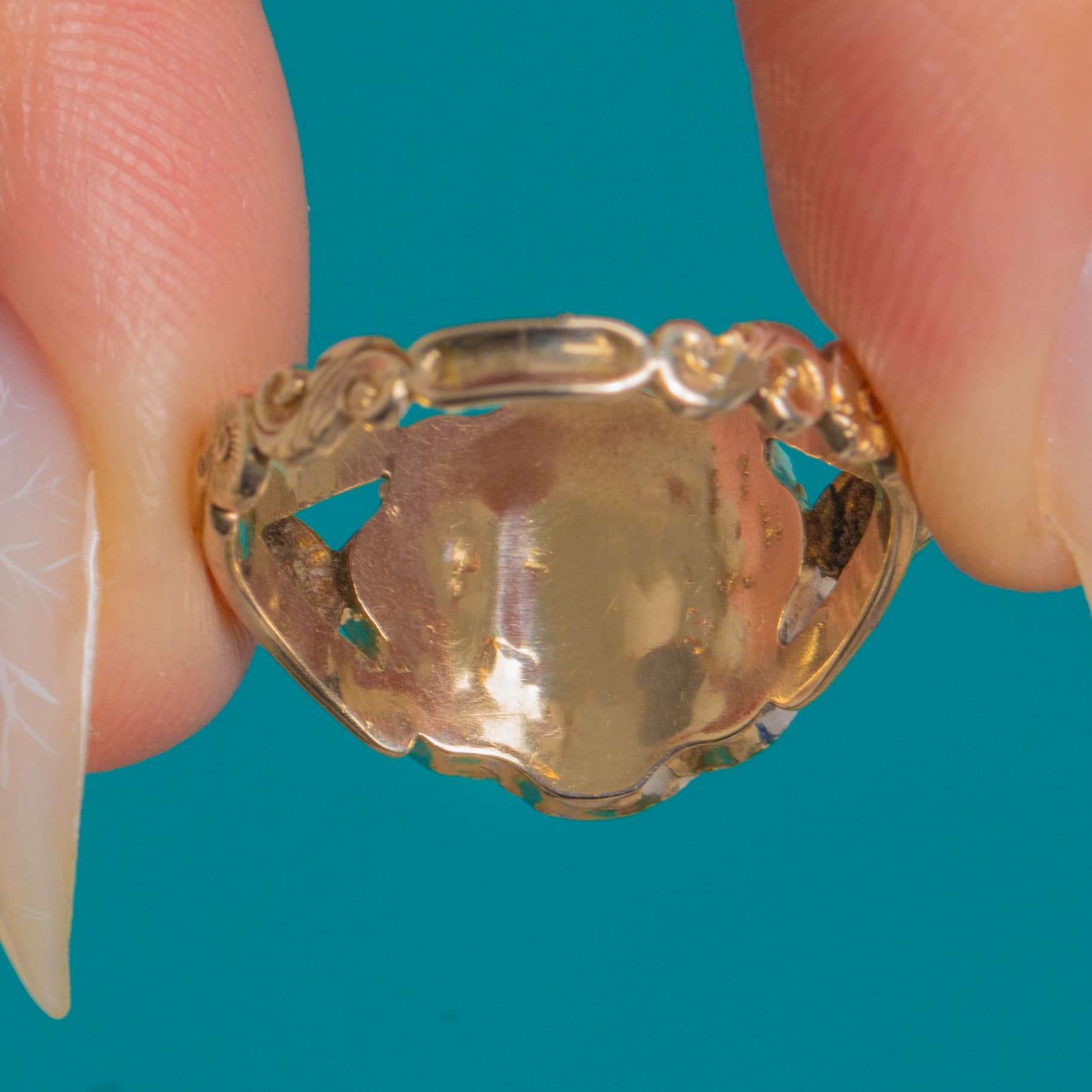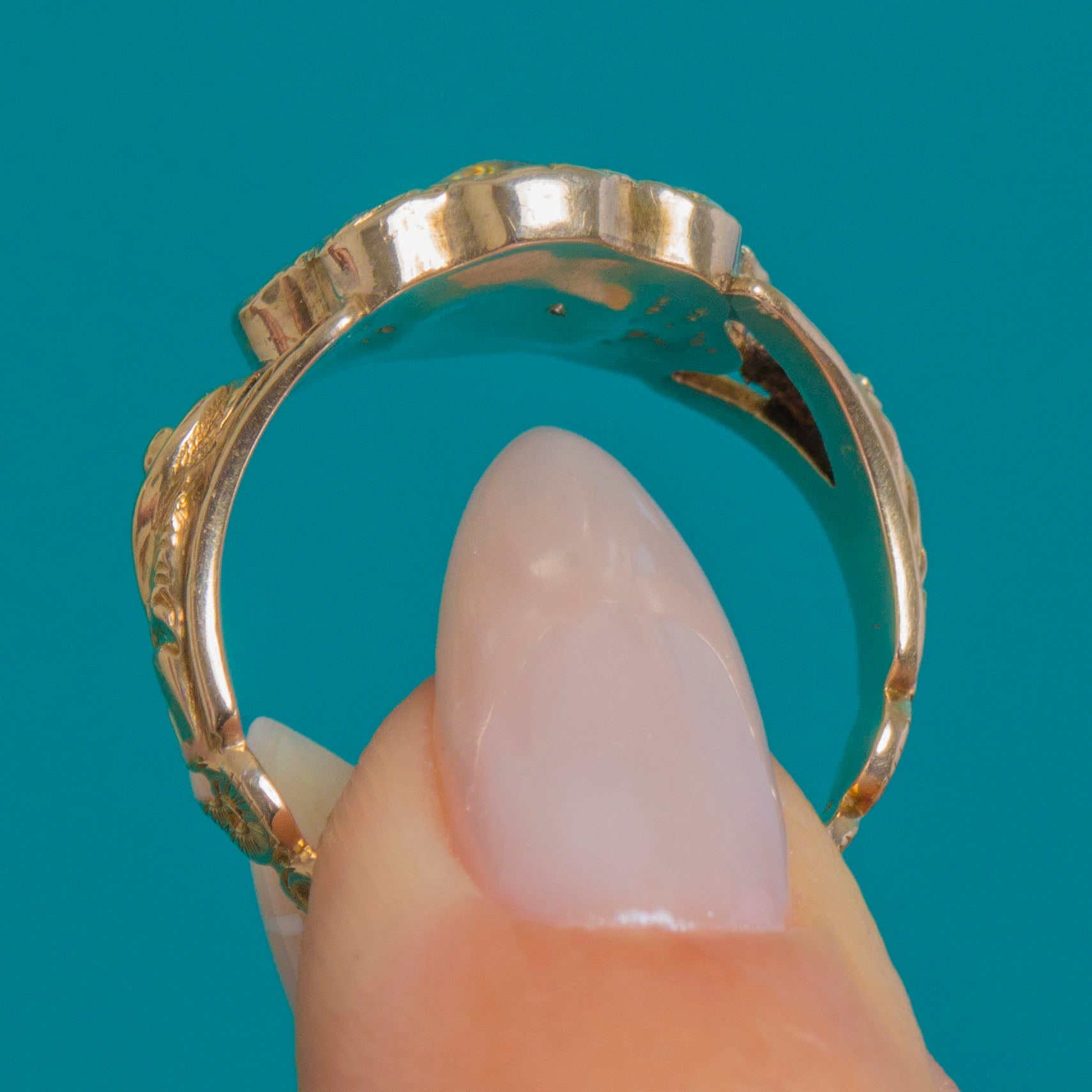 The sculptural head is a tiered, scalloped cartouche framed by chased foliate and rococo scroll details. Split shoulders curl into graceful coiled terminals, and a closed back speaks to early 19th-century craftsmanship. Ornate and wearable, it delivers elegant finger coverage and that unmistakable Georgian allure.