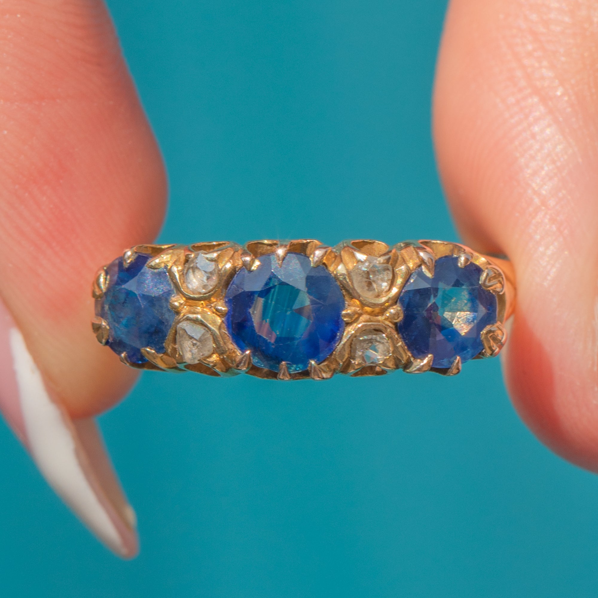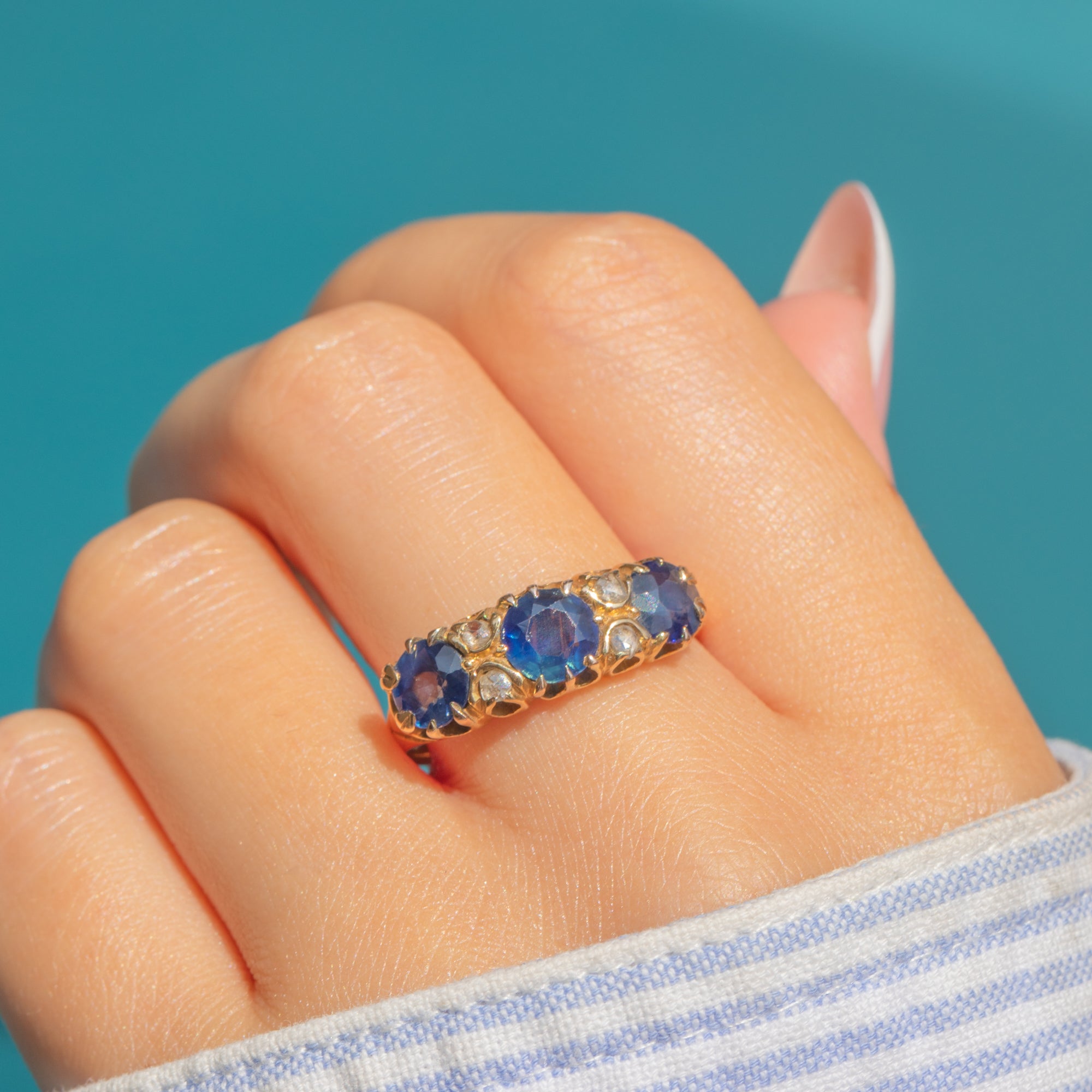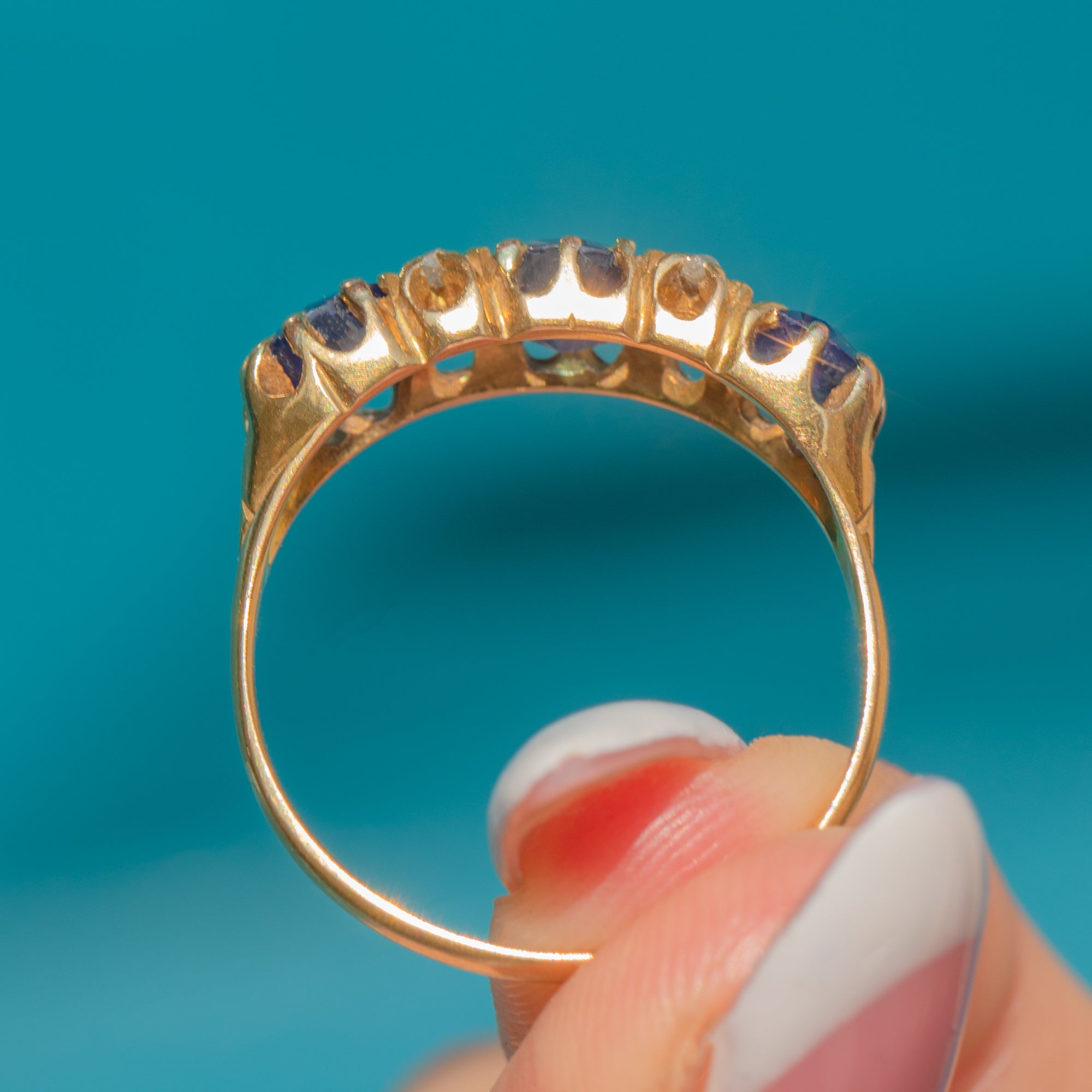 This exquisite Victorian 7-stone ring showcases three plump natural Sapphires interspersed with sparkling Diamonds, all set in rich 18ct Gold. The Sapphires display gorgeous facets, adding depth to each stone, while the Diamonds provide a timeless brilliance that complements their deep blue hue. This elegant arrangement creates a balanced and classic design, much loved in the 19th century.
