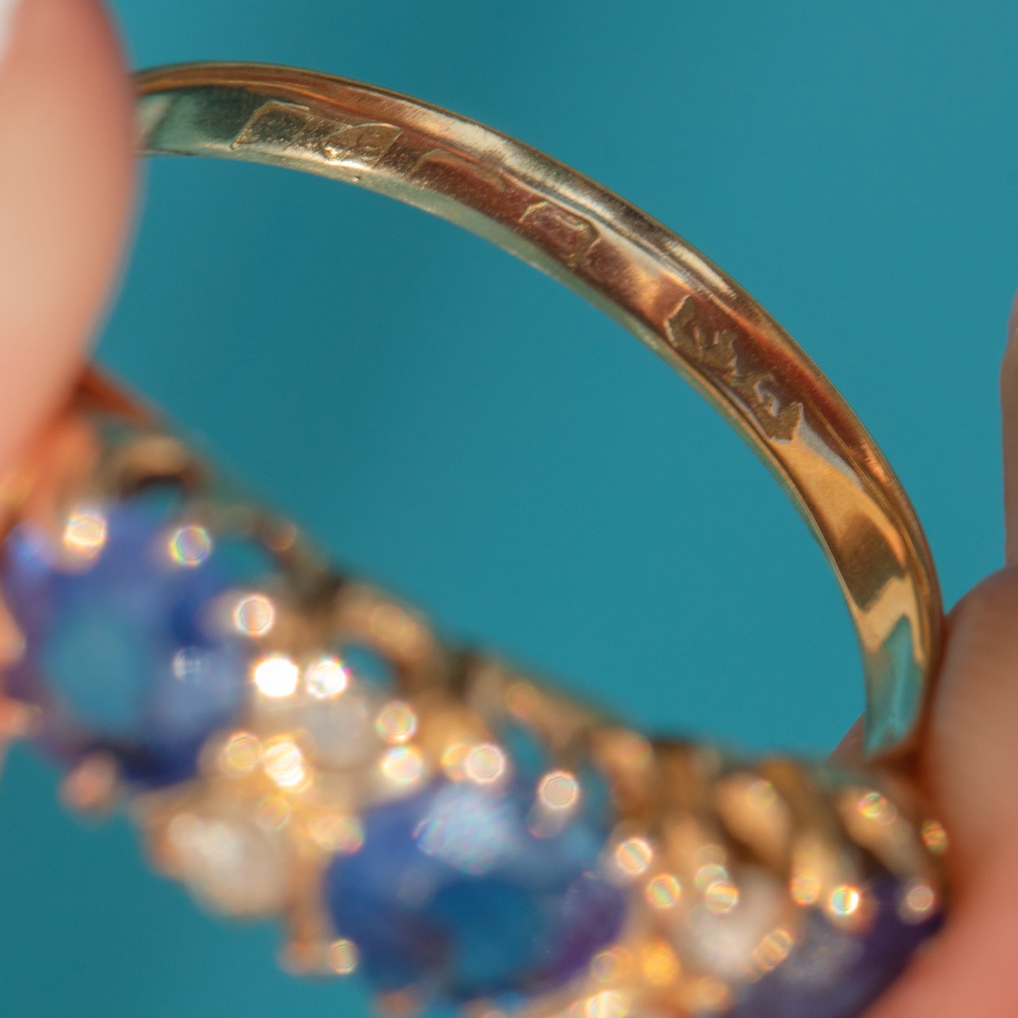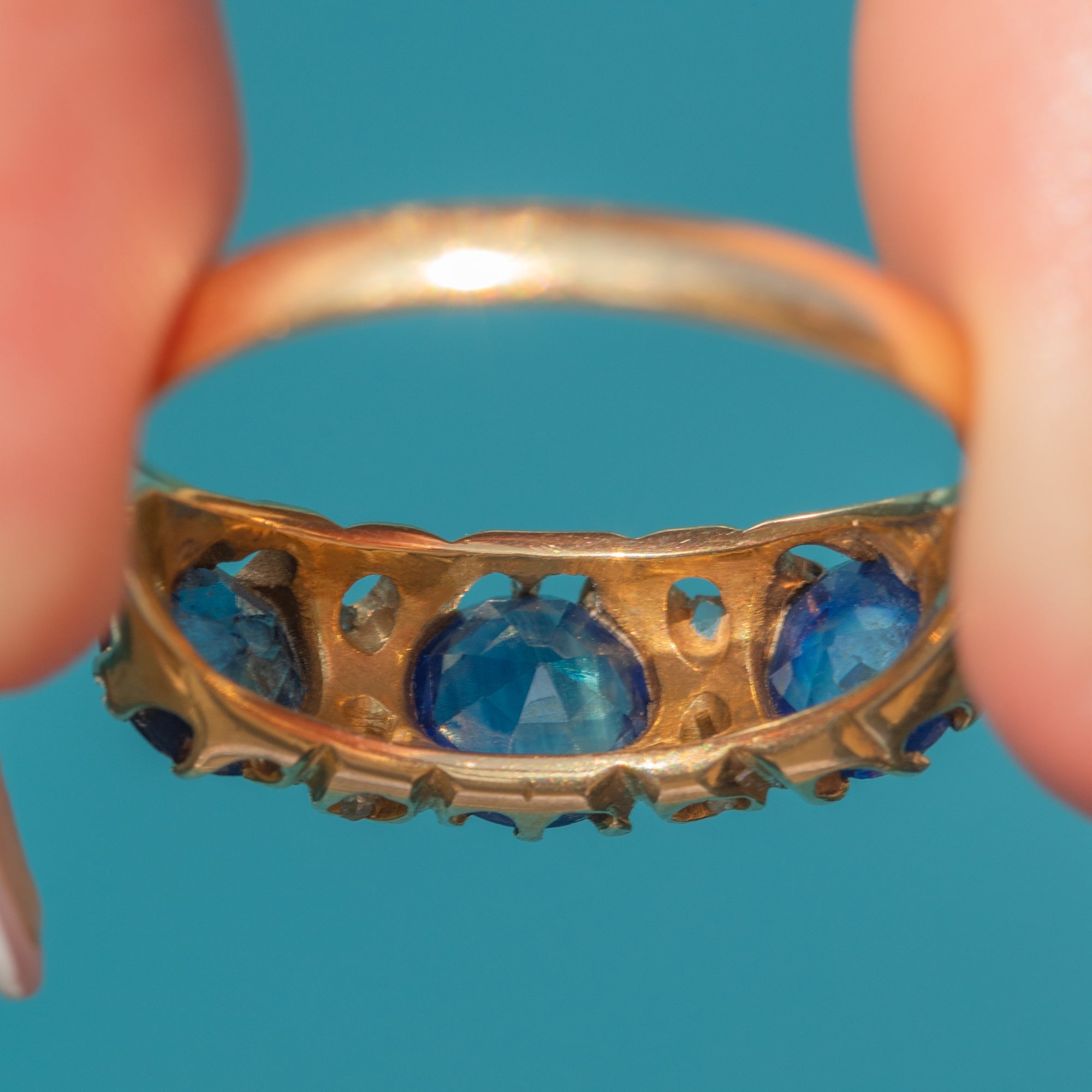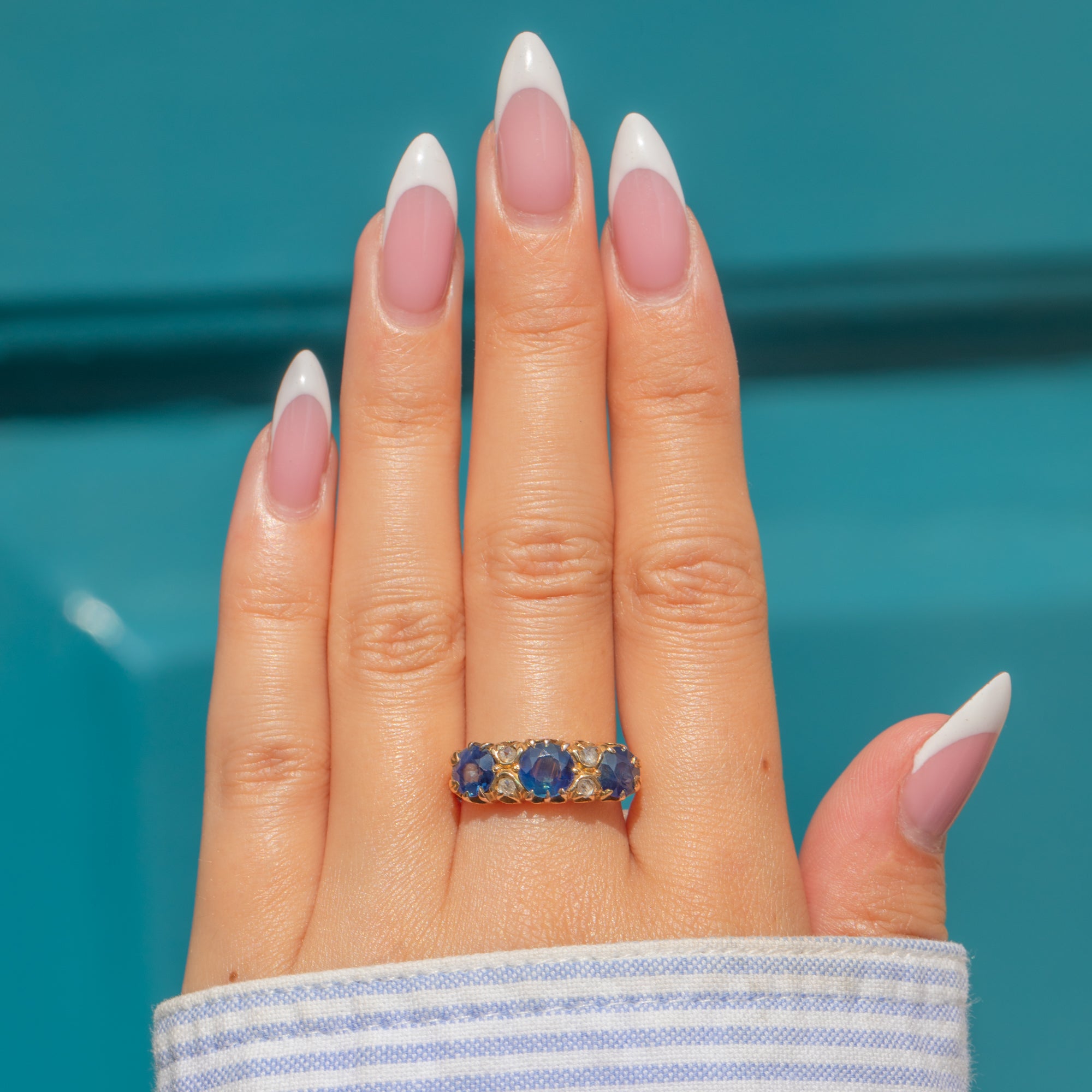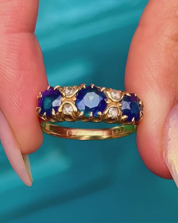 This exquisite Victorian 7-stone ring showcases three plump natural Sapphires interspersed with sparkling Diamonds, all set in rich 18ct Gold. The Sapphires display gorgeous facets, adding depth to each stone, while the Diamonds provide a timeless brilliance that complements their deep blue hue. This elegant arrangement creates a balanced and classic design, much loved in the 19th century.