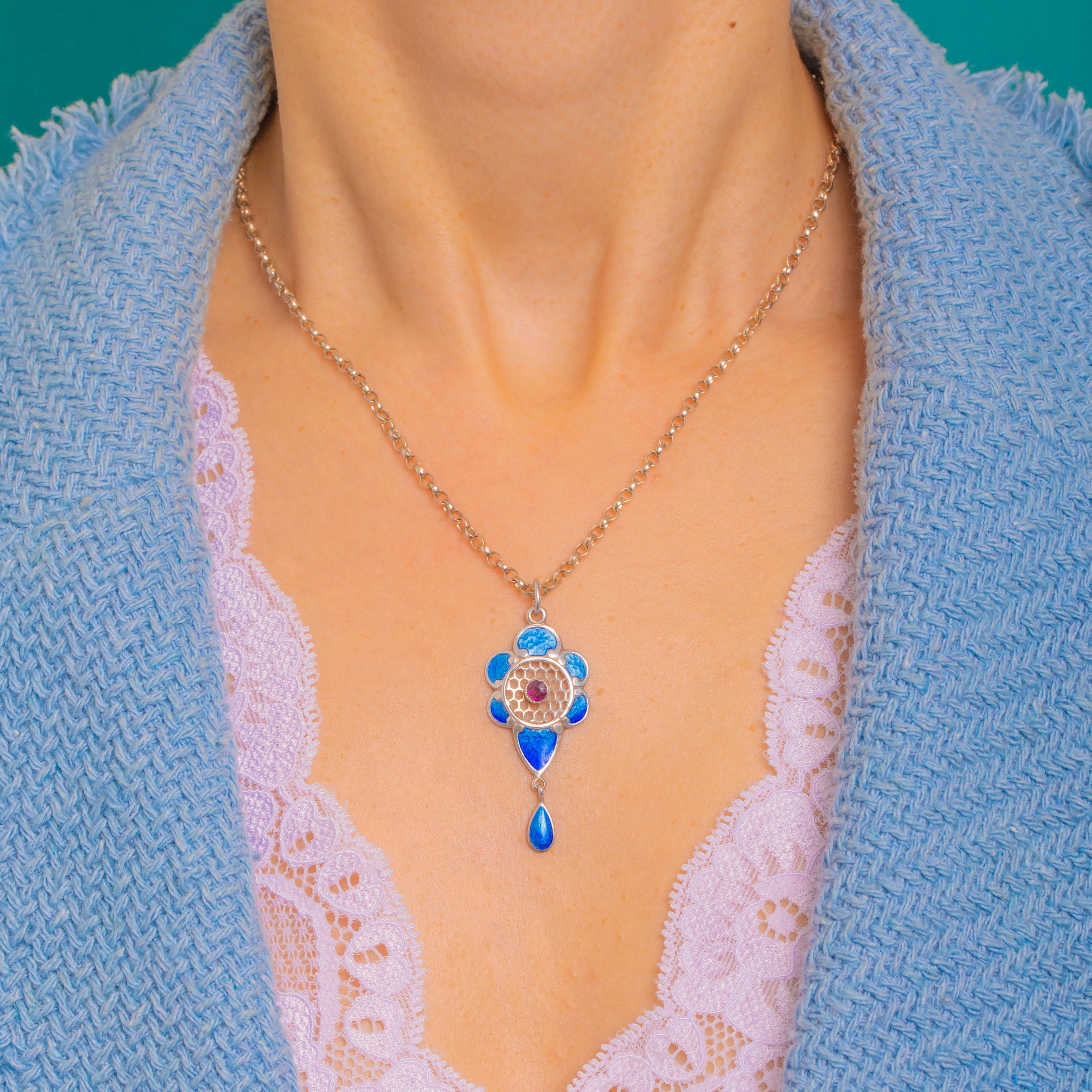 This charming Arts & Crafts pendant captures the movement and romance of the era in Sterling Silver and hand-painted blue Enamel. A stylised floral rosette frames a “honeycomb” openwork centre, graduating from deep cobalt to lighter sky tones across the petals and articulated teardrop for a vivid play of colour.