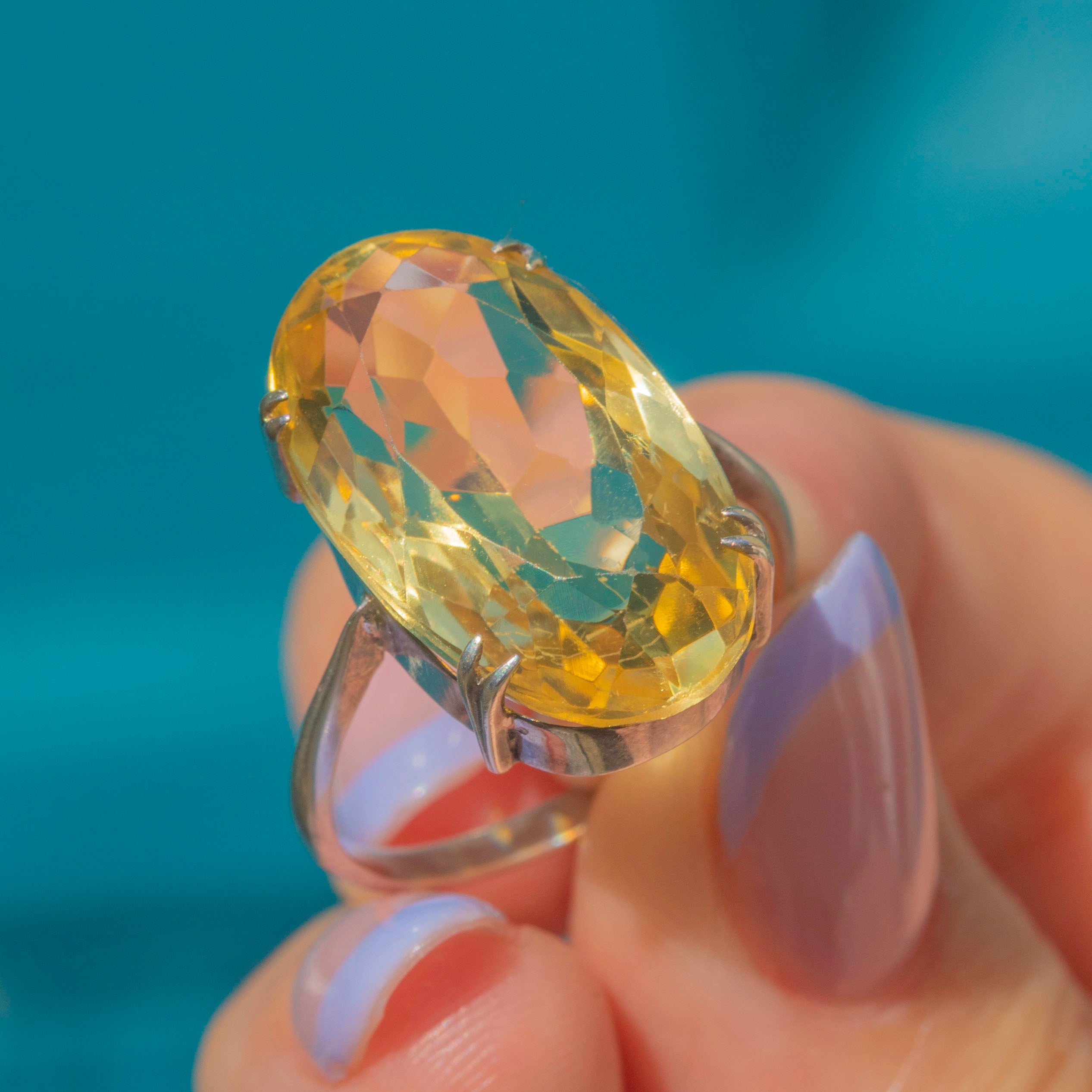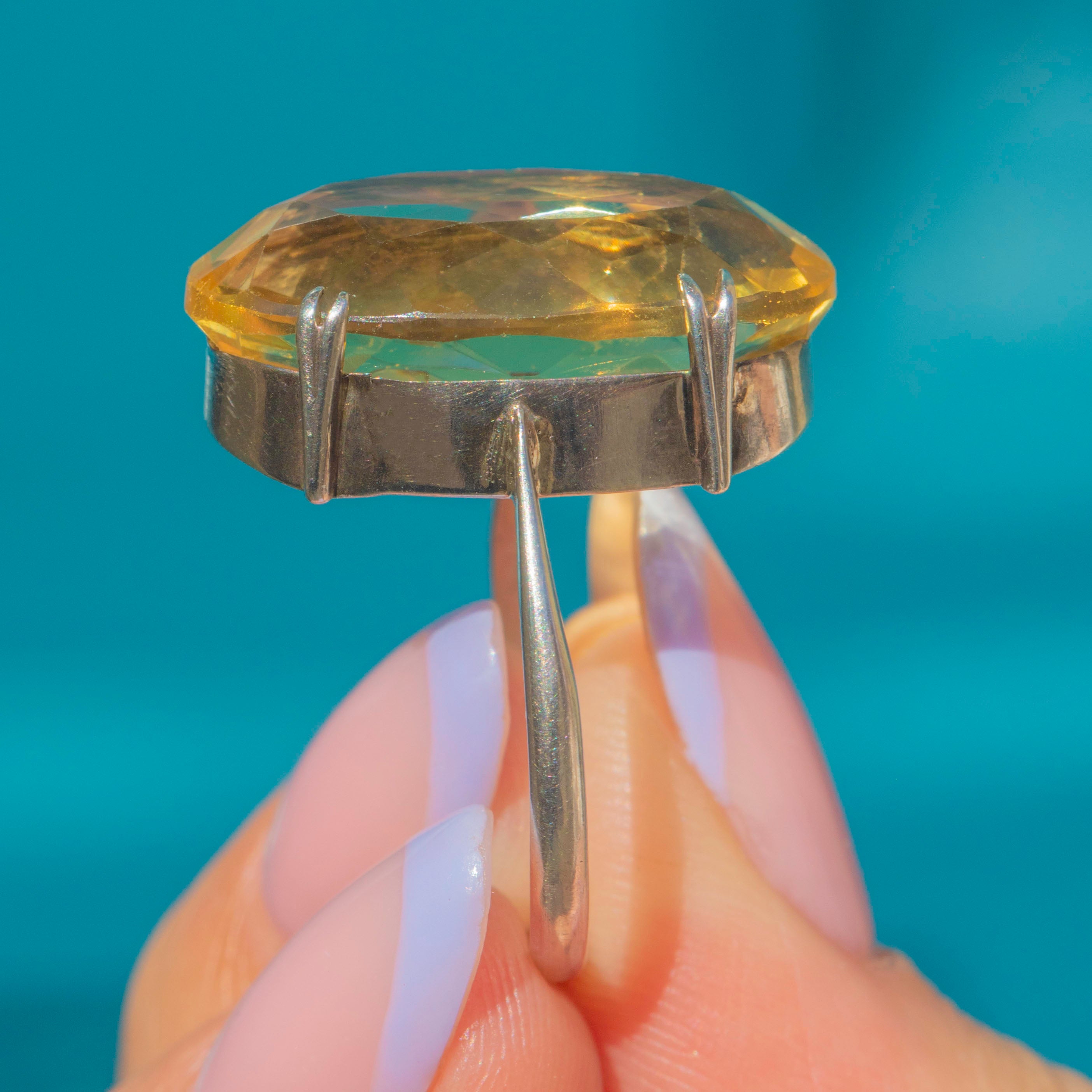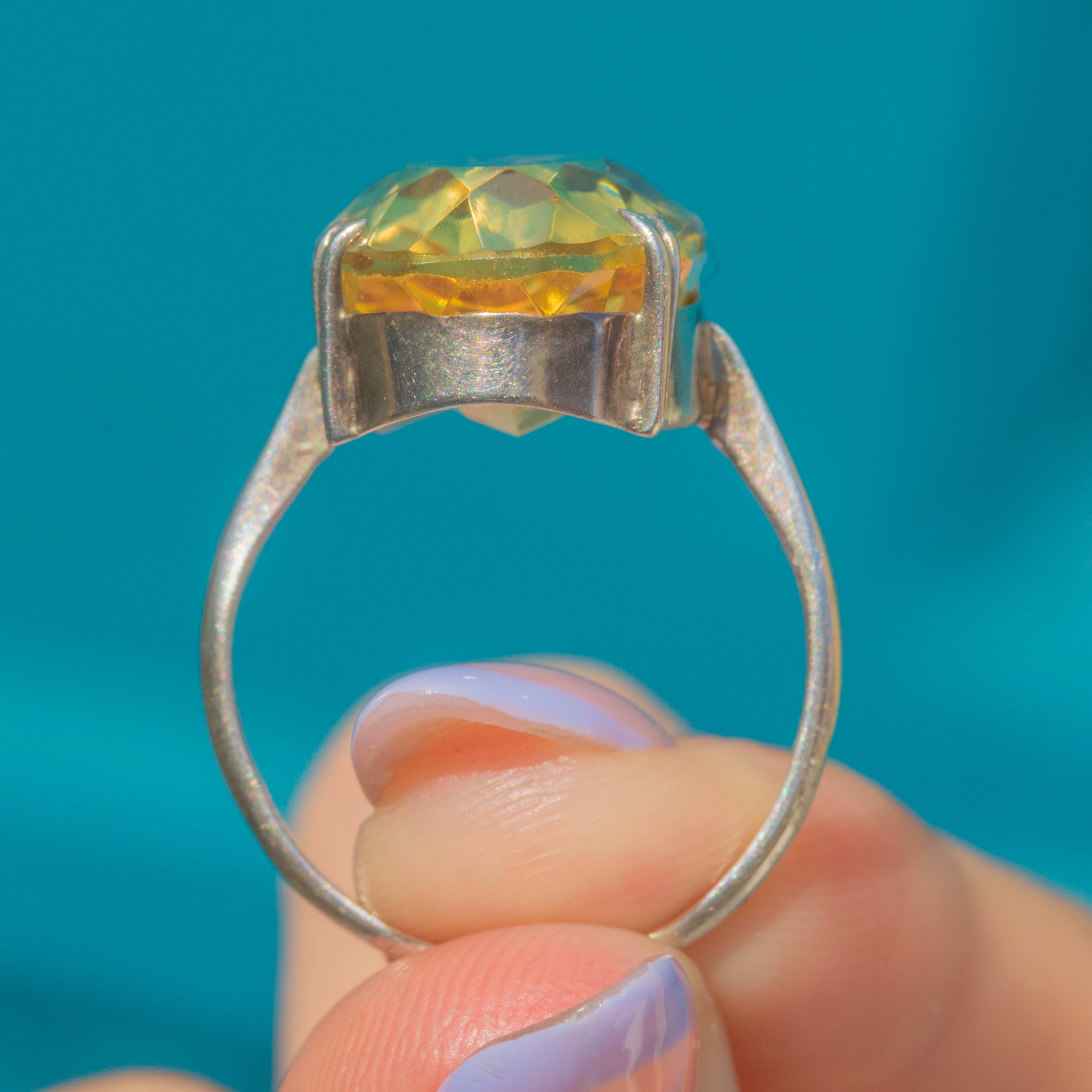 Juicy and bright, this Art Deco Silver Citrine dress ring is hard to resist! The 9.05ct Citrine boasts a splendid pastel yellow hue and gorgeous facets that shimmer magnificently as they catch the light.