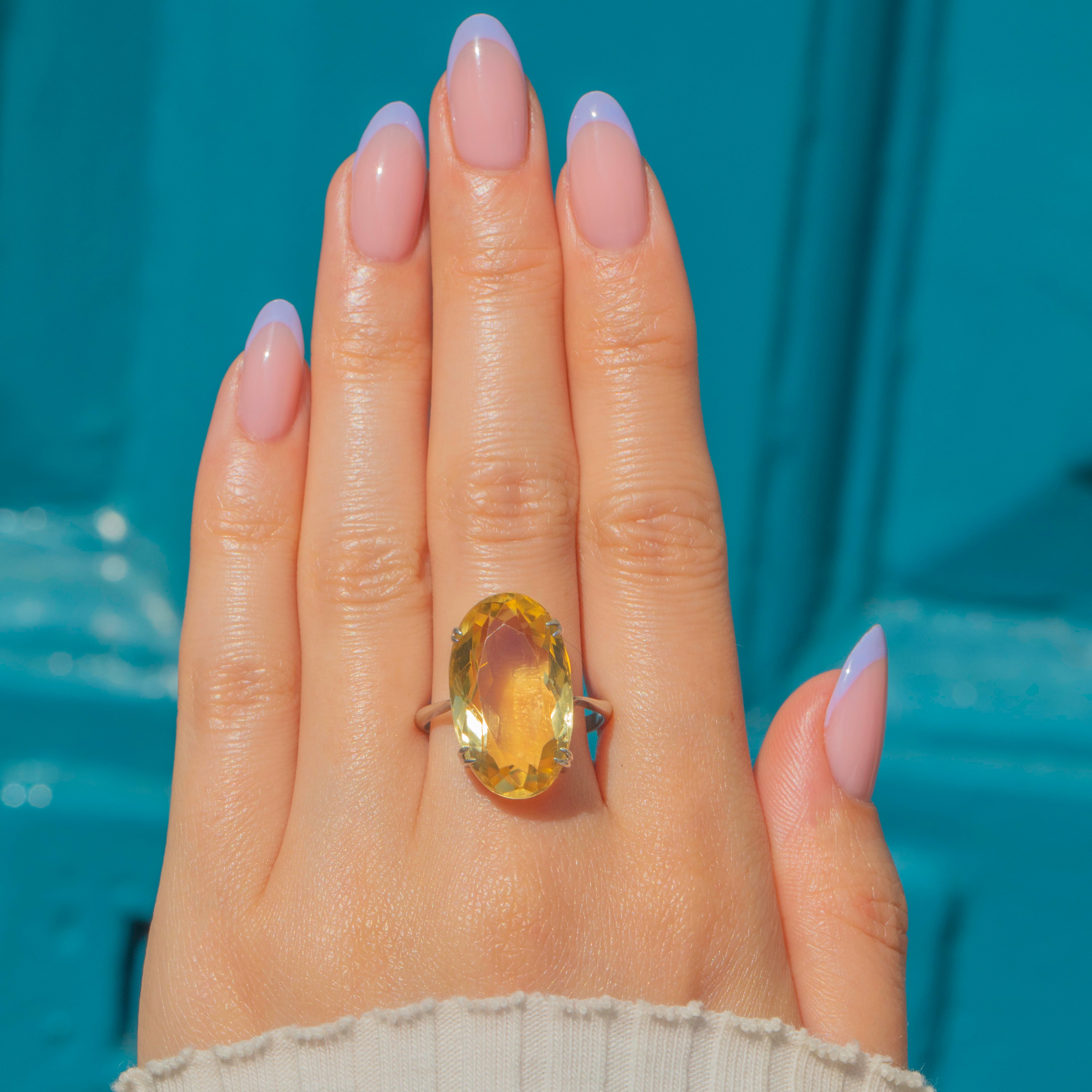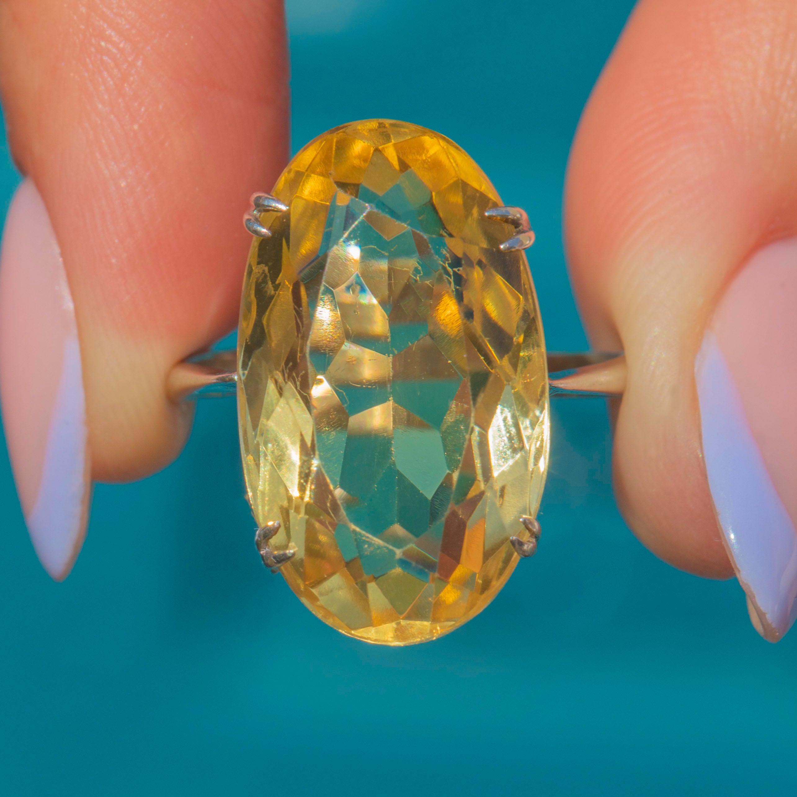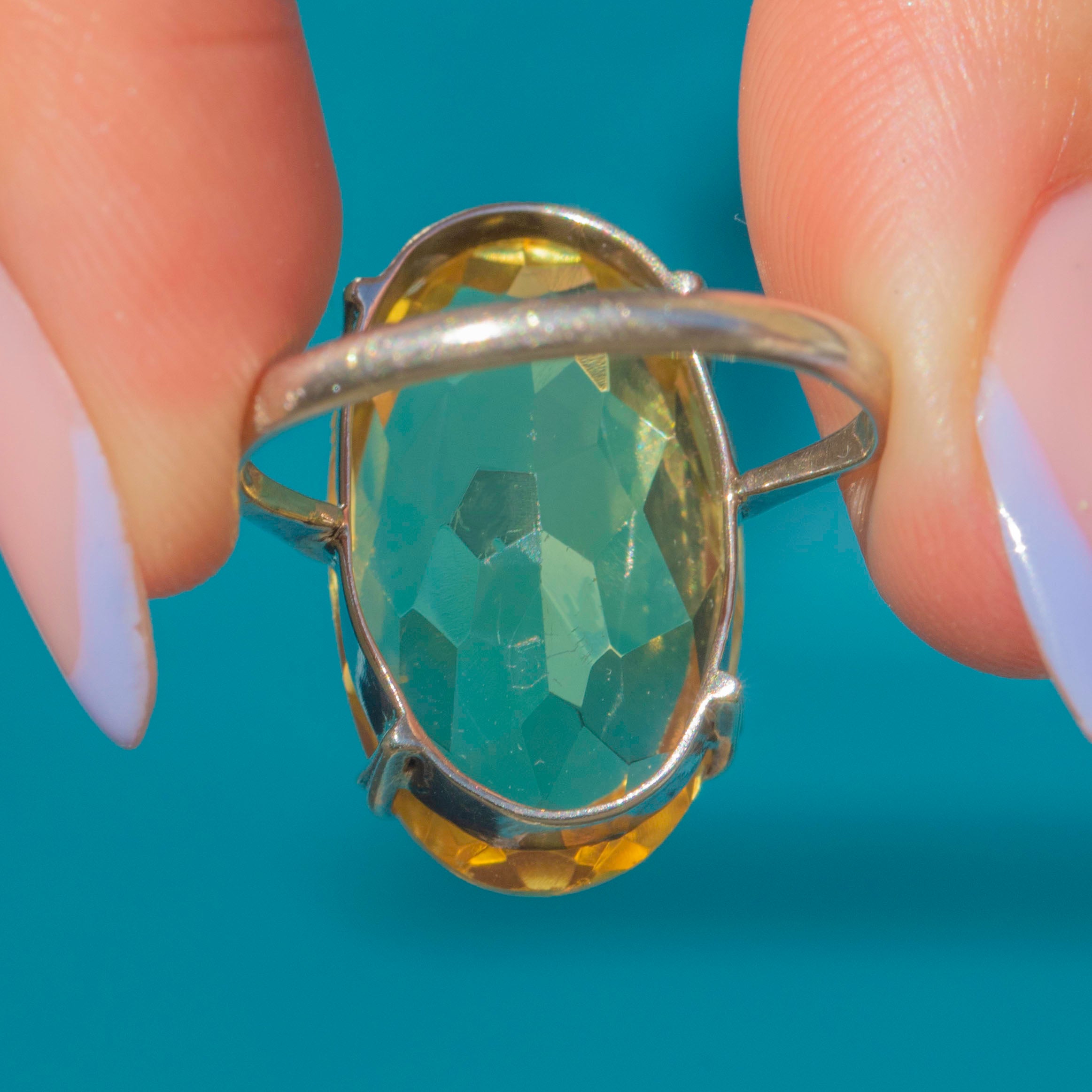 Juicy and bright, this Art Deco Silver Citrine dress ring is hard to resist! The 9.05ct Citrine boasts a splendid pastel yellow hue and gorgeous facets that shimmer magnificently as they catch the light.