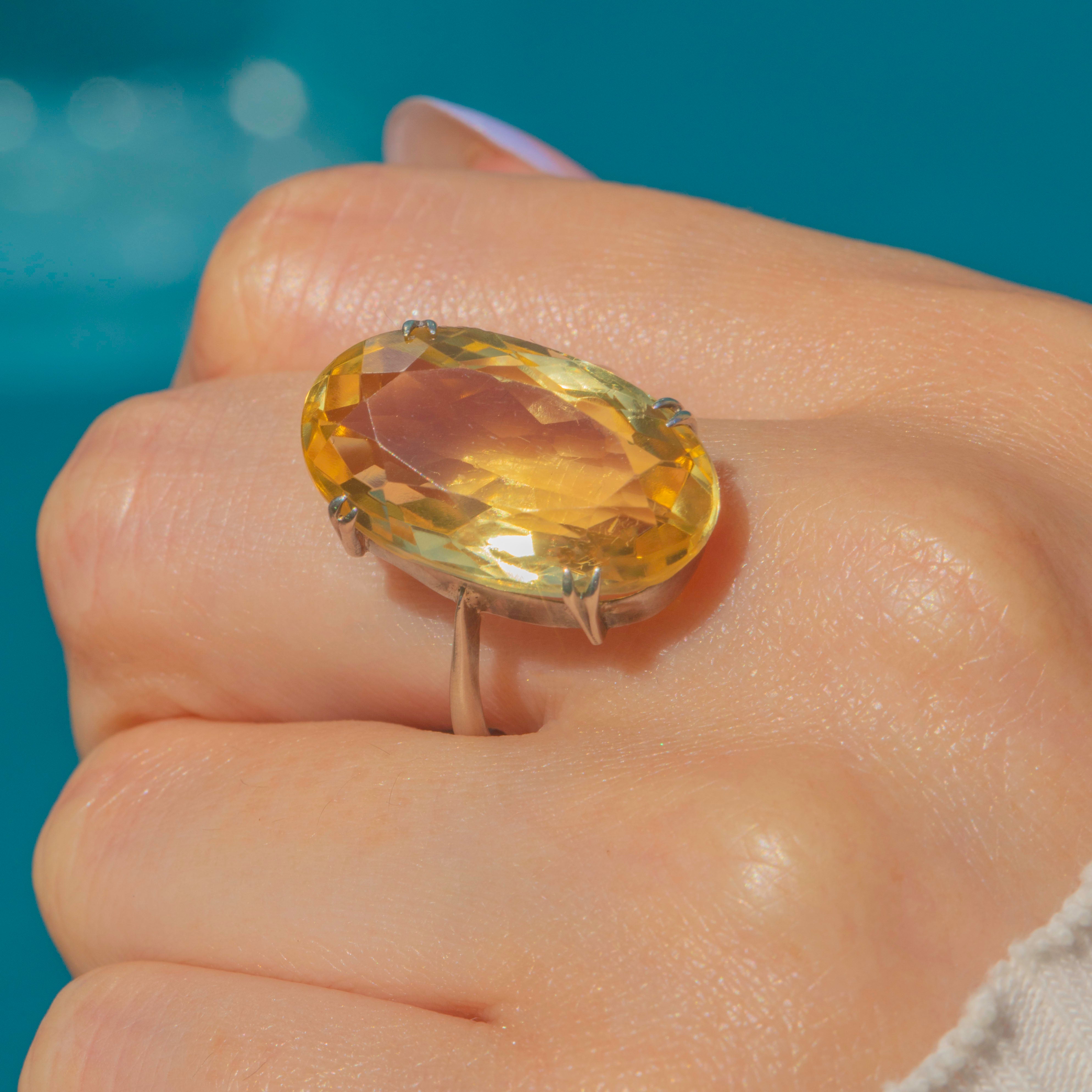 The Citrine is displayed within characteristic double claws, in classic Art Deco style, adding a refined finish to this impressive ring. Provosing exceptional finger coverage, this antique Cirtine ring is sure to brighten up your collection this summer!
