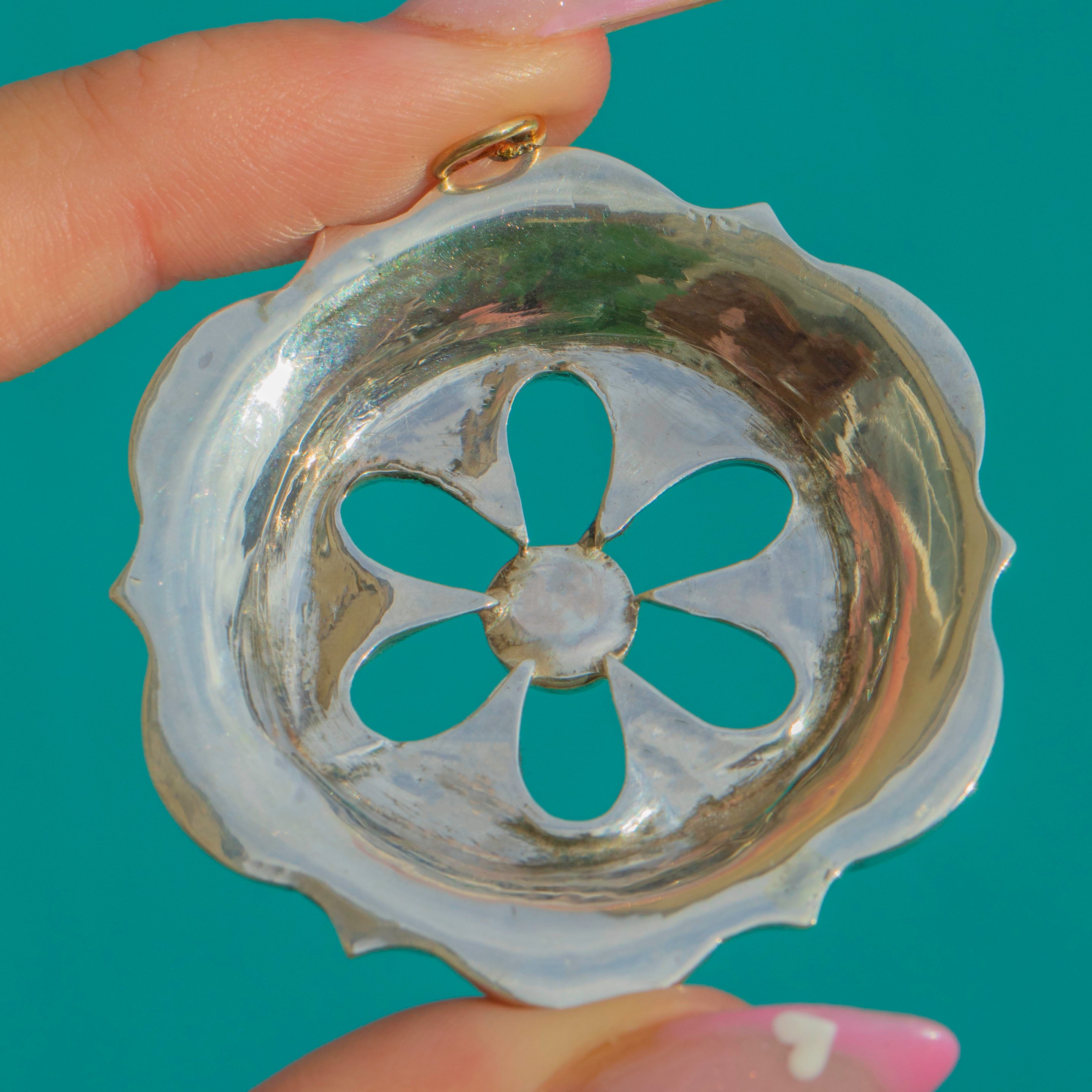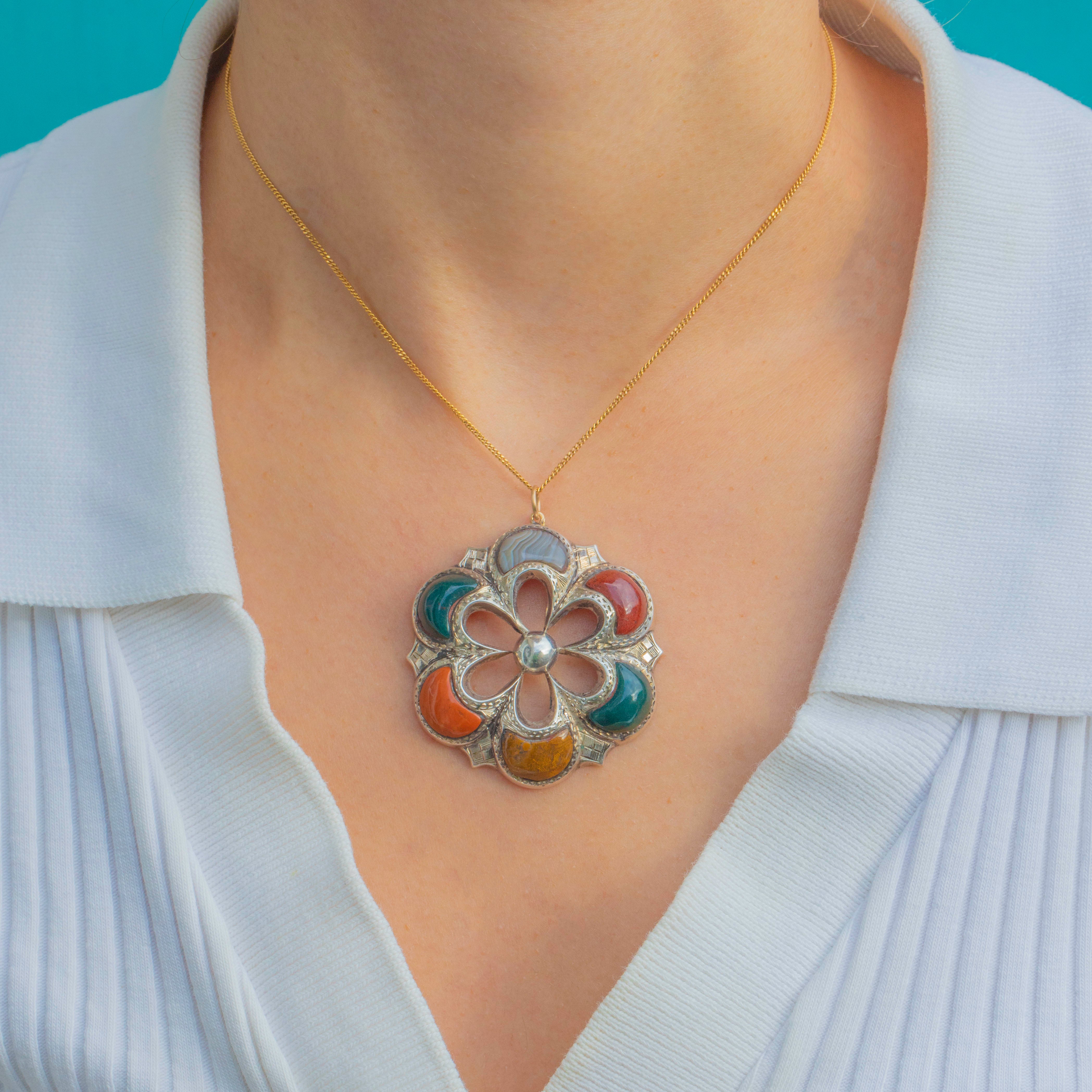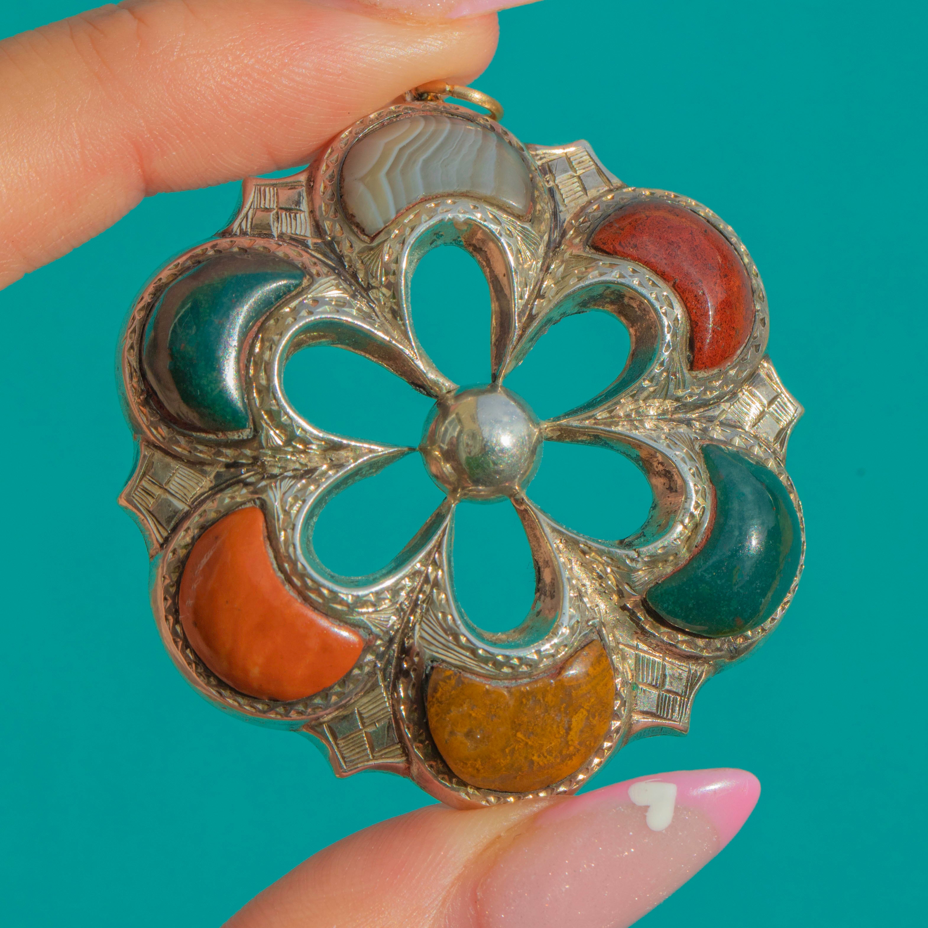This striking antique Scottish Agate pendant embodies the bold spirit of 19th-century Scottish jewellery. Crafted in solid Sterling Silver, the circular form is beautifully inlaid with richly coloured Agate panels, each showing natural banding and earthy tones unique to Scotland’s landscape.