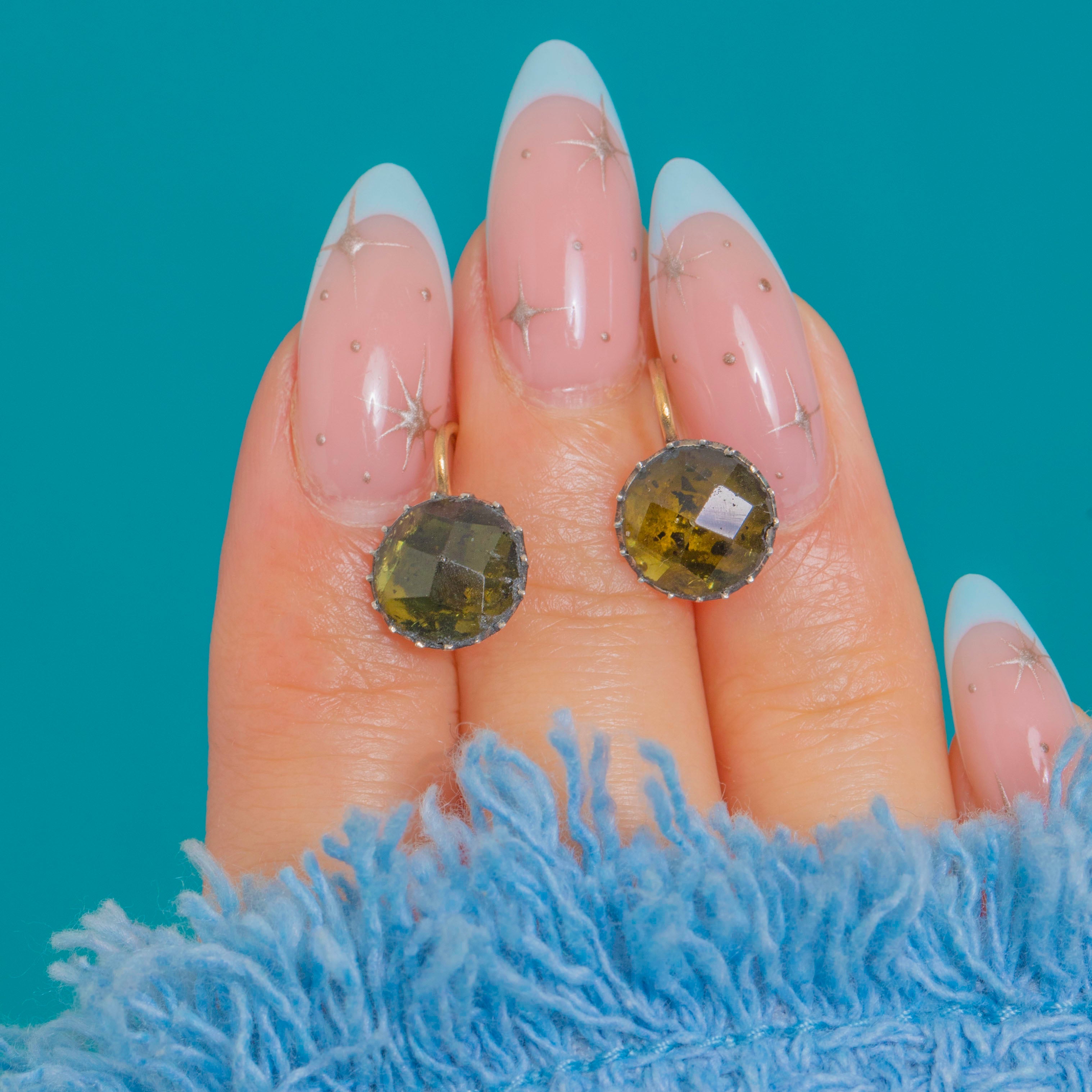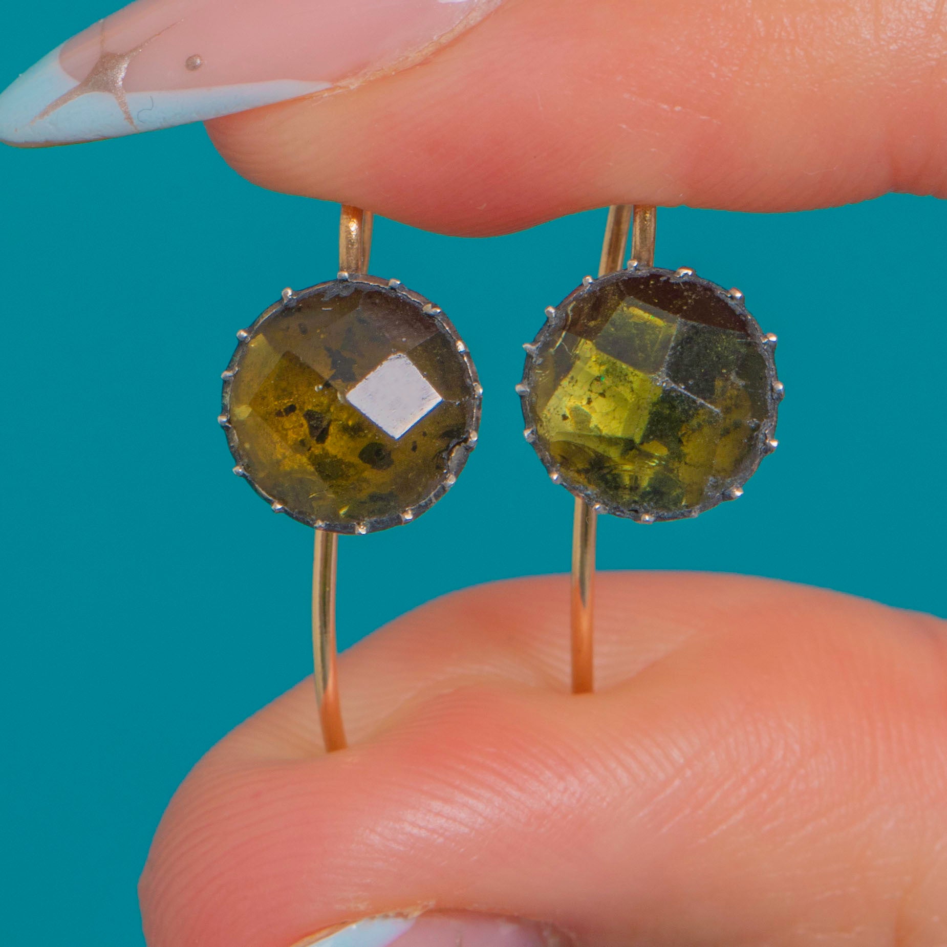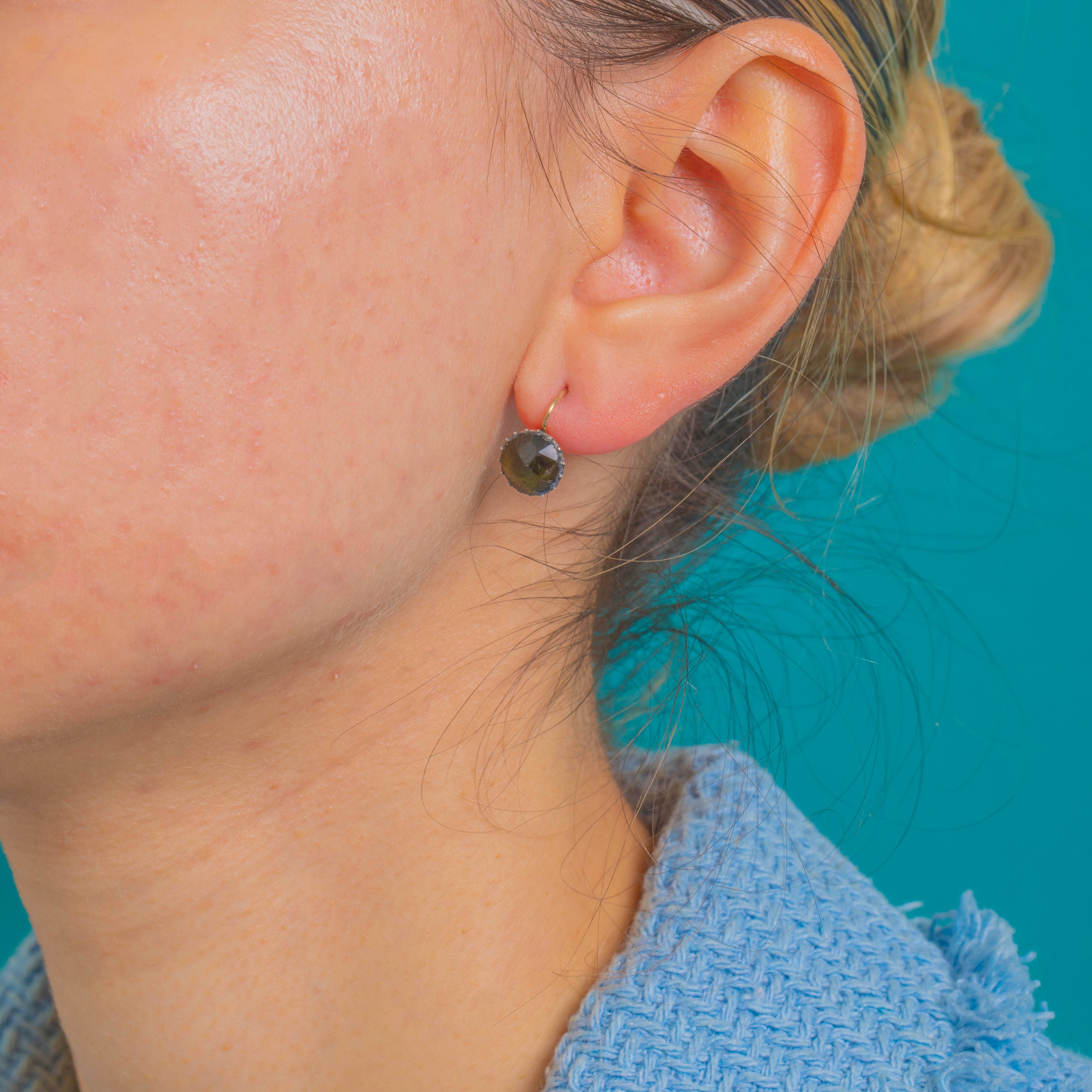 Petite, elegant and unmistakably Georgian, this charming pair of single-stone drop earrings showcases domed, old-style faceted green Glass in classic cut-down piecrust settings on 9ct Gold. The stones glow a deep olive-to-yellow green, their crisp facets lending a gem-forward, antique allure. Closed backs and the hand-wrought character of the serrations speak to early 19th-century craftsmanship and taste.
