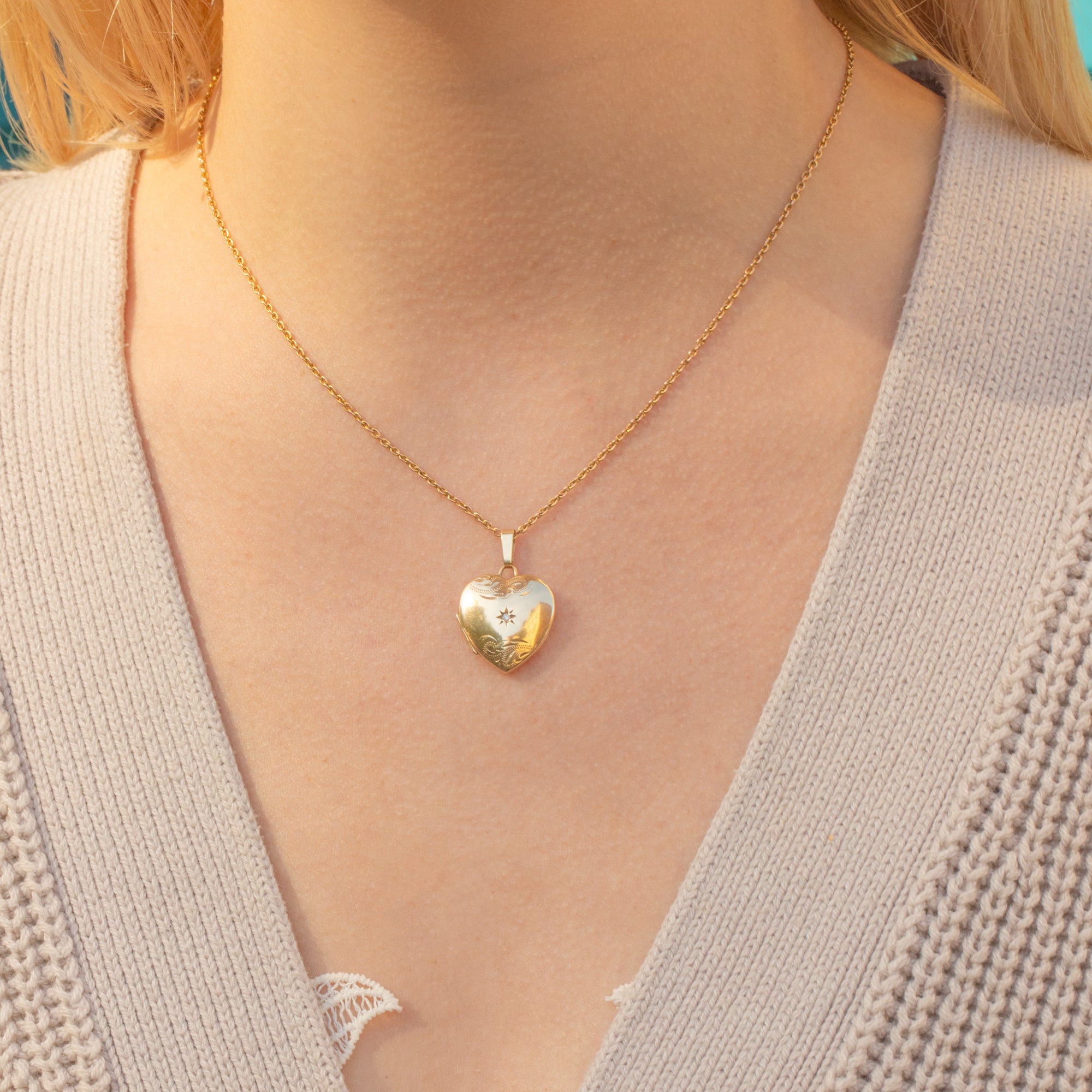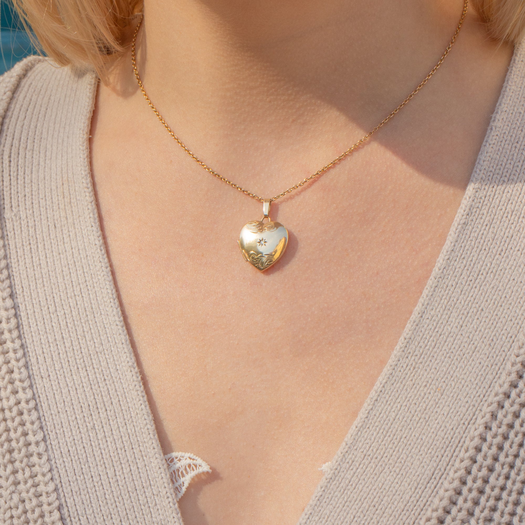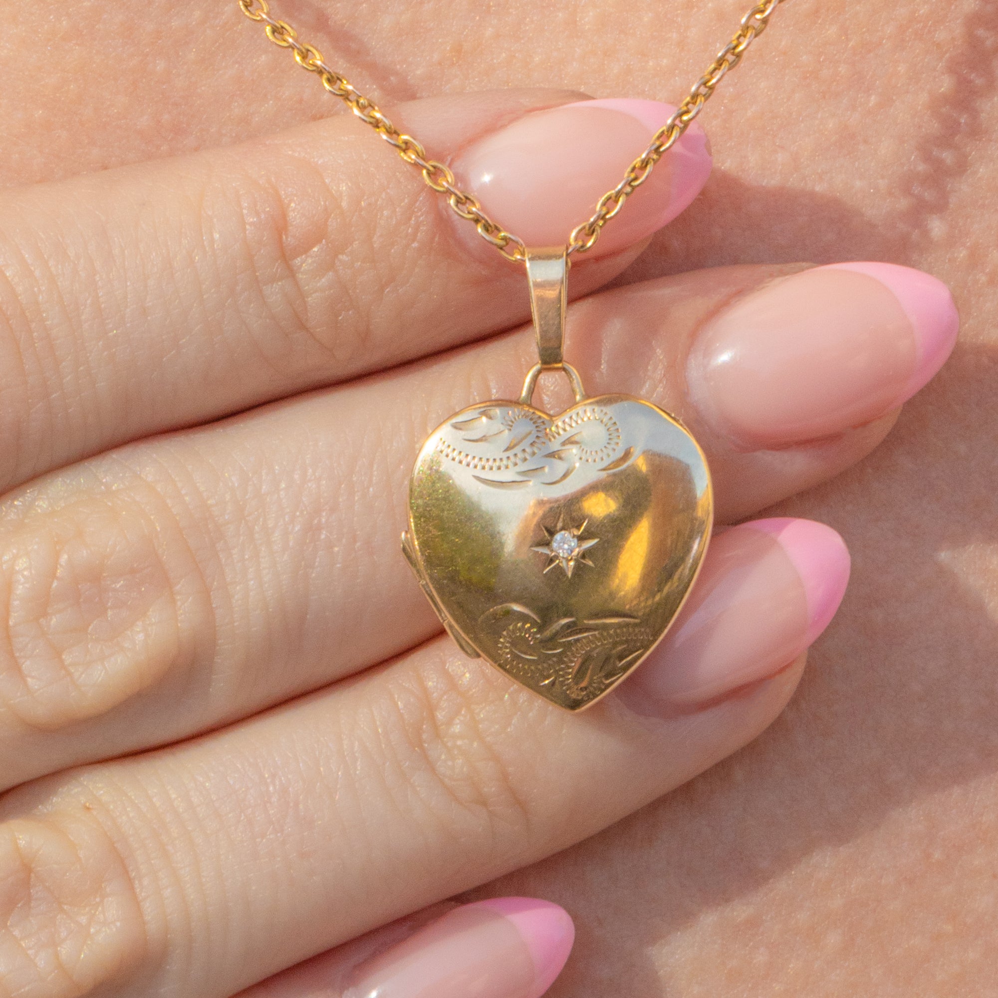 VERY GOOD. This solid 9ct Gold Diamond set heart locket is in very good vintage condition and has no noticeable wear across her front and back. While she fastens securely with a satisfying "click", she has some wear around her opening area, meaning opening her can be a bit fiddly, but rest assured she will keep your most cherished photos securely inside. Her Diamond is secure within her star setting; this solid Gold locket is perfect to be worn as part of your everyday wardrobe!