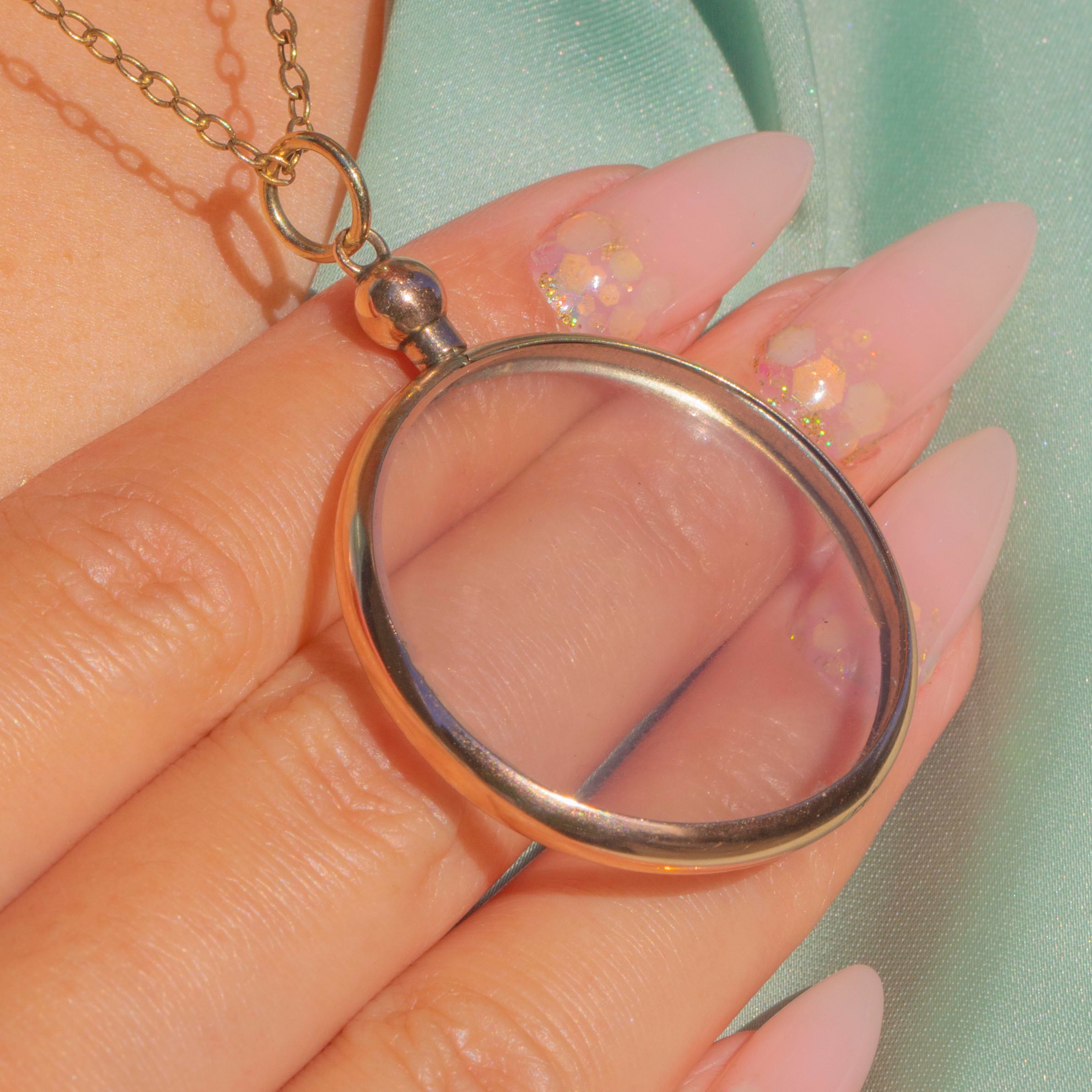 A striking Vintage round locket in 9ct Gold, fitted with clear Perspex panels. This oversized piece is designed to hold and display photographs, pressed flowers or tiny keepsakes, with a simple yet bold Gold bezel that keeps the focus on what’s inside.