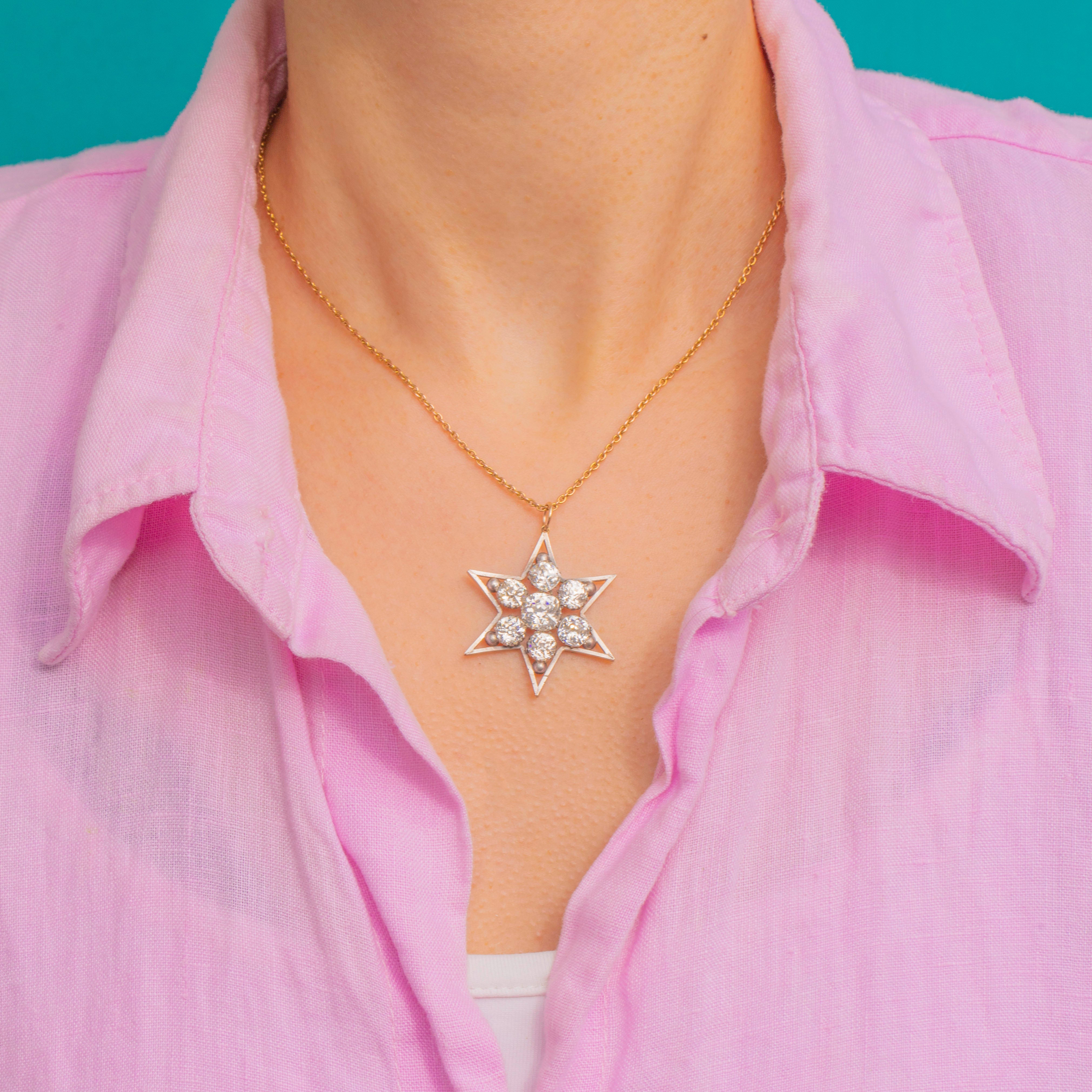 A celestial classic, this Victorian Paste star pendant shimmers with timeless romance. The openwork six-point star is crafted in Silver, its sculptural outline embellished with tiny bead terminals and a cluster of bright, colourless Paste stones that glow with candlelit fire.