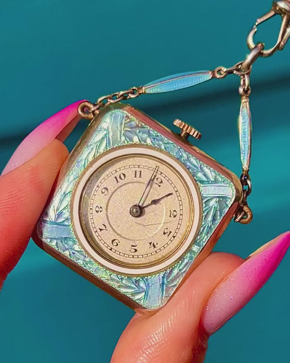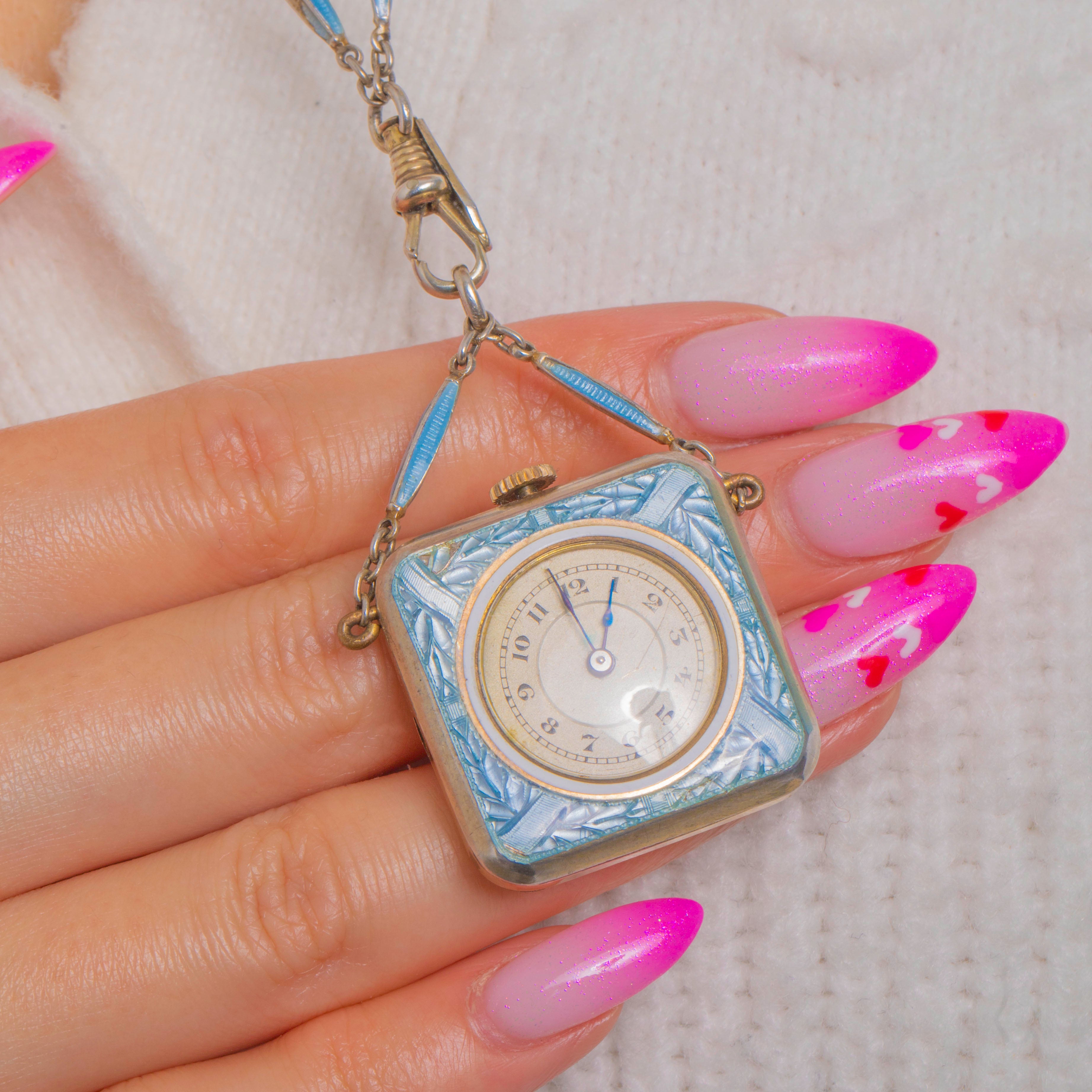 A dreamy wash of icy blue guilloché Enamel lights up this Edwardian pocket watch pendant, paired with its matching 22" Enamelled chain. The compact square case frames a circular cream dial with elegant blued-steel hands, while stylised ribbon-and-foliate corners dance over the engine-turned ground beneath the translucent Enamel. To the reverse, a flowing script monogram “LNK” lends a beautifully personal touch.