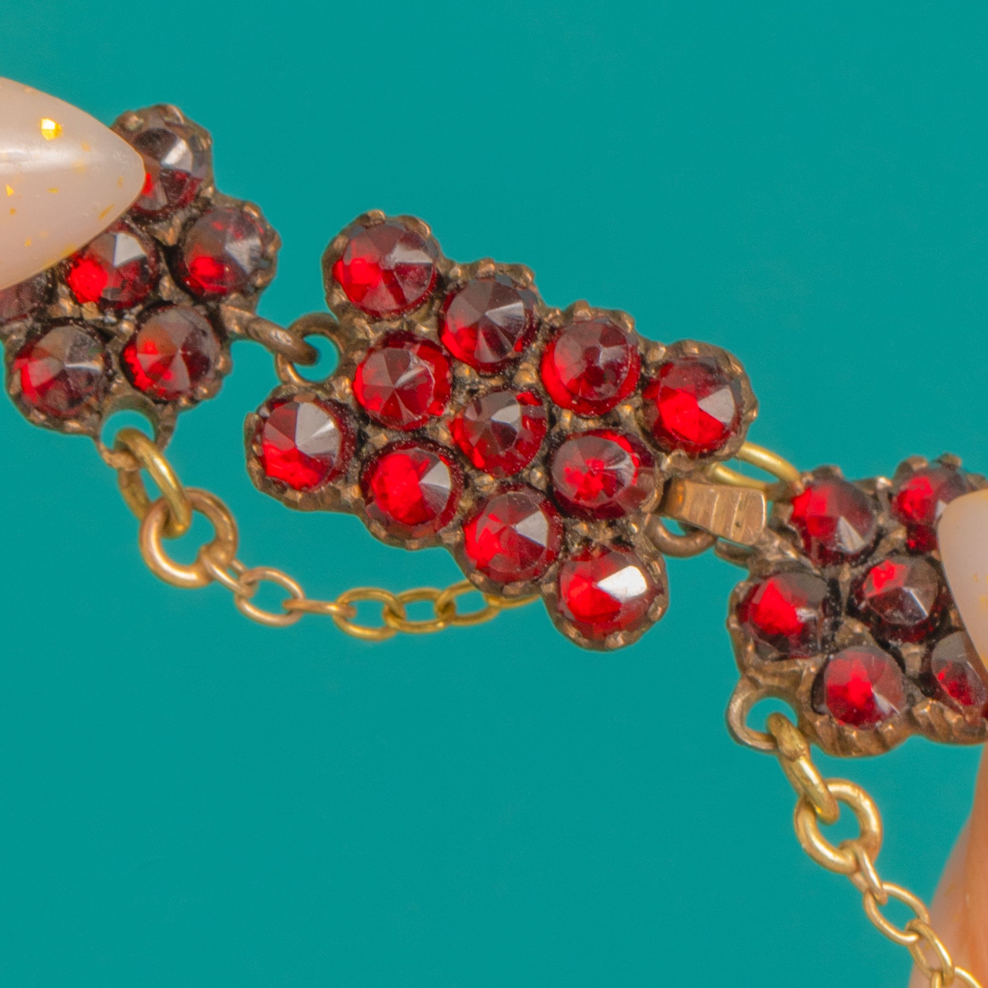 The settings are closed-back, typical of late 19th-century Bohemian Garnet work. The metal tests as Garnet Gold, complemented by a 9ct Gold safety chain for added security. A sympathetic antique patina enhances the deep, saturated red of the faceted Garnets, bringing warmth and intensity to every facet.