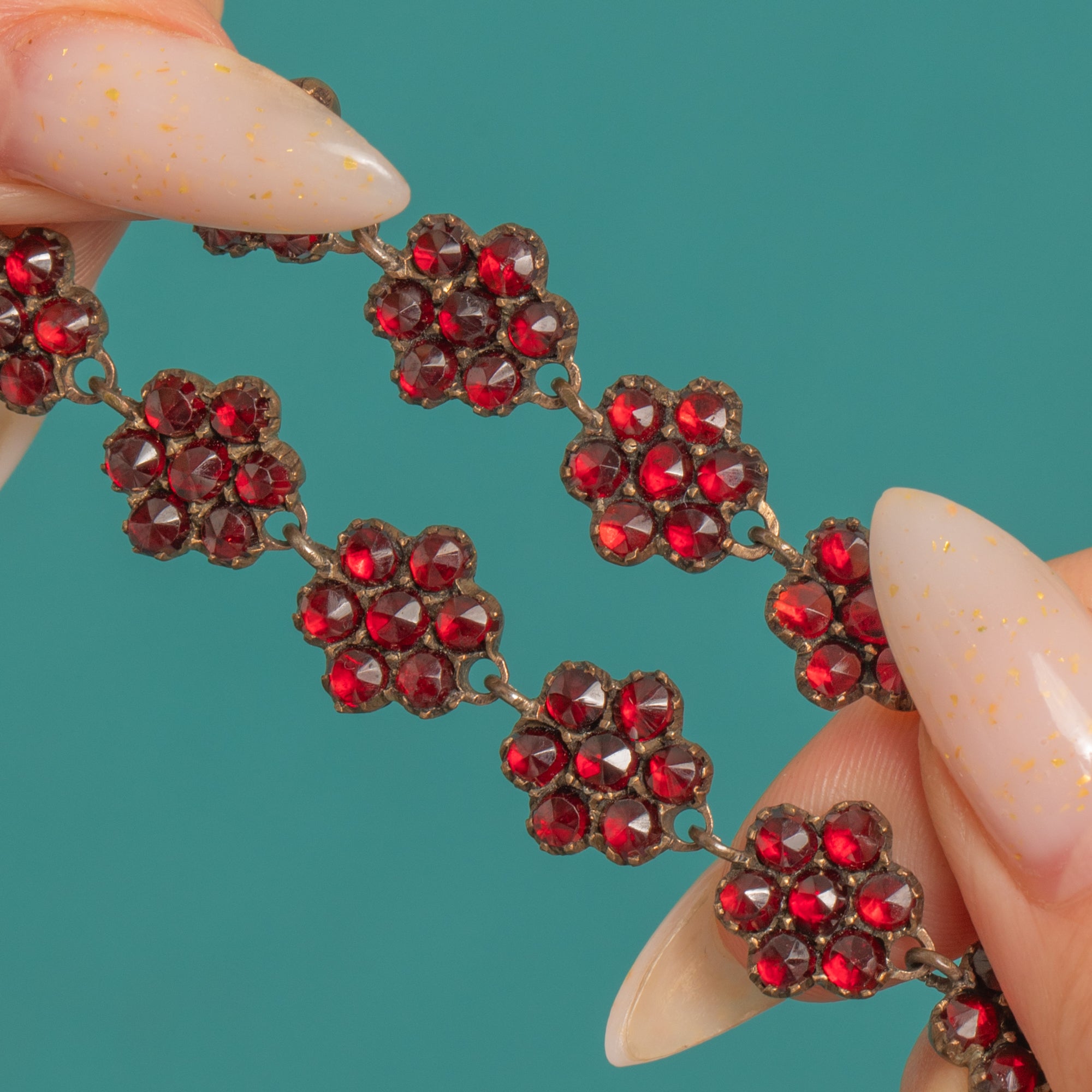 A spectacular Victorian Bohemian Garnet stars necklace, c.1890, alive with a constellation of starburst and rosette clusters that drape fluidly along the neckline. Dense pavé-style Garnet settings culminate in a graduated central girandole of three elegant drops, creating a richly decorative, collar/princess-length silhouette with dramatic Victorian allure.