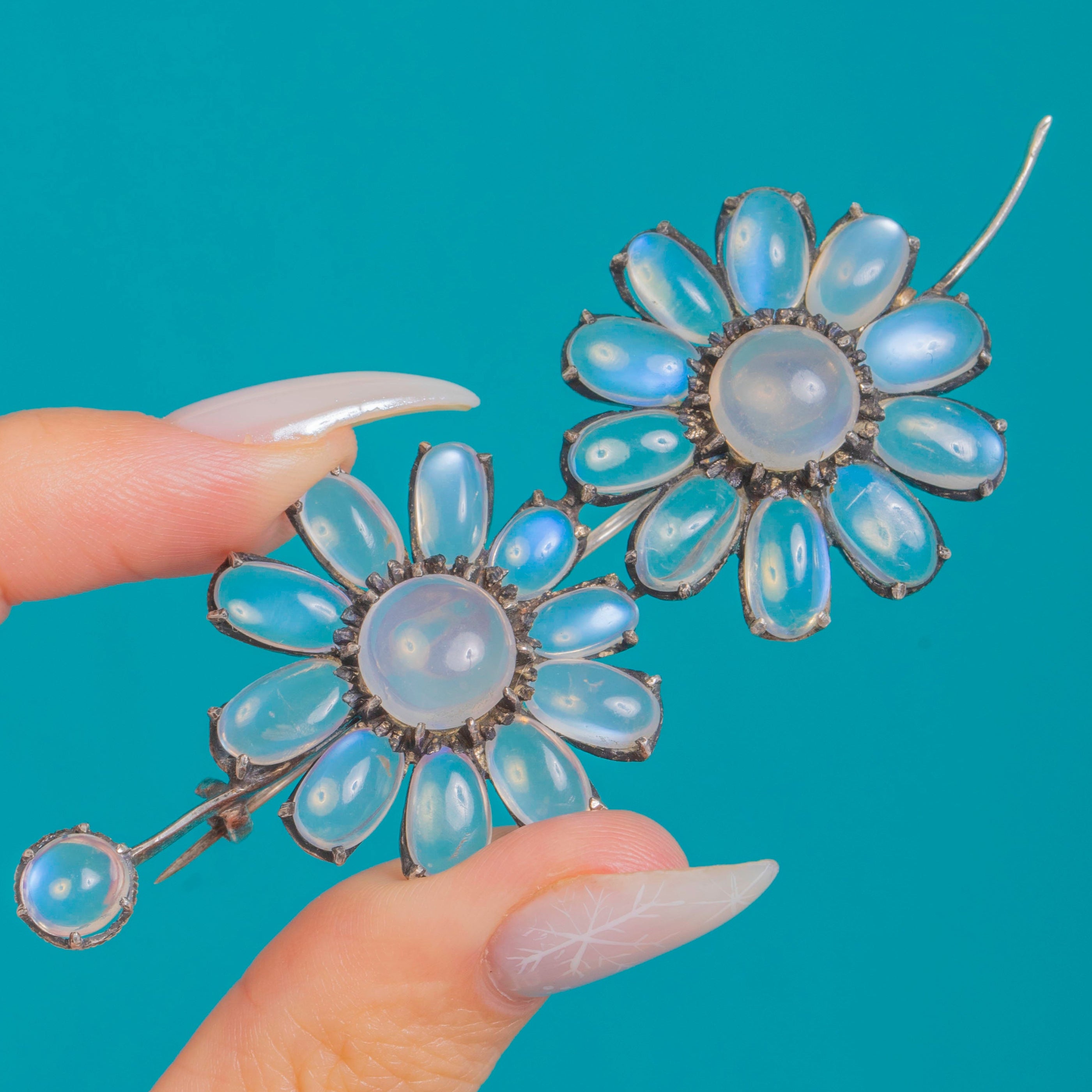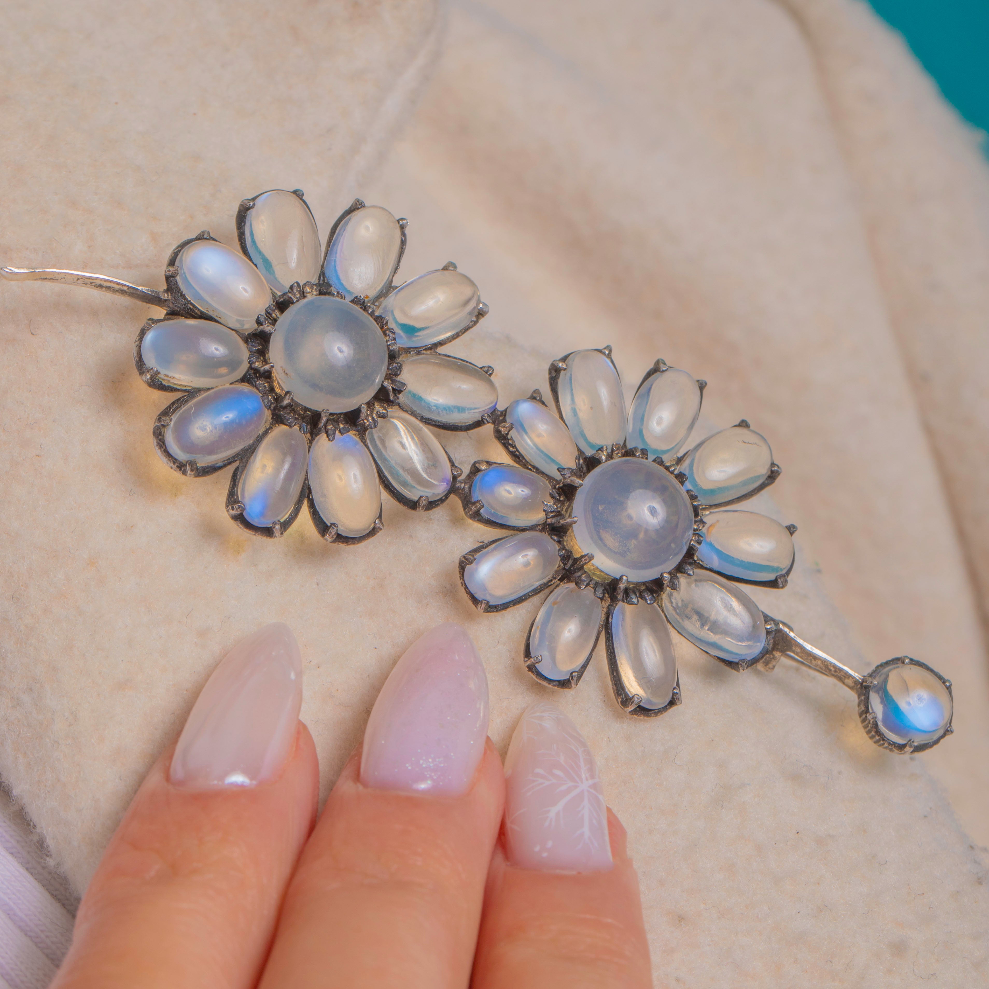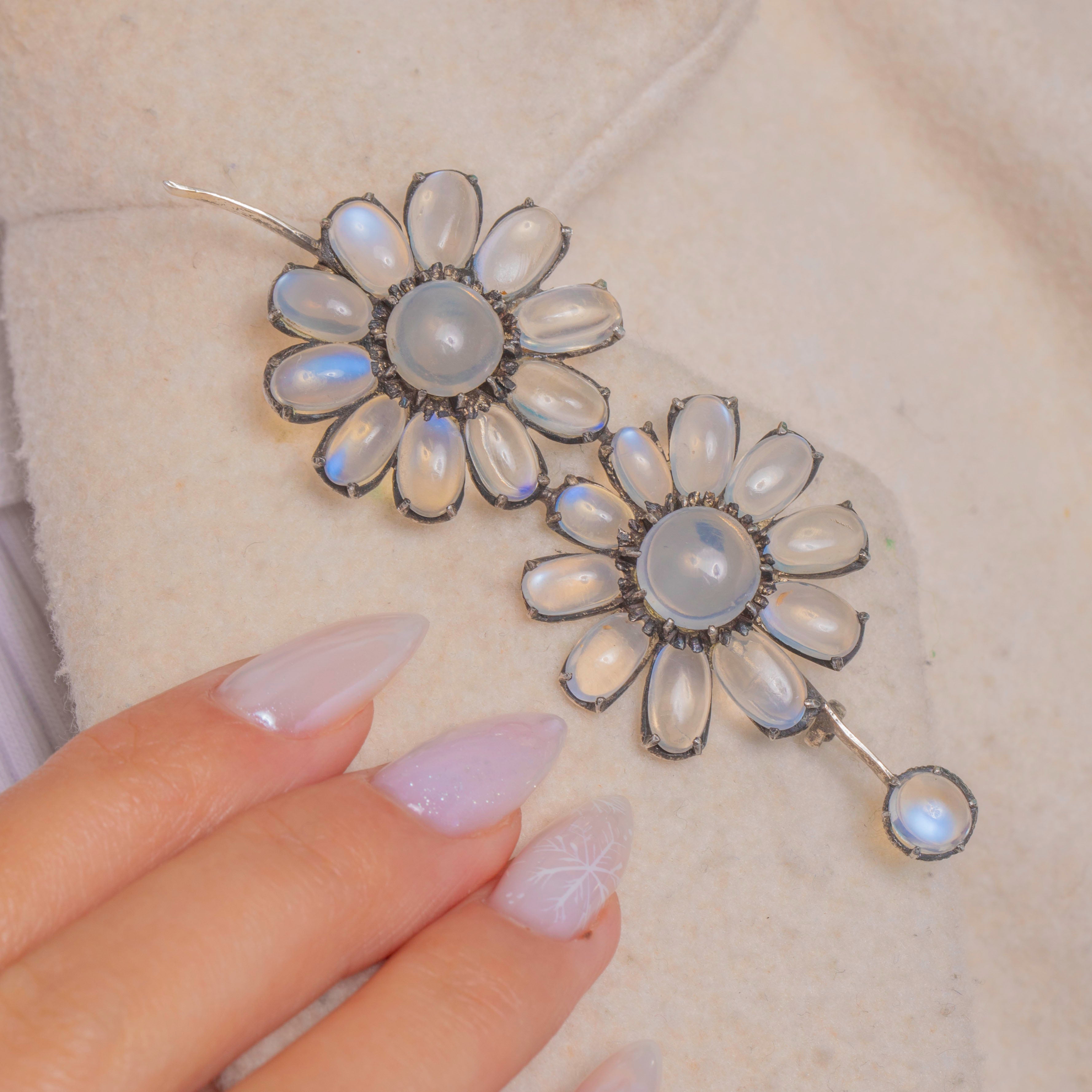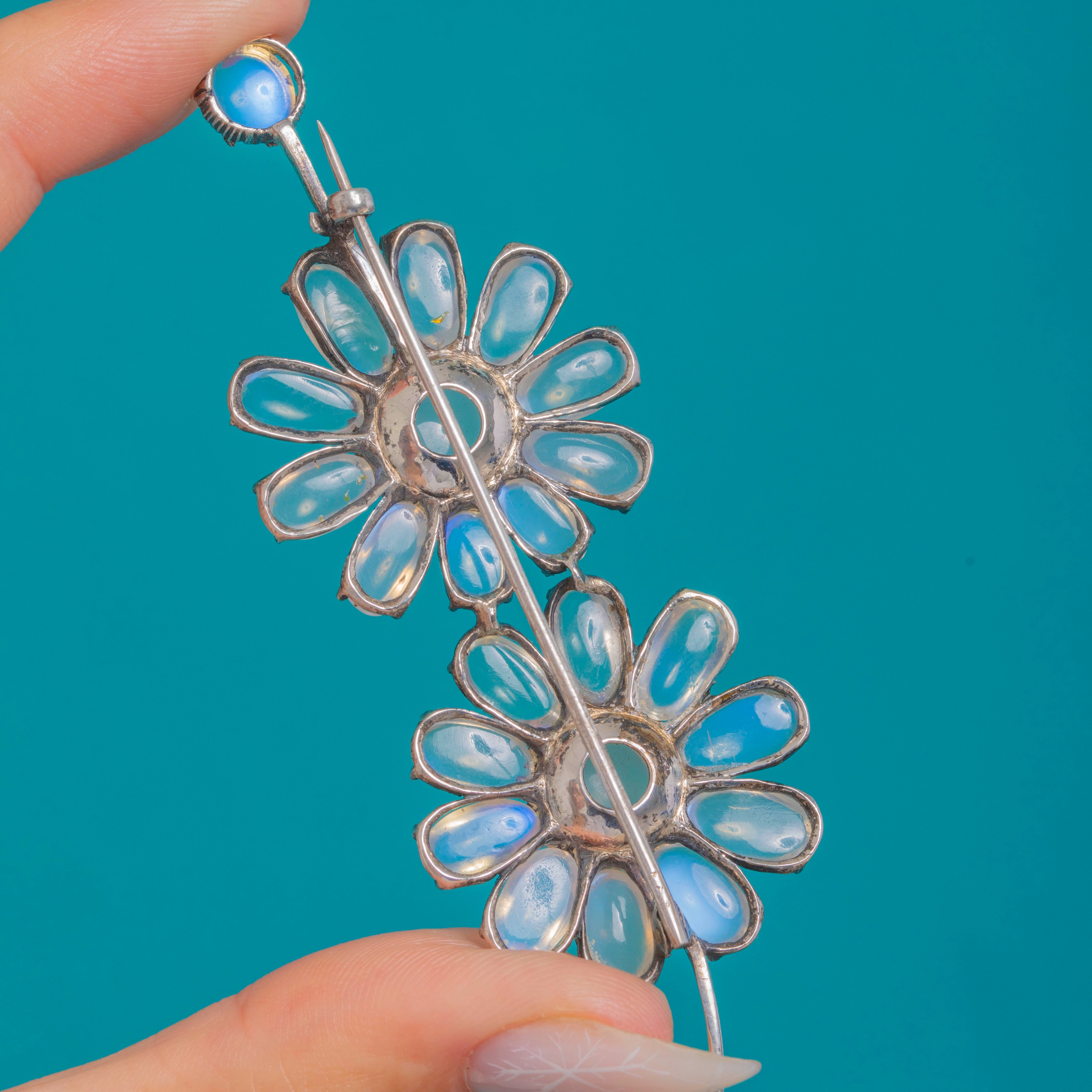 Dancing with soft, ethereal glow, this Arts & Crafts Moonstone flower spray brooch is crafted in cool Sterling Silver and alive with luminous adularescence. Two daisy-like blooms and a sweet bud unfurl along a graceful curved stem, each “petal” and centre gem set in characterful claws that lend depth and antique romance.