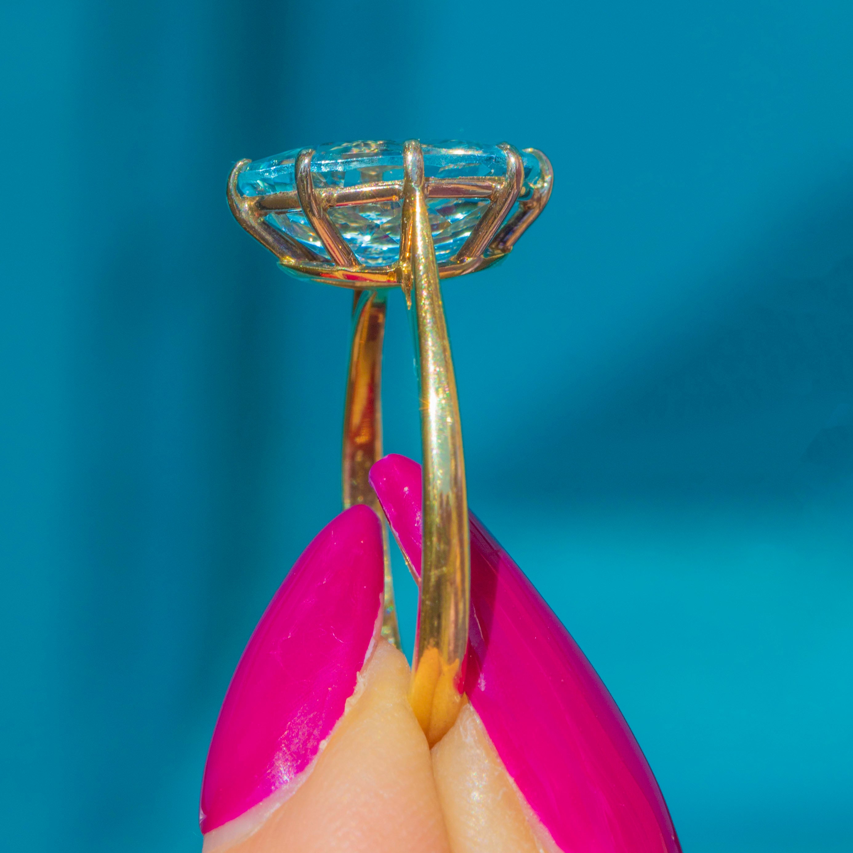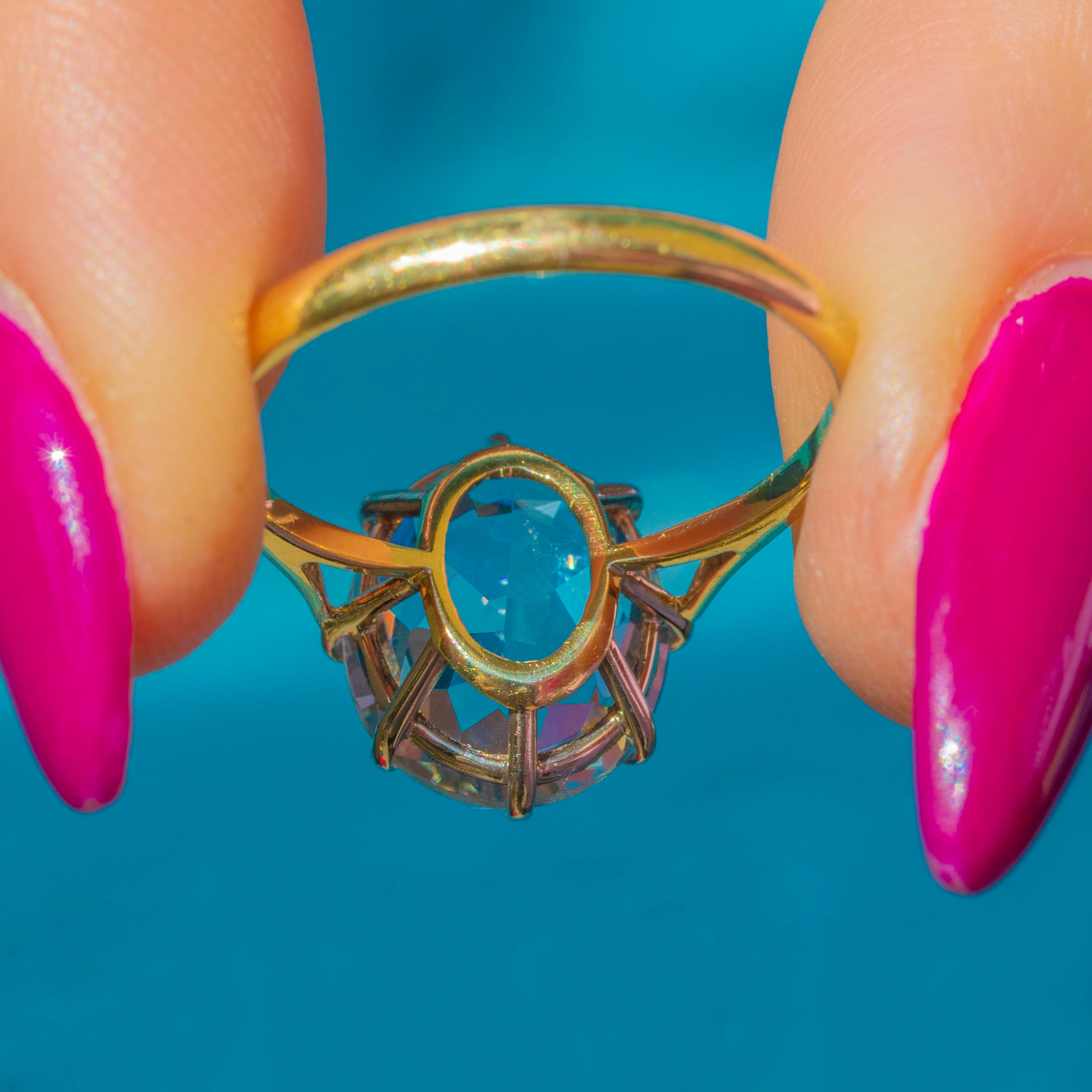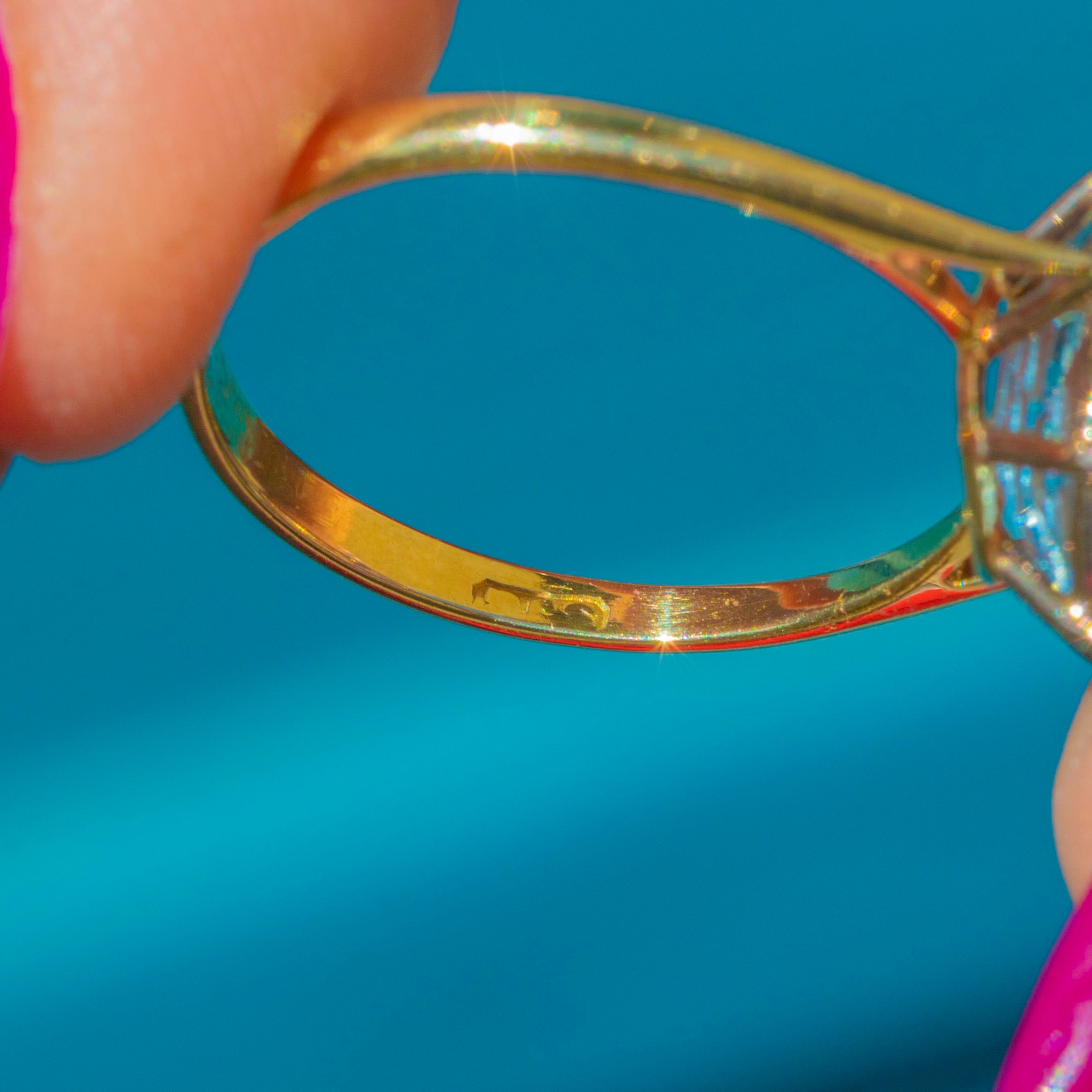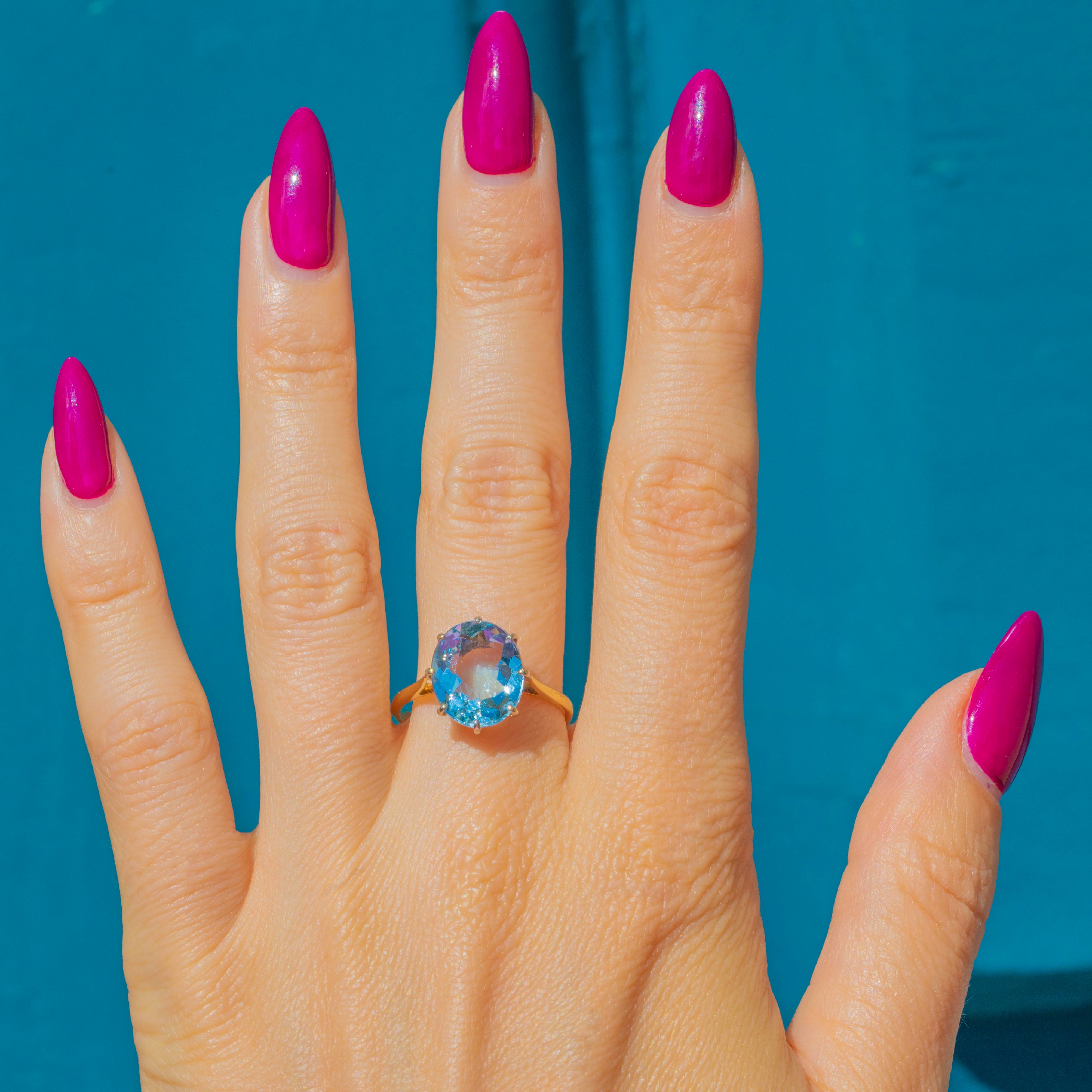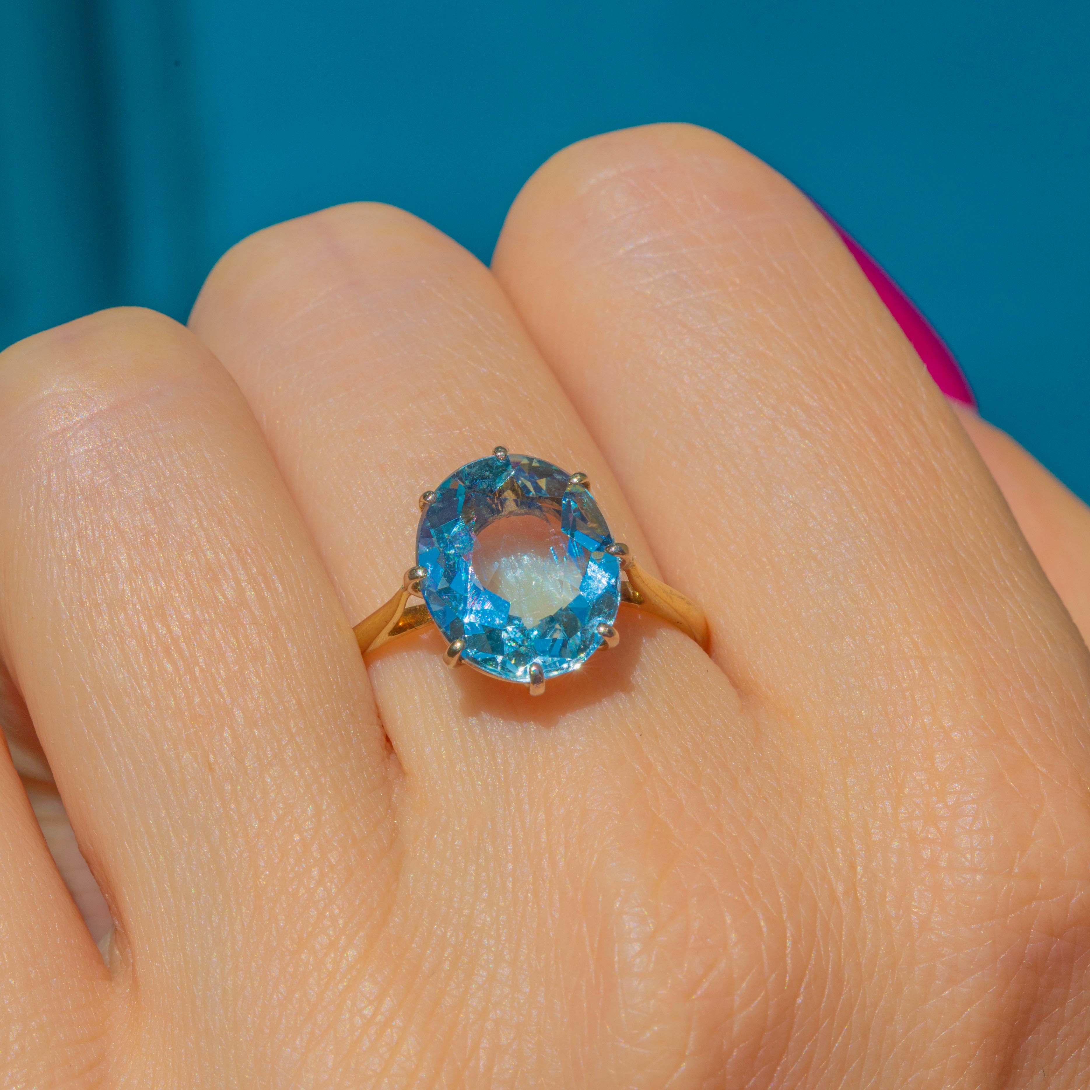 The Aquamarine is set within buttery 18ct Gold claw settings and rests on a smooth, glossy band, providing ample finger coverage. This striking ring is fully hallmarked and dated to 1983 - it simply radiates vintage charm!