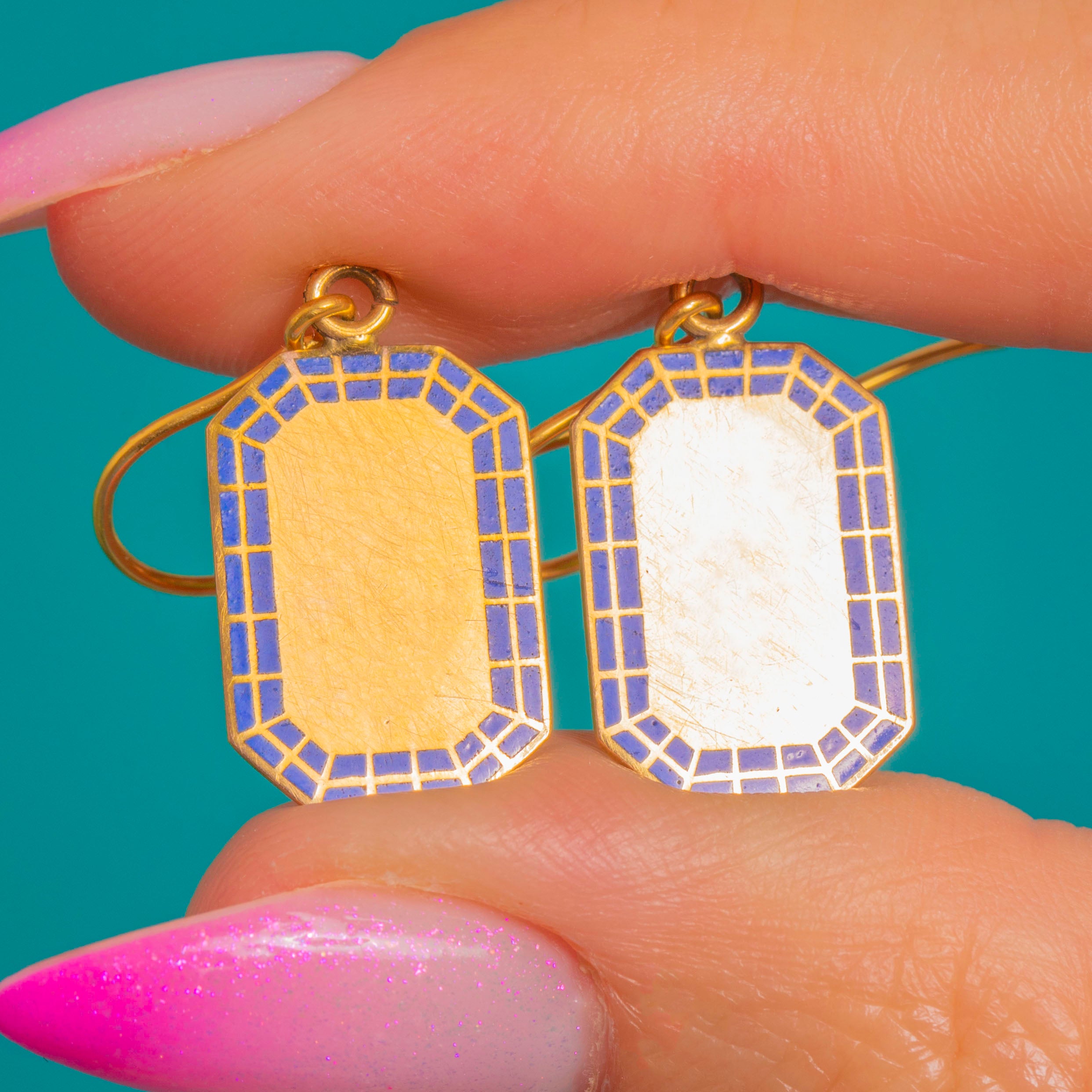 Sleek geometry meets vivid colour in this elegant pair of Art Deco 9ct Gold drop earrings. Each petite plaque is framed by a segmented border of rich cobalt-blue Enamel, drawing the eye to a softly brushed central field for a chic, architectural finish. The clean lines and octagonal-rectangular silhouette feel wonderfully graphic and effortlessly refined.