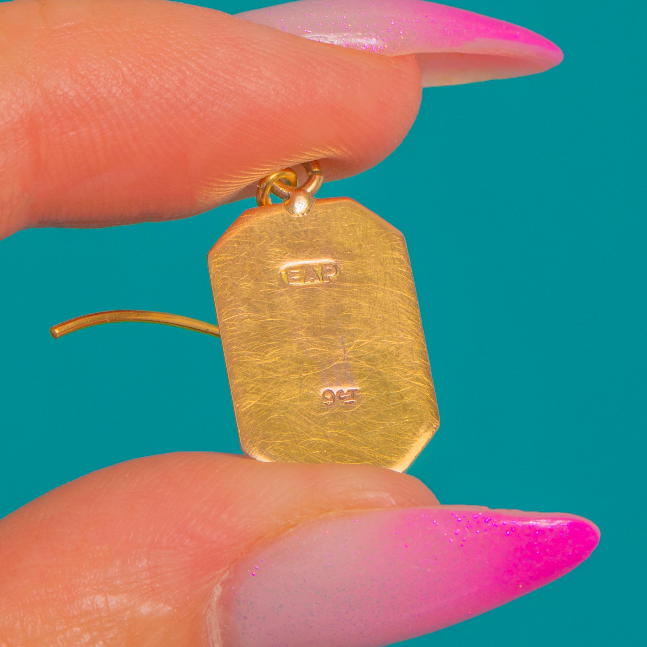 MATERIALS: Tests as 9ct Gold, 9ct Gold hooks, Enamel.