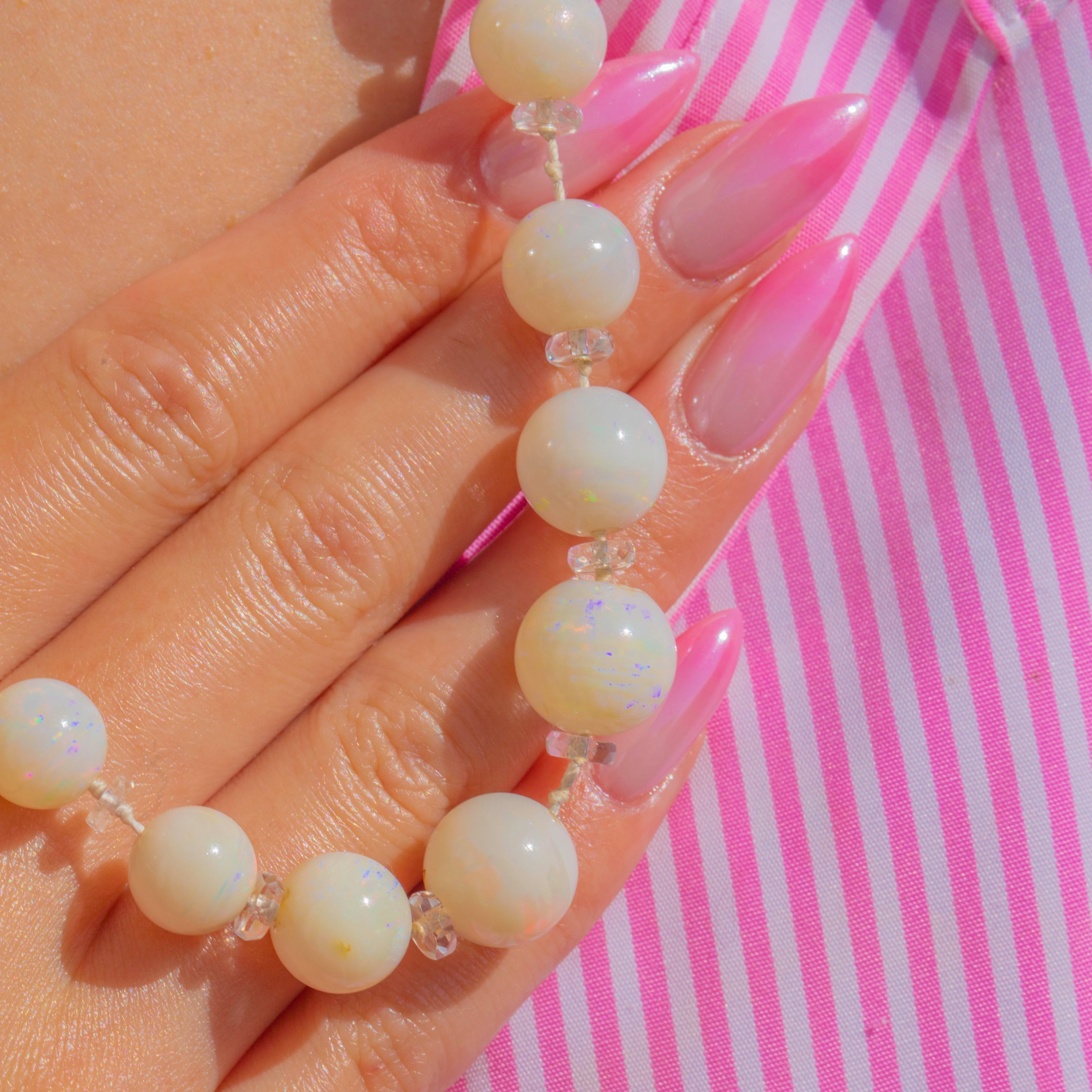 EXCELLENT: The Opal beads present beautifully with attractive iridescence and only light, minor surface wear commensurate with age. Rock Crystal spacers are bright with minimal facet wear, and the hand-knotting is secure. No visible breaks or later alterations noted.